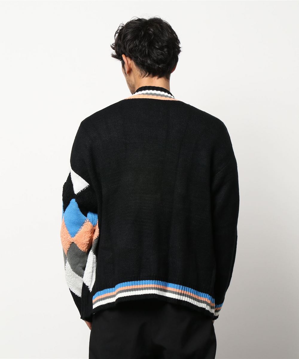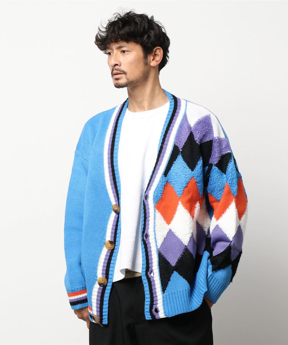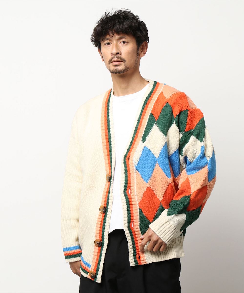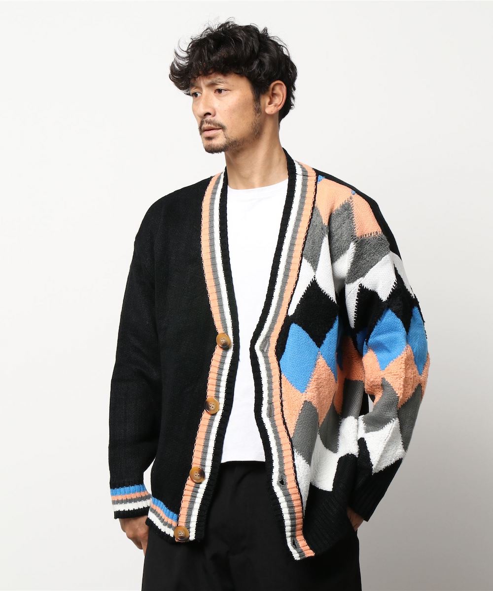 【HOOK】アシンメトリー カラフルなアーガイル幾何学模様リンガーカーディガン/フック(HOOK)