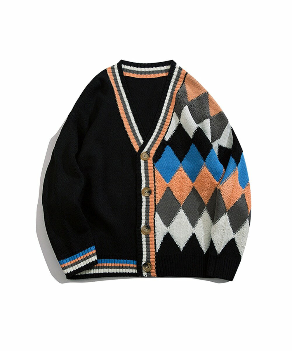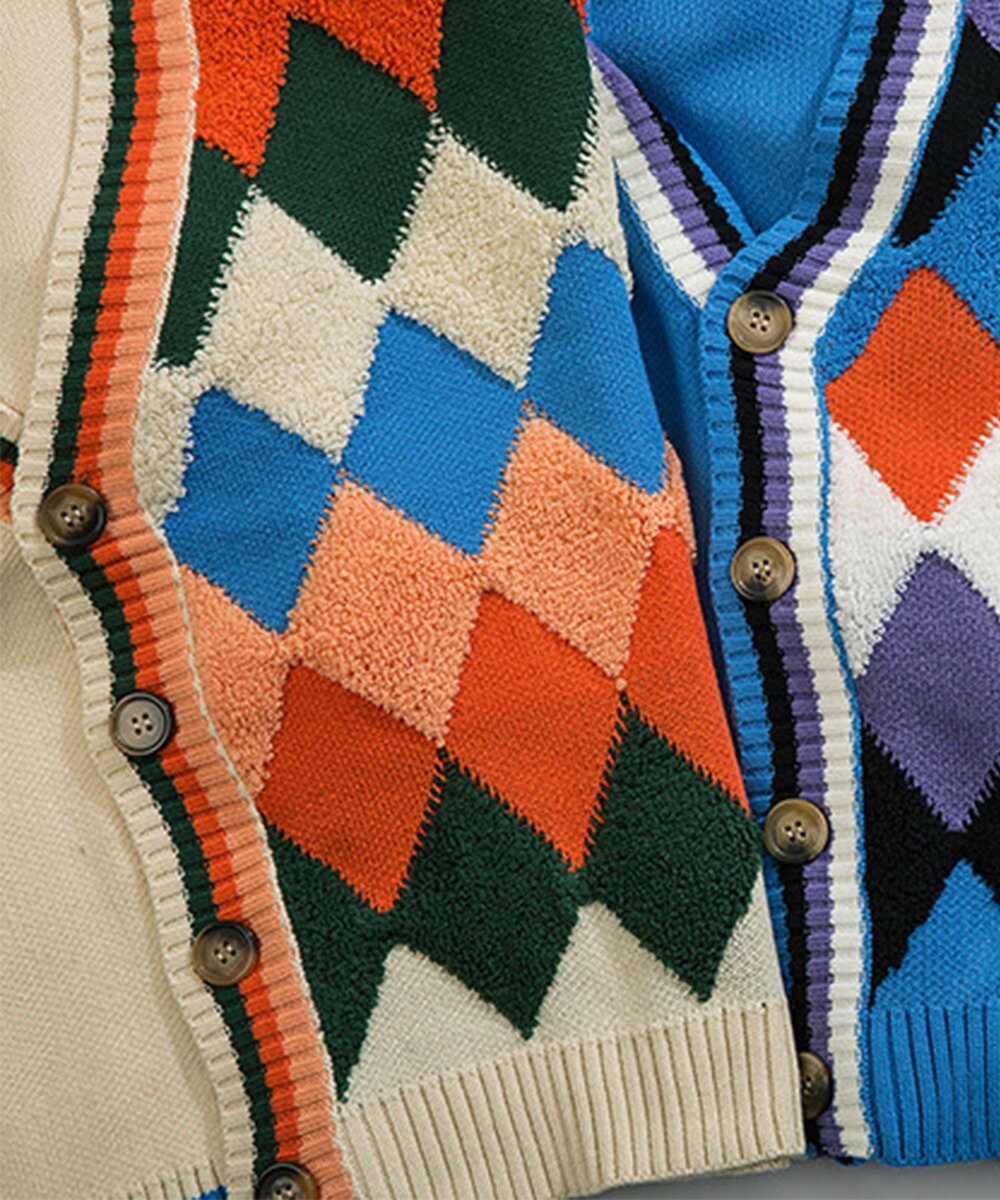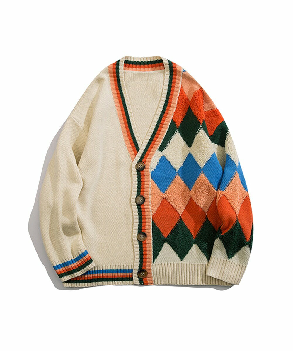 【HOOK】アシンメトリー カラフルなアーガイル幾何学模様リンガーカーディガン/フック(HOOK)