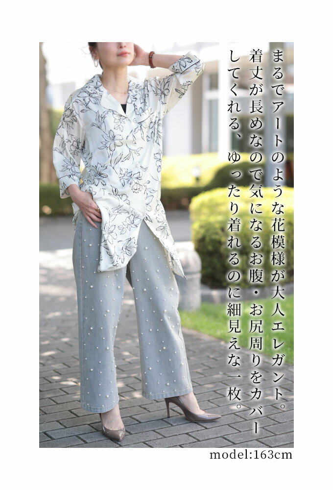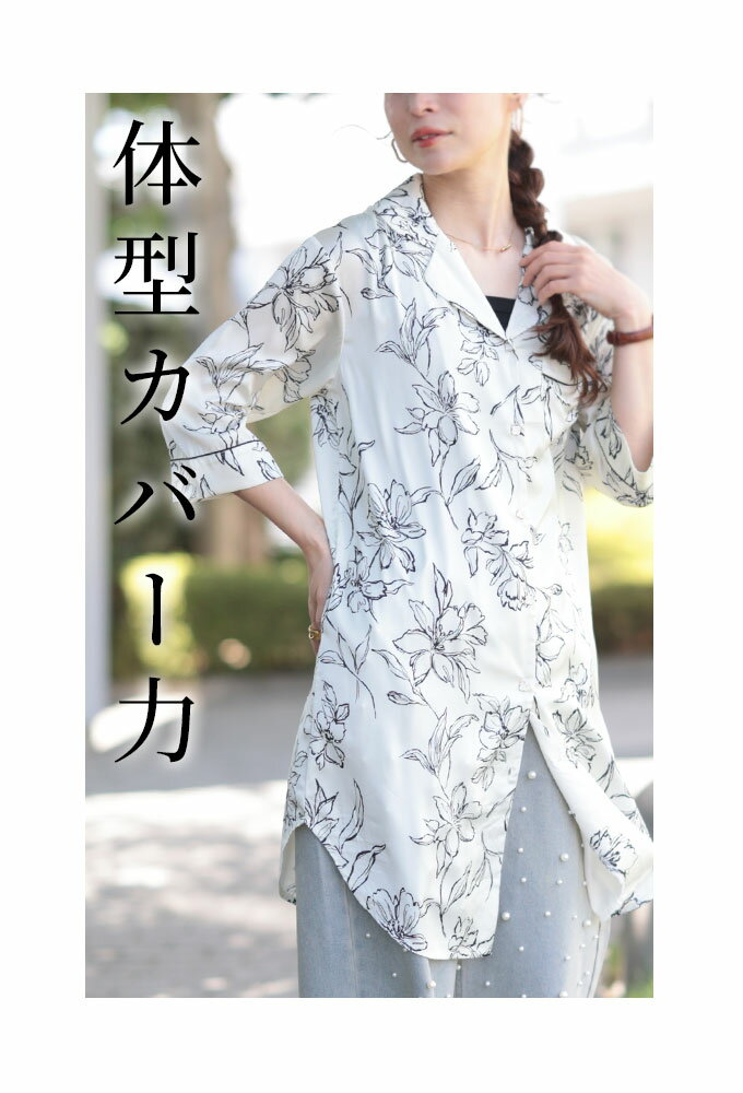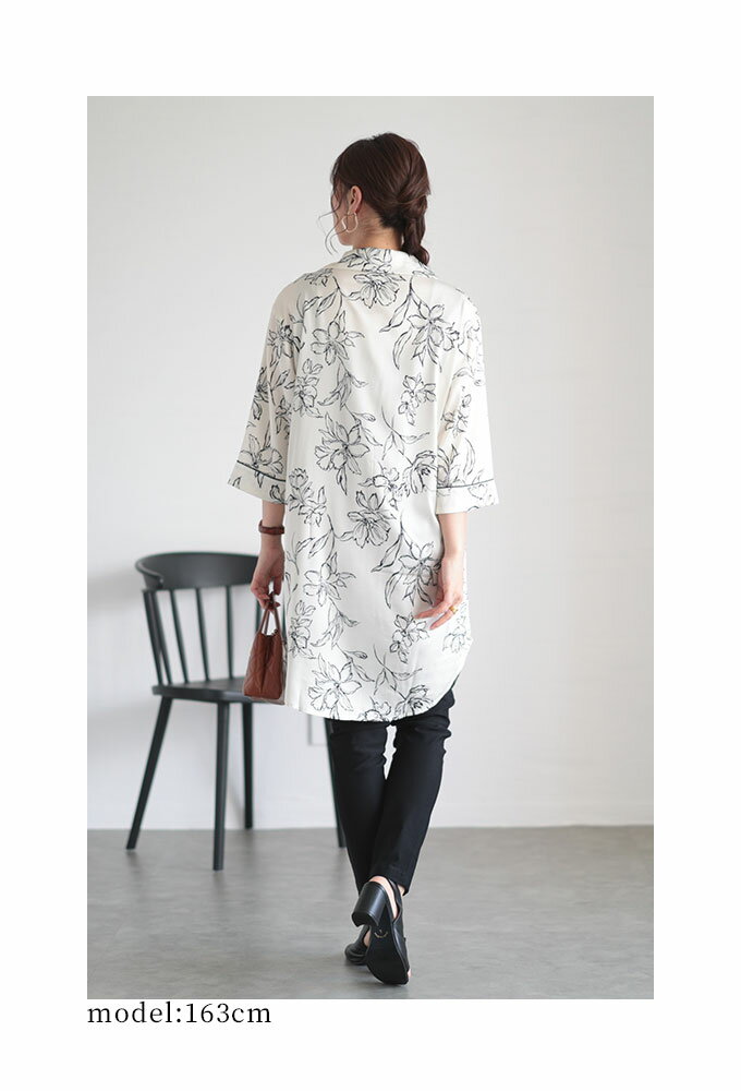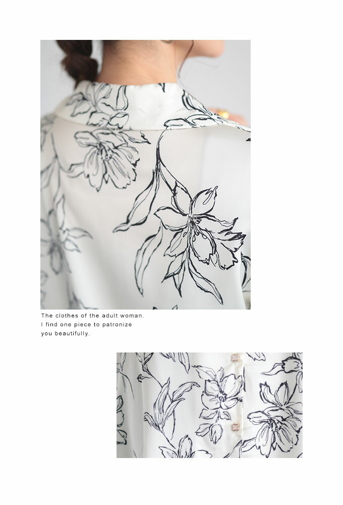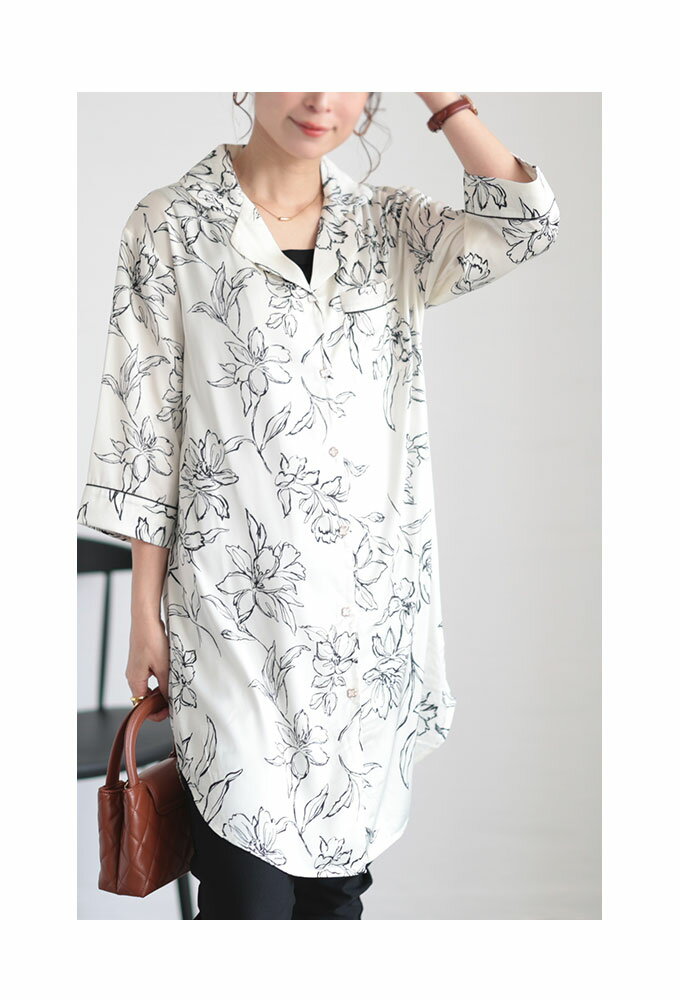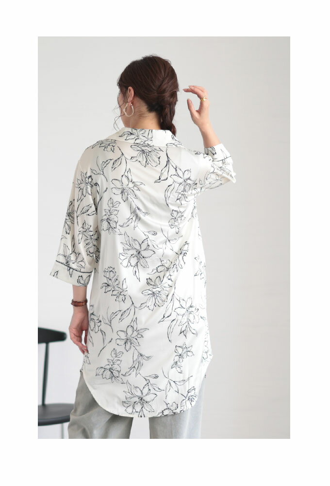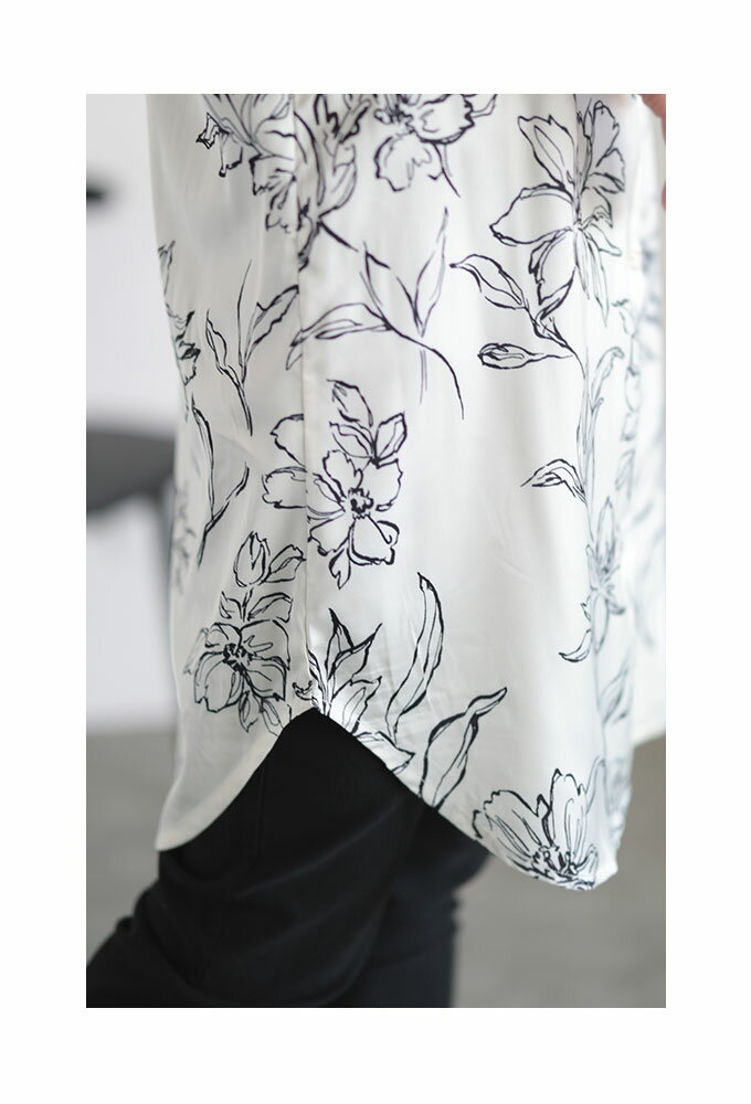 エレガントな花画の高見えシャツチュニック レディース ファッション チュニック トップス シャツ 白 オフホワイト 花柄 大人可愛い 40代 レディースファッション 50代女性 ファッション 60代 ミセスファッション サワアラモード sawaalamode otona