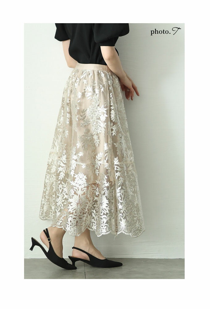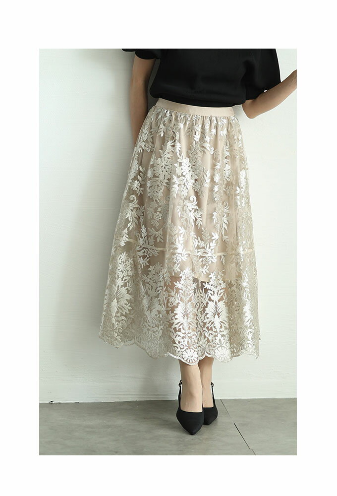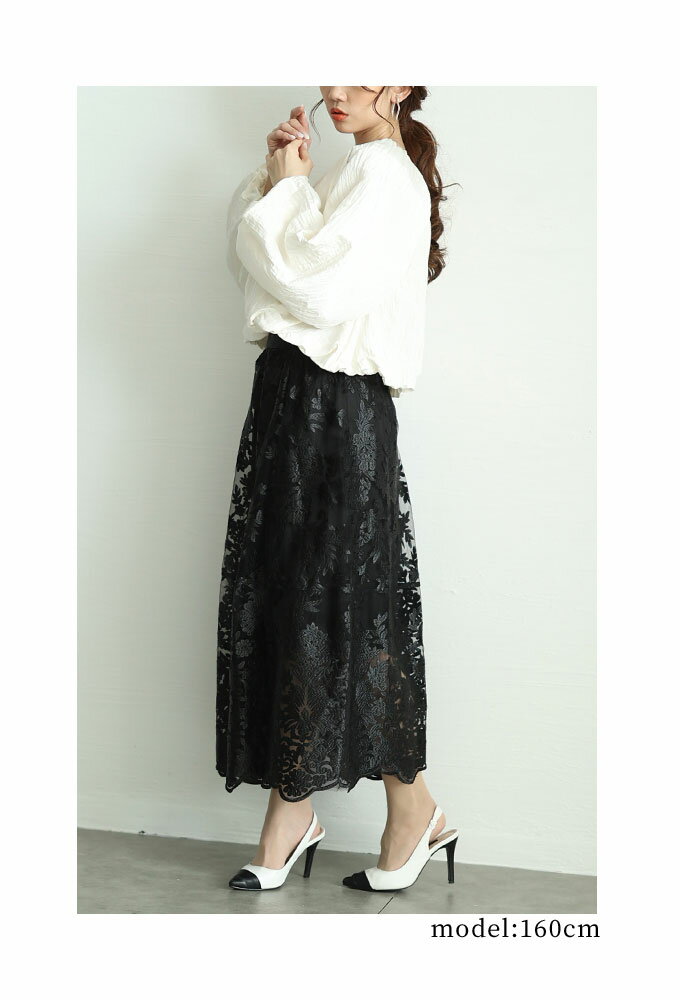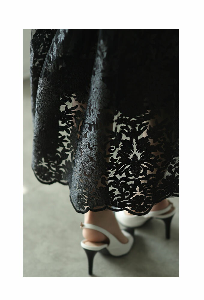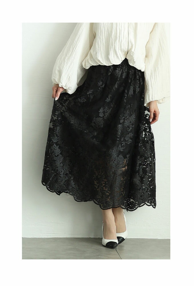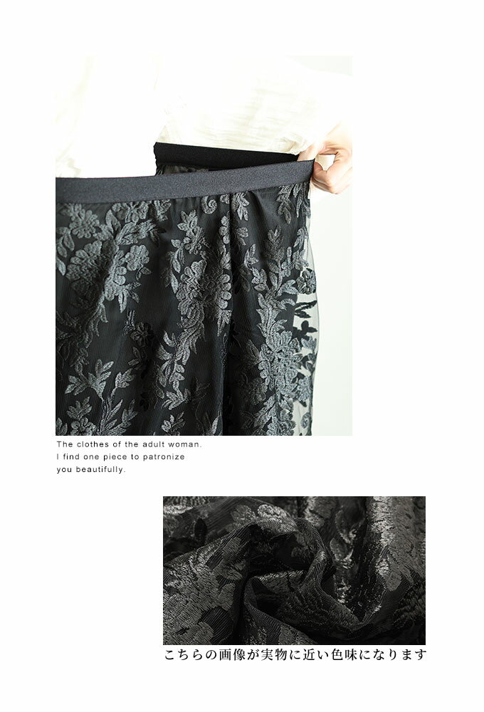 エレガントな柄が浮き立つ刺繍ベールのチュールフレアスカート レディース ファッション ボトムス スカート ブラック 黒 大人可愛い 40代 レディースファッション 50代女性 ファッション 60代 ミセスファッション サワアラモード sawaalamode otona 【3月15日20時販売新作】