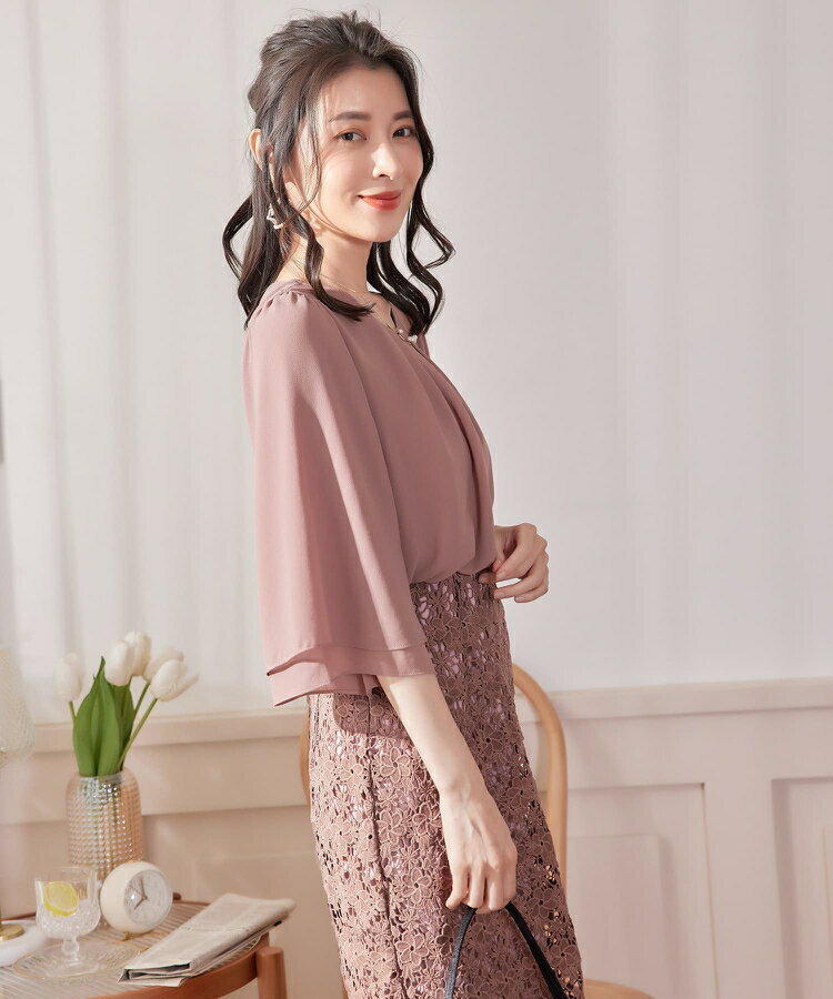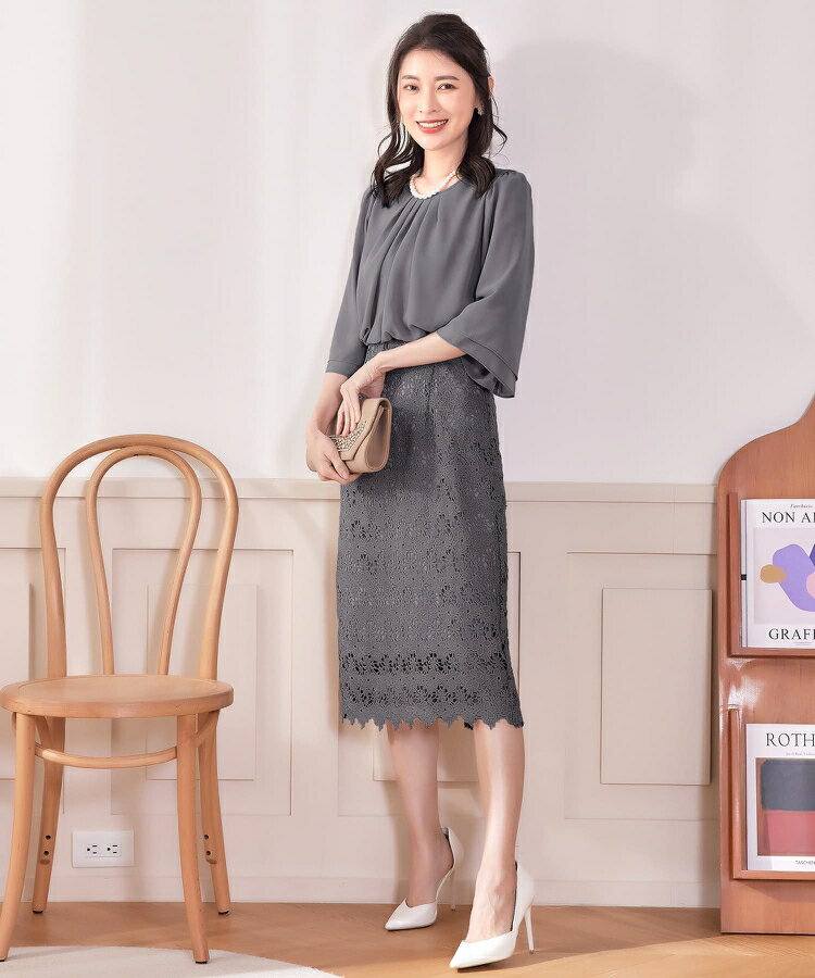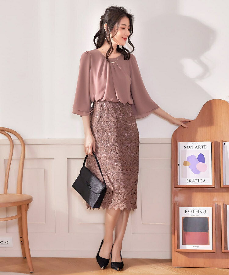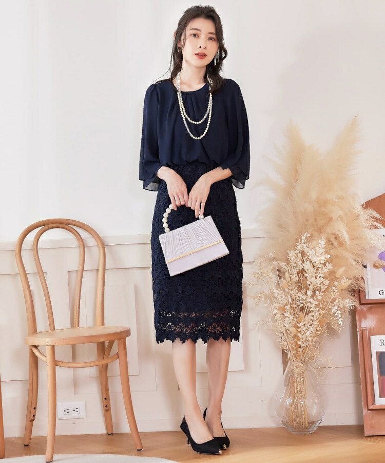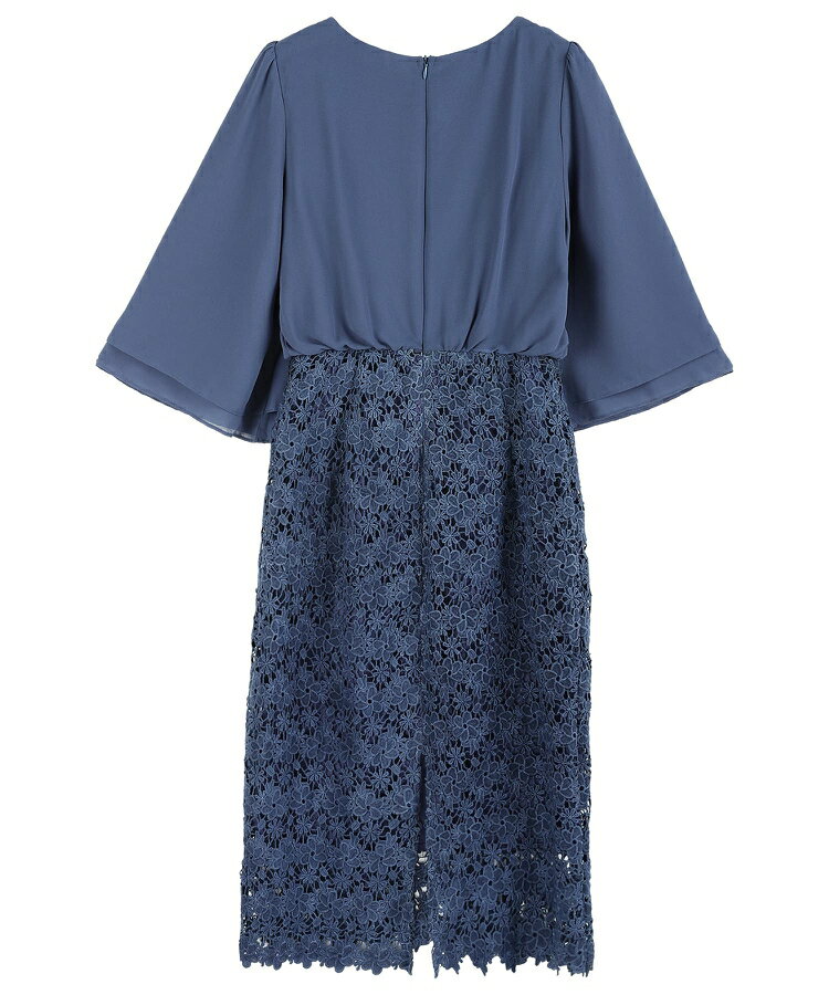 パーティードレス ワンピース 結婚式 披露宴 二次会 オフィス 通勤 七分袖 タイトワンピース ウエスト切り替え 膝丈 ミディ丈 バックファスナー 裏地あり バックスリット スカラップ 花柄レース フェミニン きれいめ cy88538