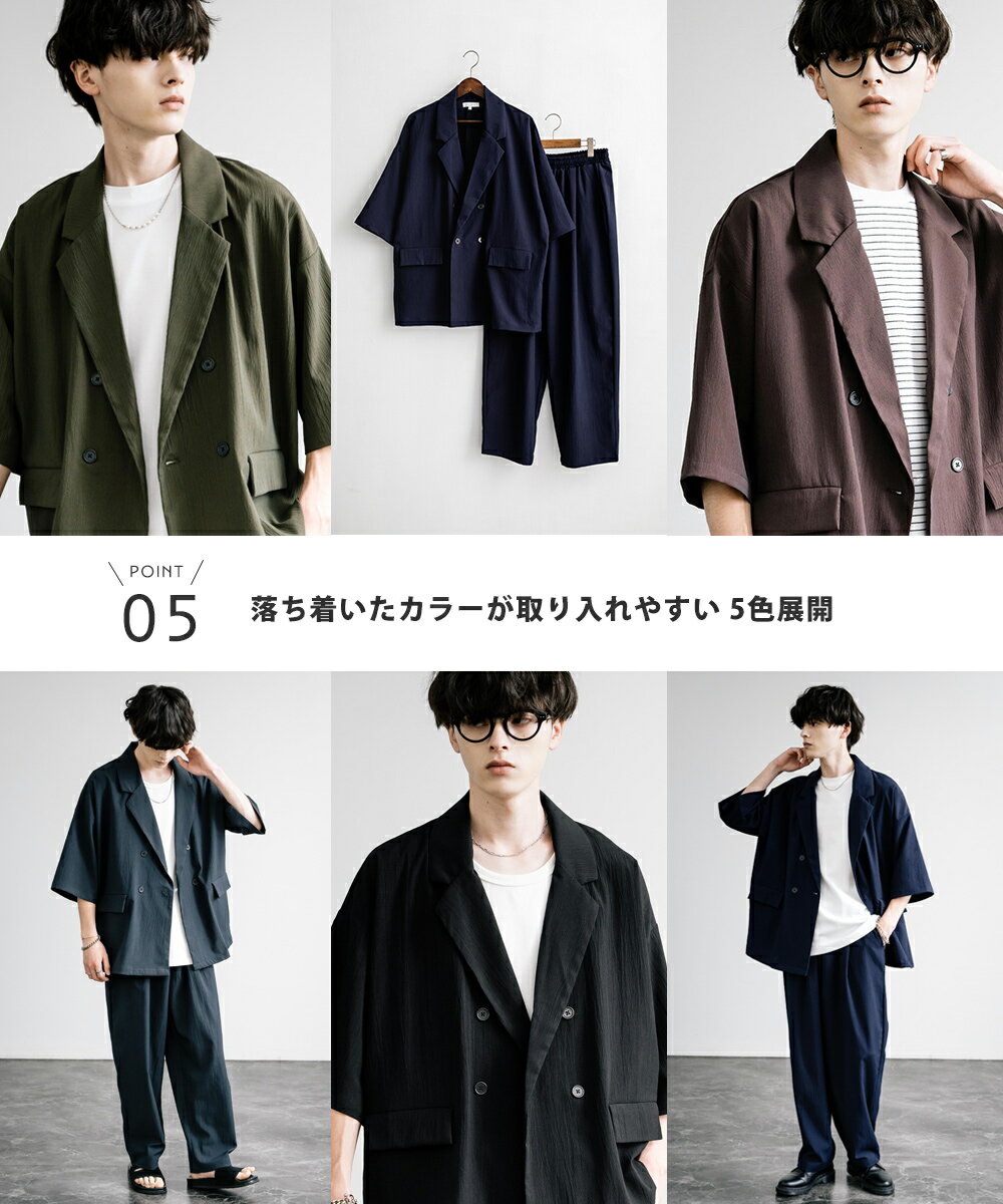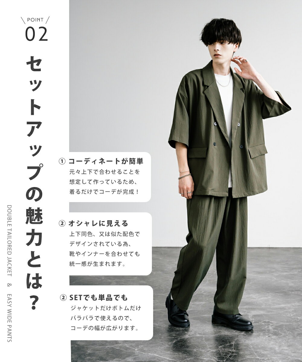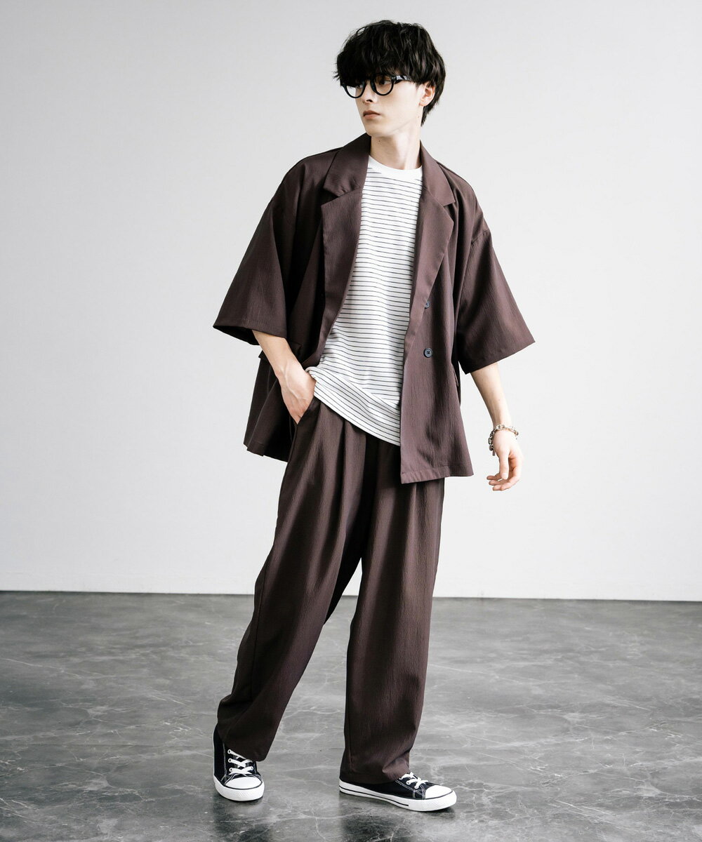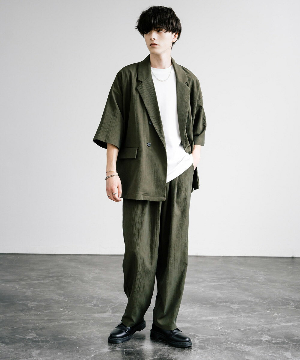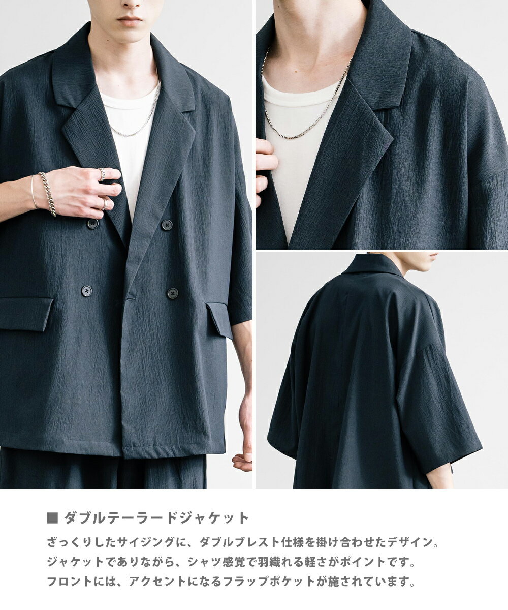 【SALE⇒22%OFF】セットアップ 上下 メンズ ストレッチ ダブルテーラード サマージャケット 半袖 2B ライトアウター スラックス イージー ワイド テーパード オーバーサイズ ビッグシルエット ルーズ リラックス 無地 通気性 涼しい シンプル きれいめ ビジカジ 夏 13539