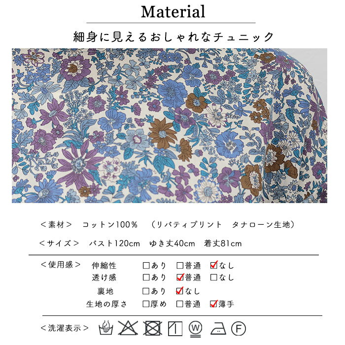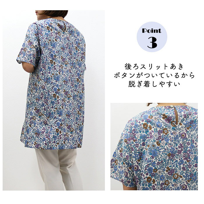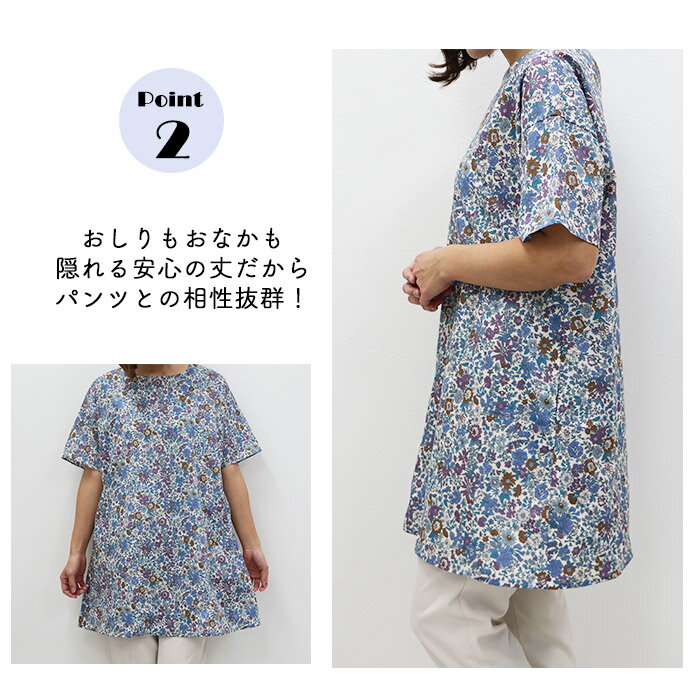 リバティ 半袖チュニック(エミリー)ブルー系 Lサイズ ブラウス チュニック 体型カバー リラックス ポケット付 母の日 プレゼント 国産