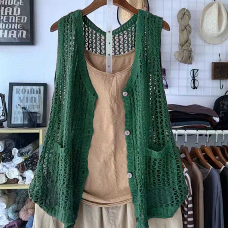 サマーベスト レディース かわいい 春夏 ベスト vネック 春 夏 ベスト ジレ レディース 前開き 薄手 おしゃれ サマー ベスト ゆったり ポケット付き 透かし編み 重ね着 レイヤード トップス カジュアル 可愛い