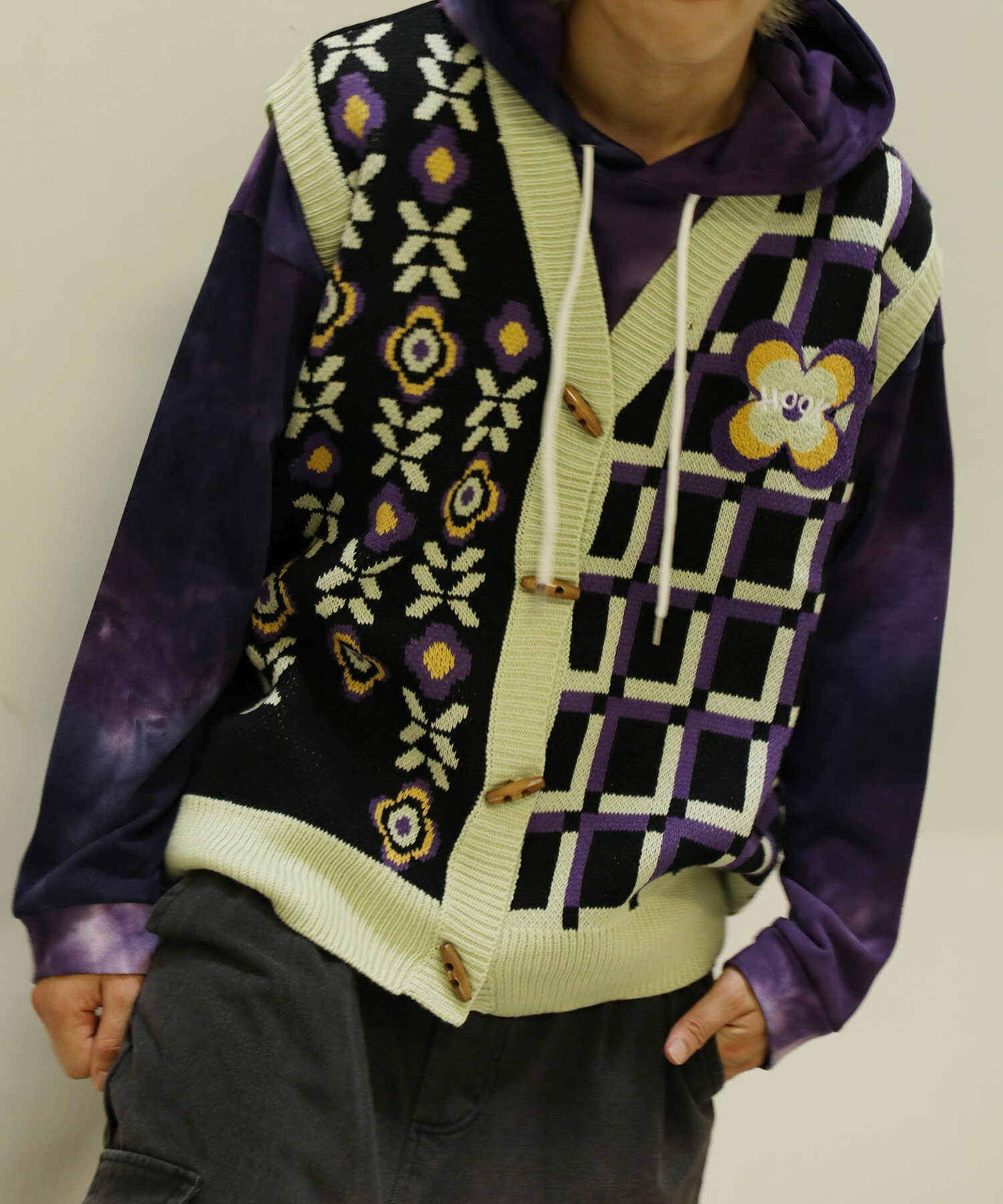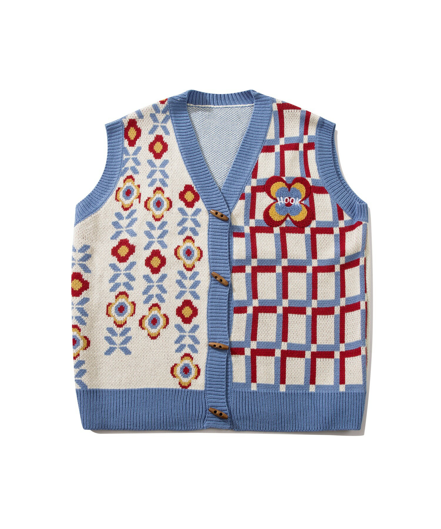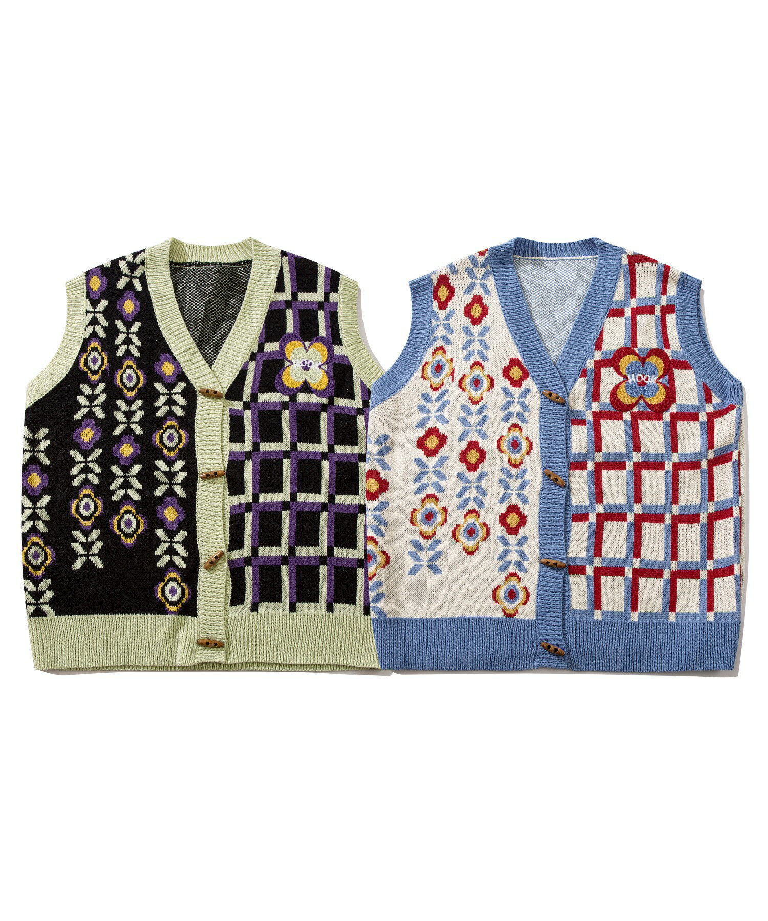 【クーポンで15%OFF 】ベスト メンズ ニット Vネックニット セーター お揃い ビッグシルエット メンズ レディース オーバーサイズ ユニセックス 韓国 ライク アシンメトリー 前開き ペアルック チェック 花 古着 ストリート【HOOK】