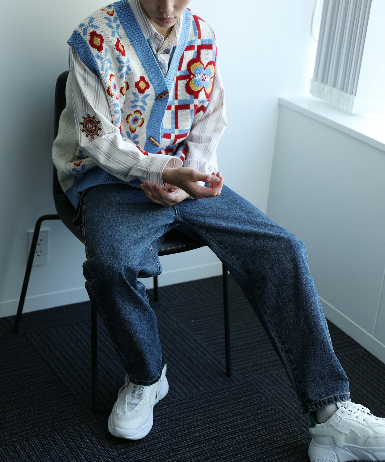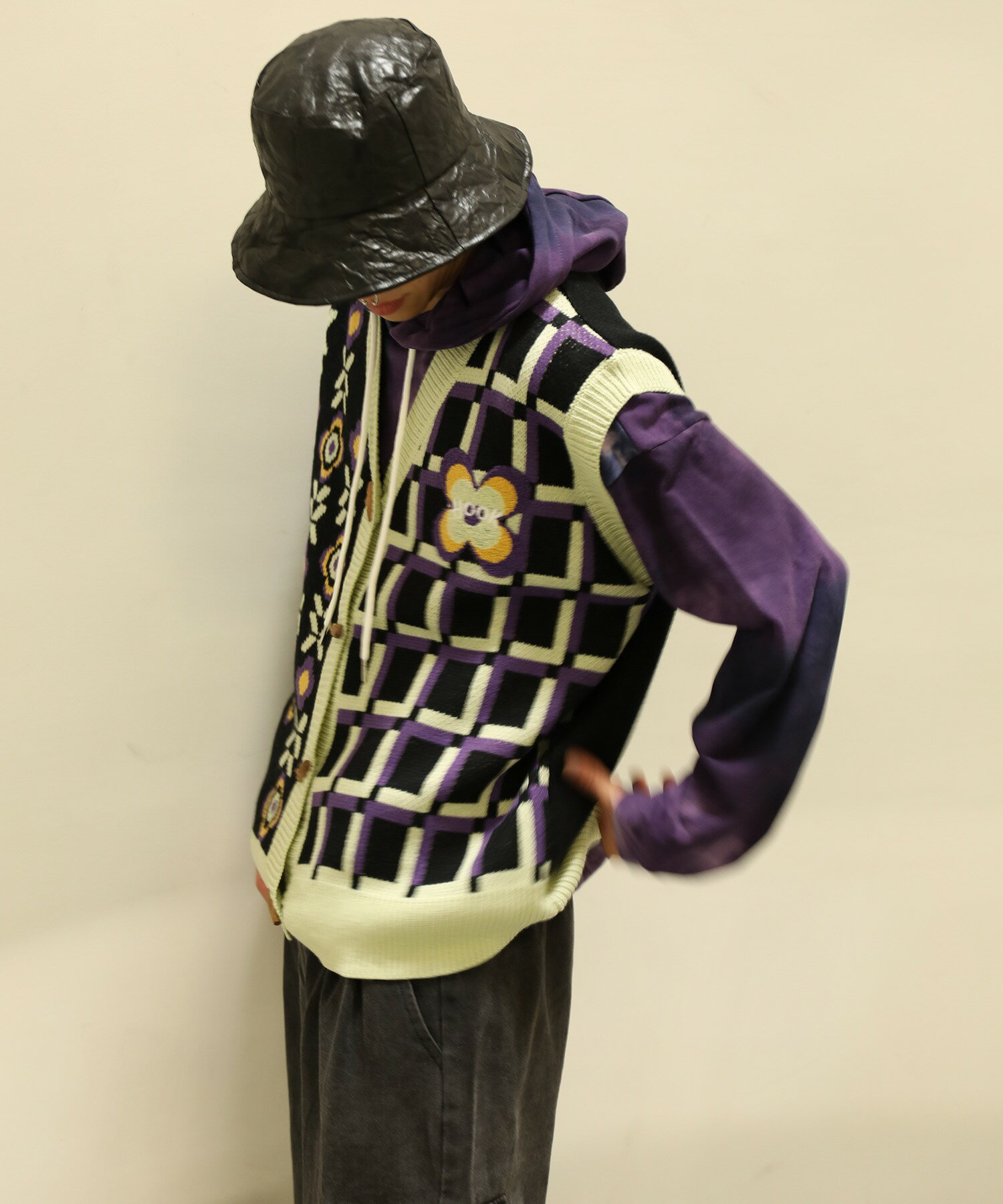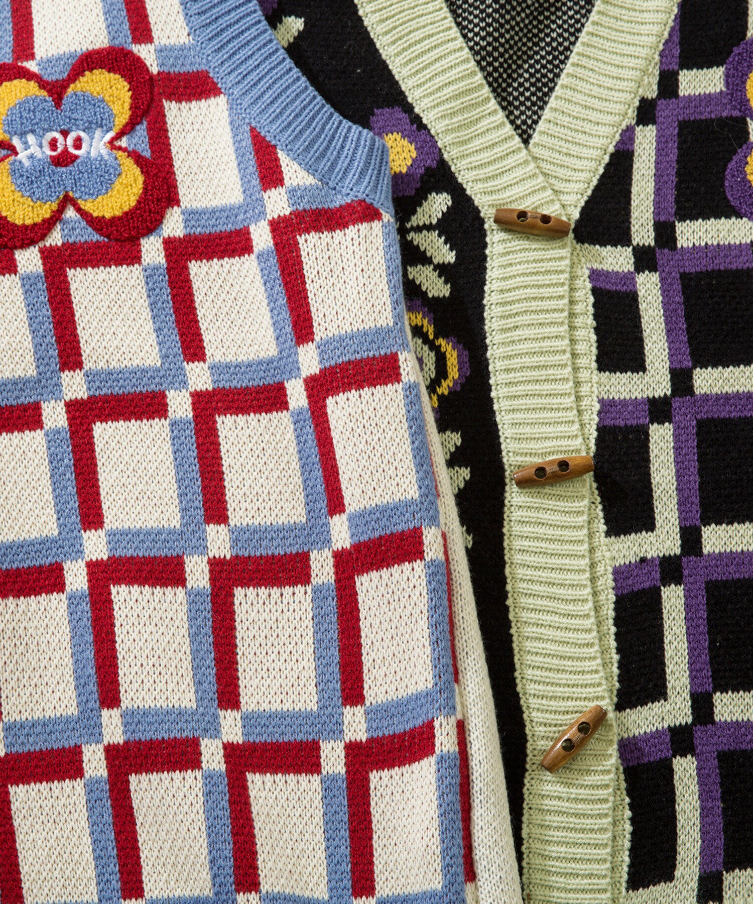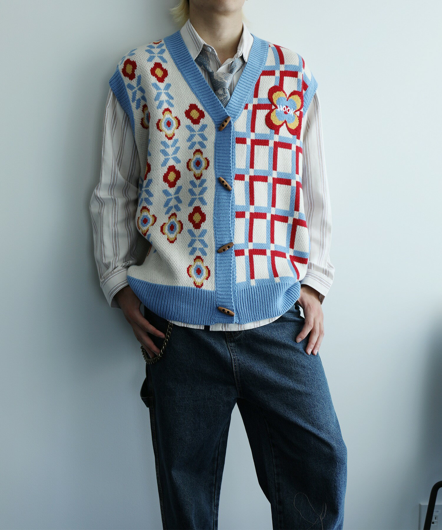 【クーポンで15%OFF 】ベスト メンズ ニット Vネックニット セーター お揃い ビッグシルエット メンズ レディース オーバーサイズ ユニセックス 韓国 ライク アシンメトリー 前開き ペアルック チェック 花 古着 ストリート【HOOK】