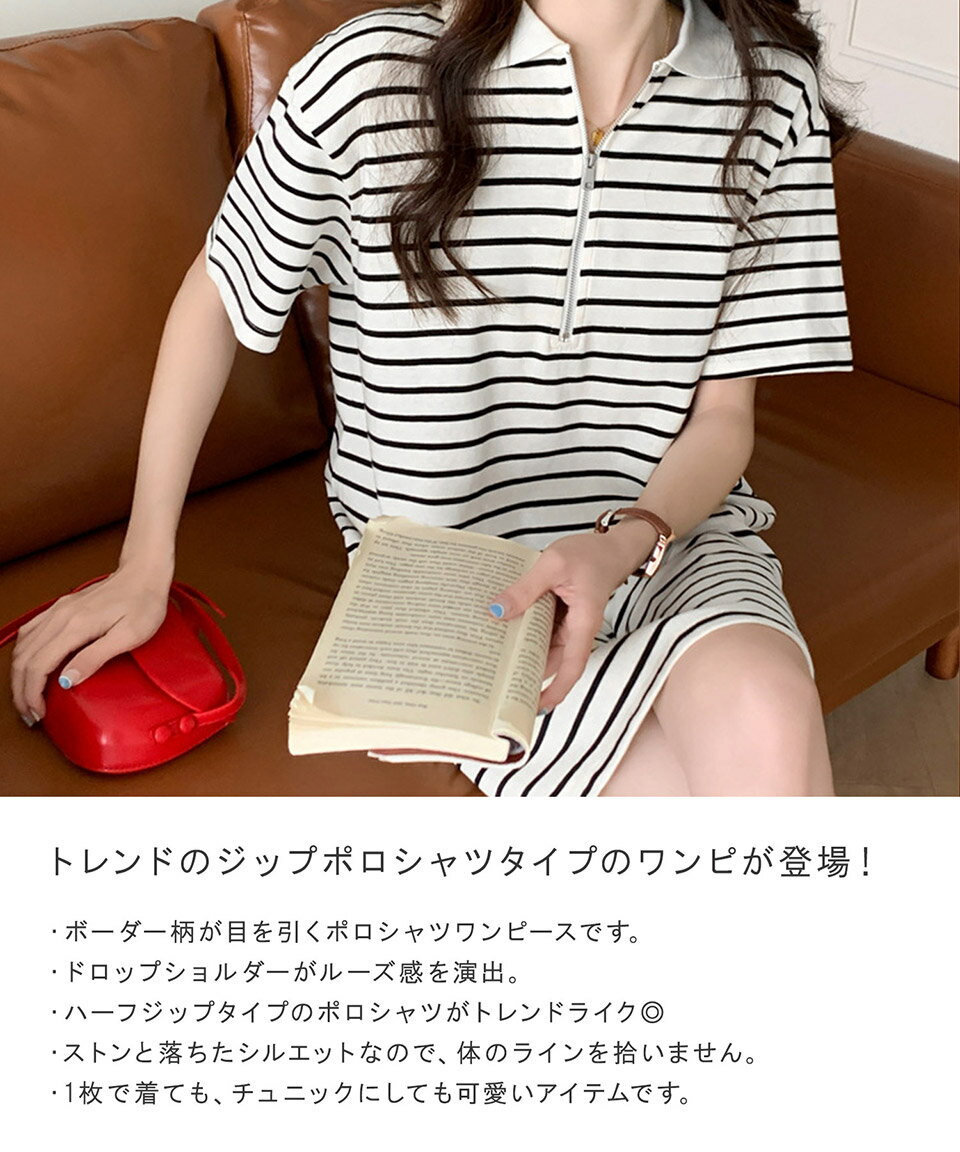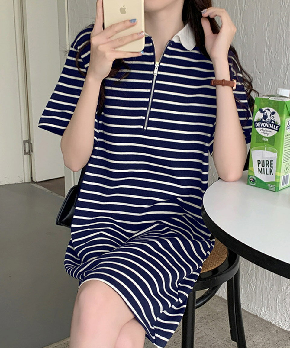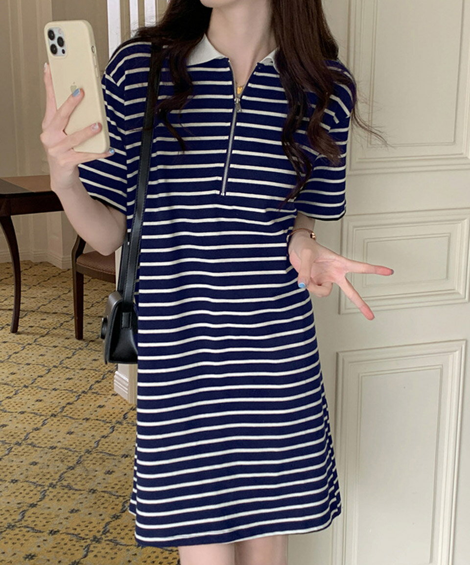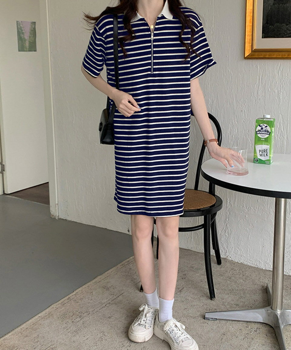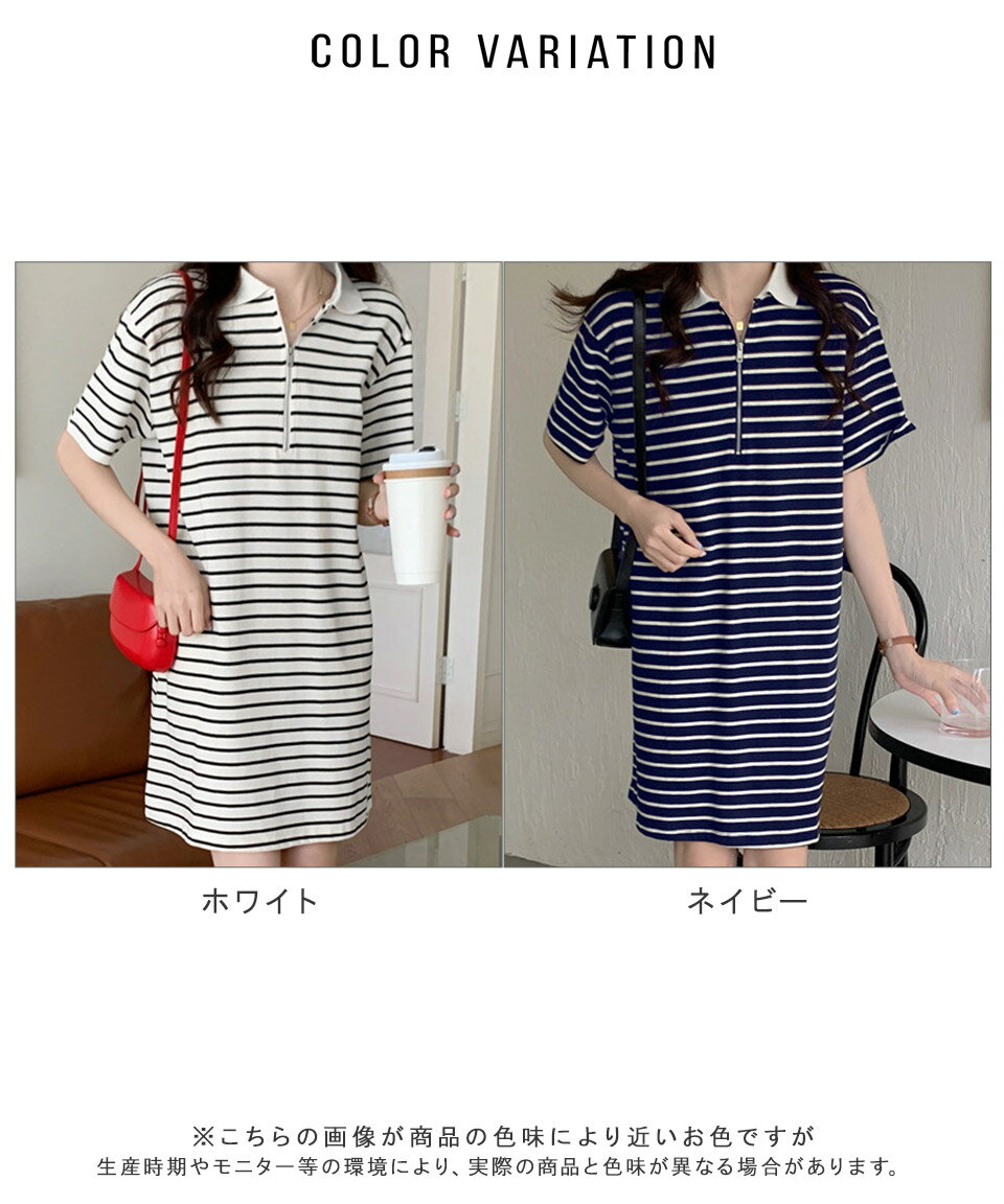 ポロシャツ ボーダー ワンピース ひざ丈 ファスナー レディース 半袖 襟付き 綿 白 紺 ゆったり ボーダー ジップ ポロワンピース