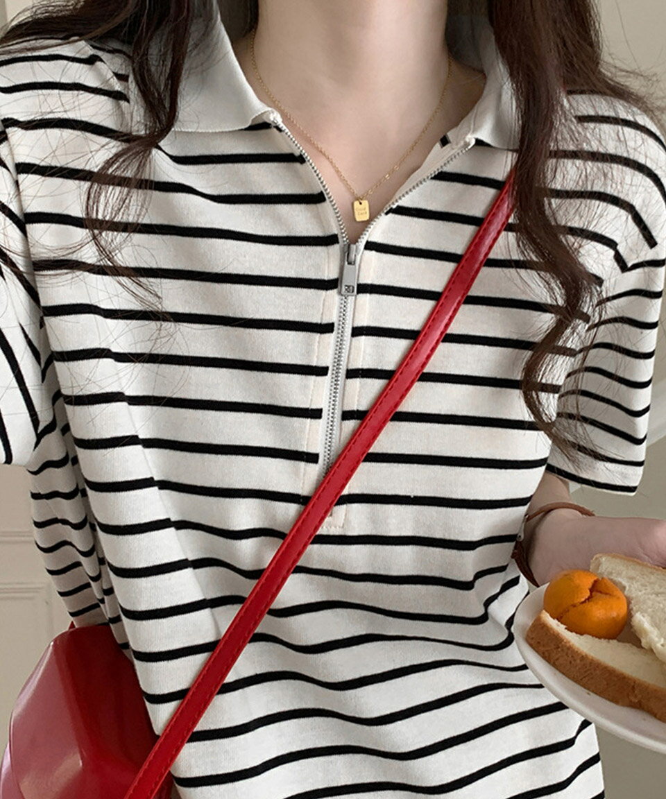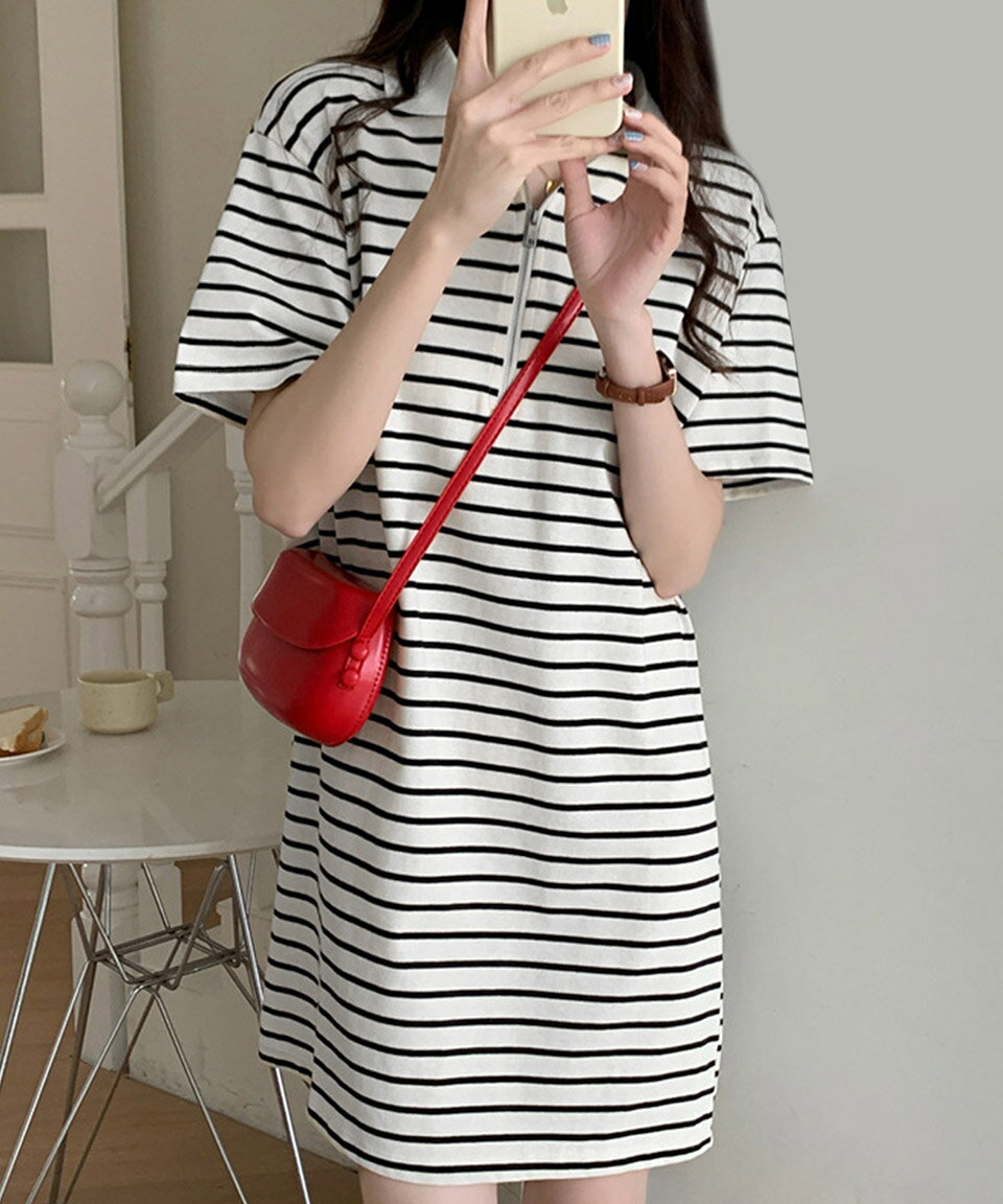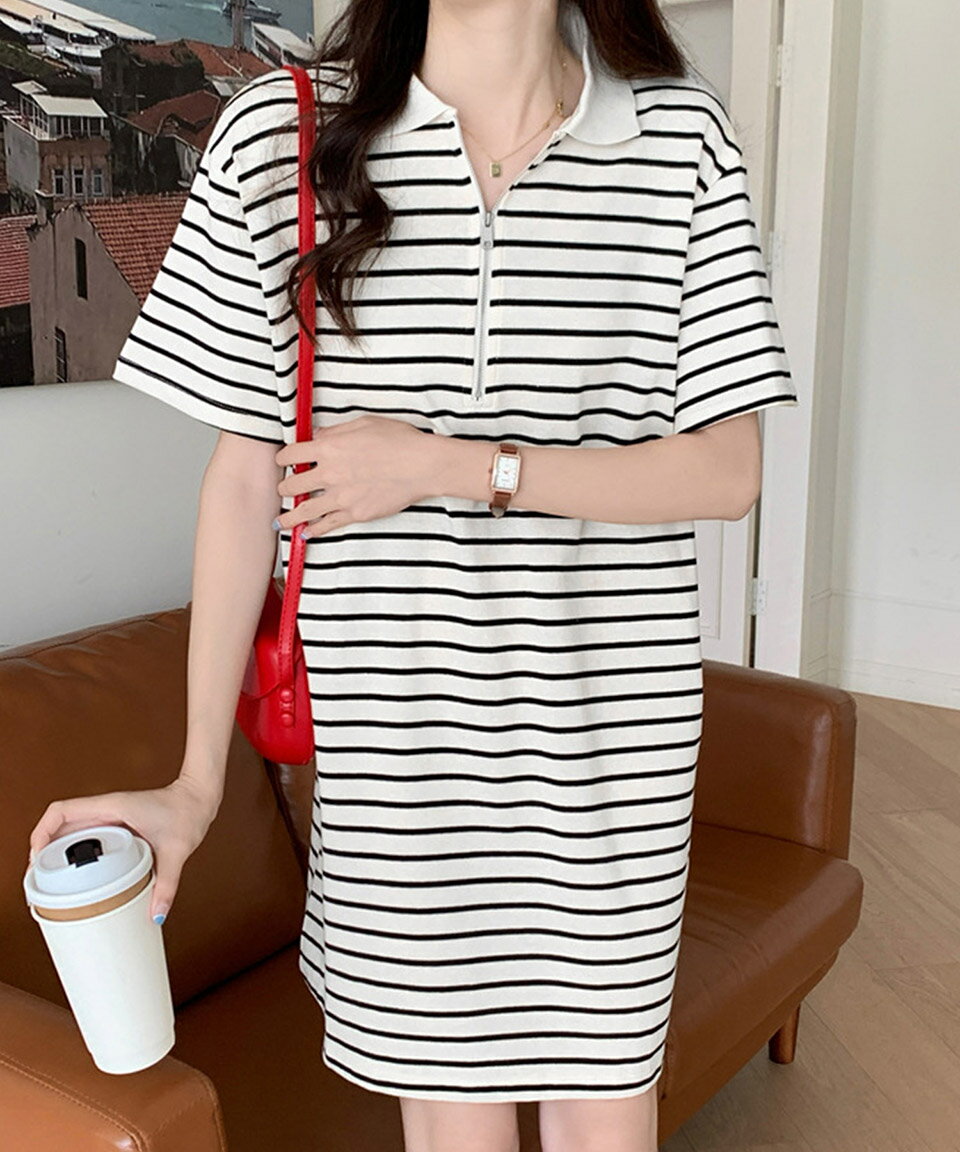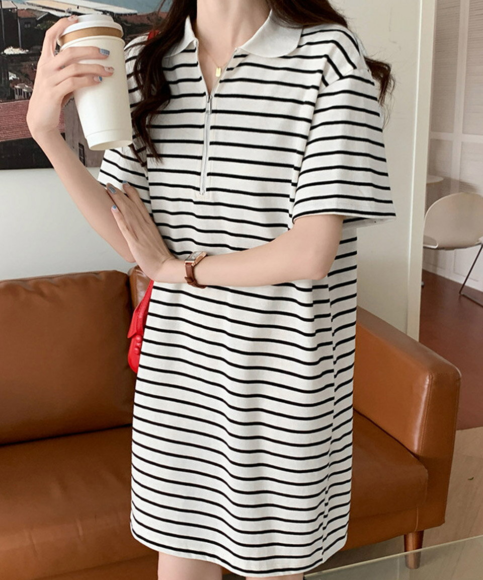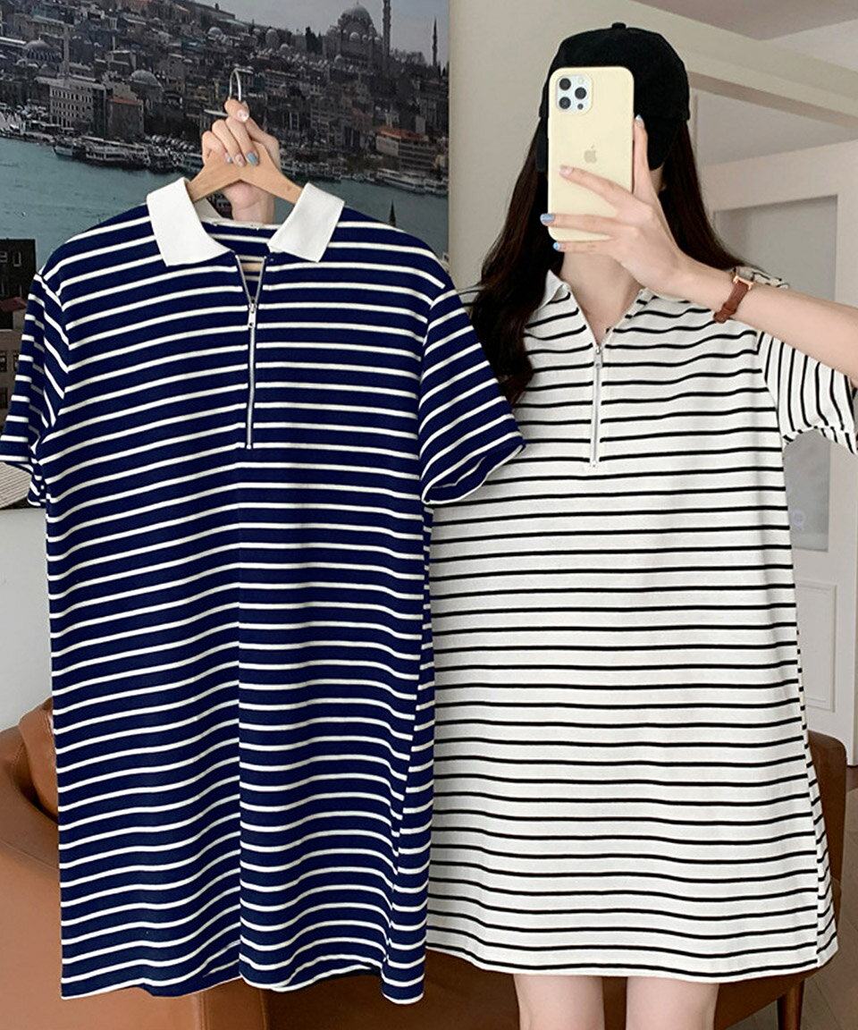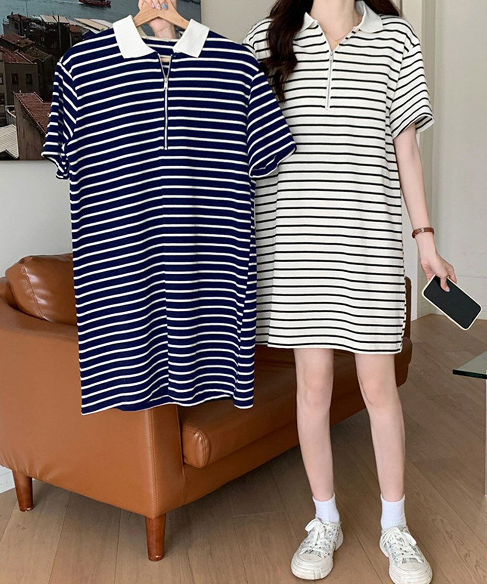 ポロシャツ ボーダー ワンピース ひざ丈 ファスナー レディース 半袖 襟付き 綿 白 紺 ゆったり ボーダー ジップ ポロワンピース