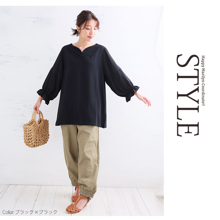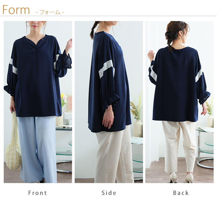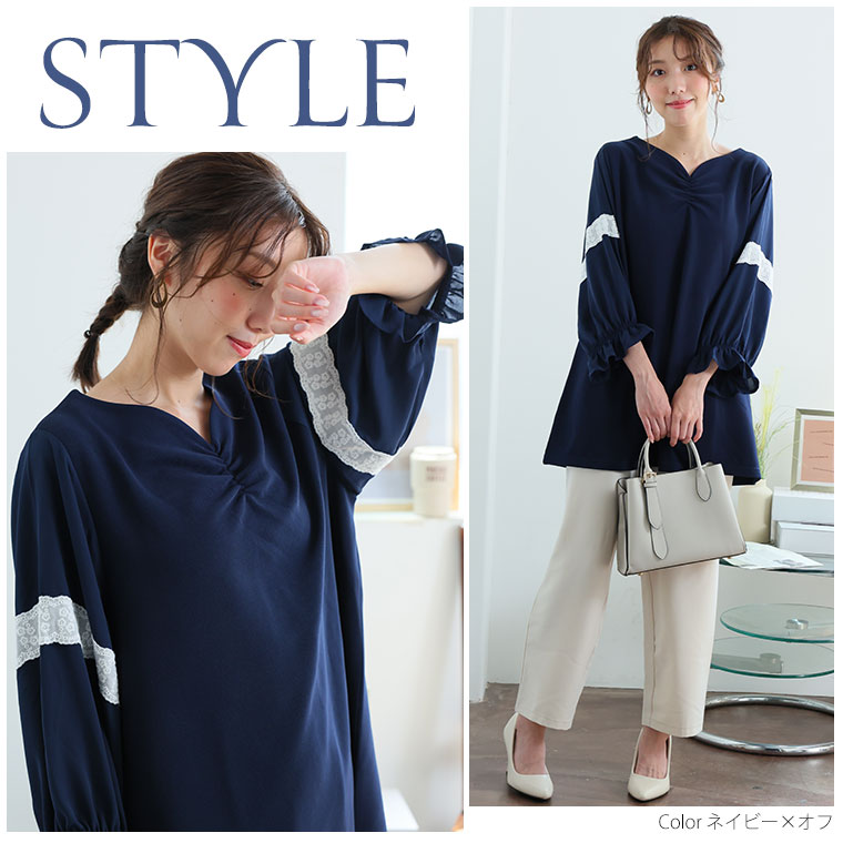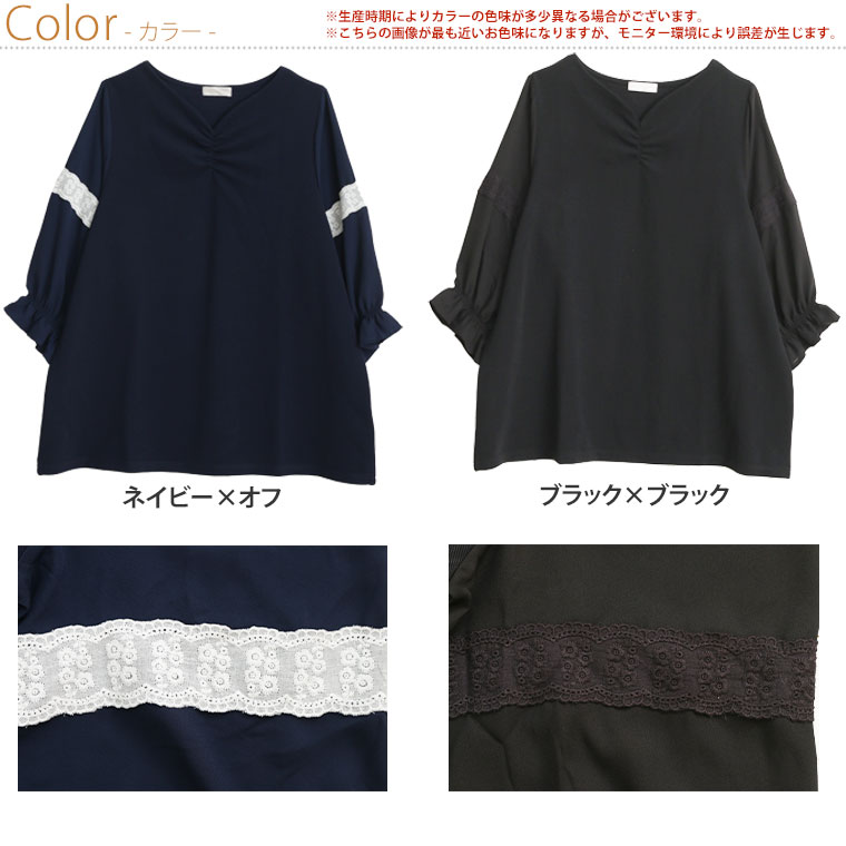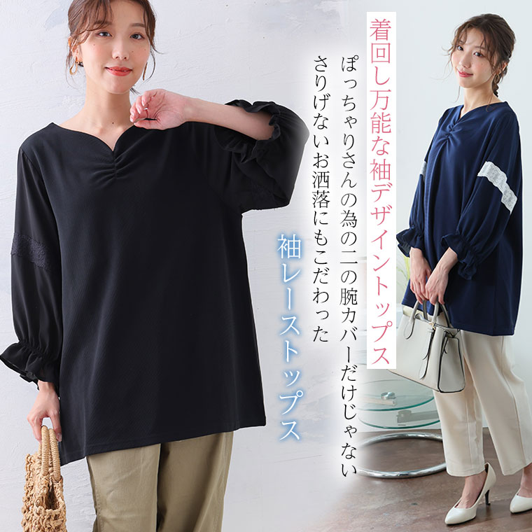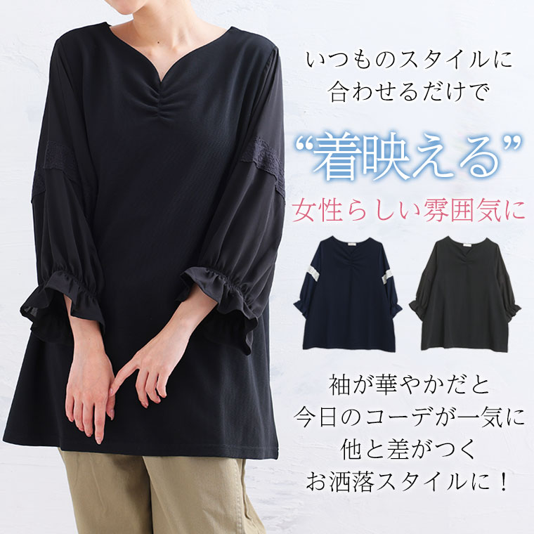 大きいサイズ レディース トップス | 袖シフォン使い チュニック _ トップス チュニック LL 3L 4L 5L 夏 夏物 夏服 秋 秋物 秋冬 異素材使い ぽわん袖 ぽっちゃり ゆったり プラスサイズ かわいい おしゃれ カジュアル ナチュラル [5546021]