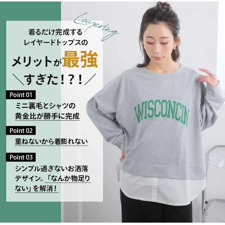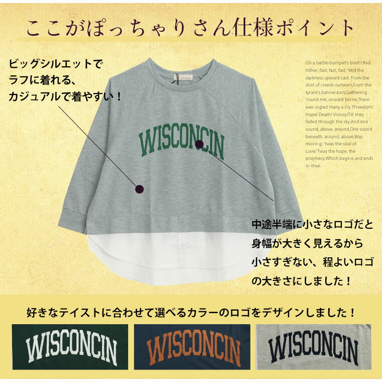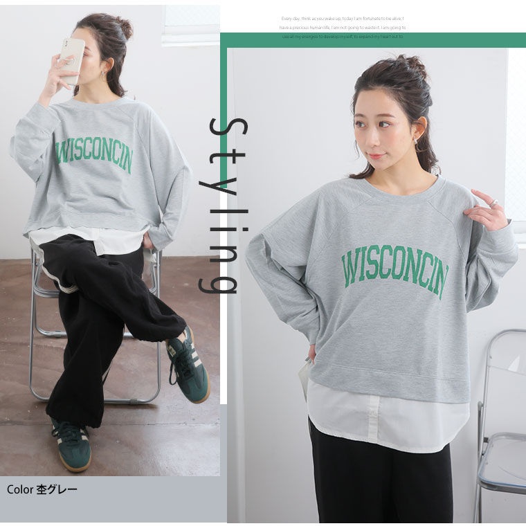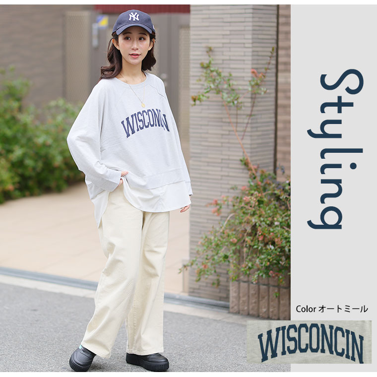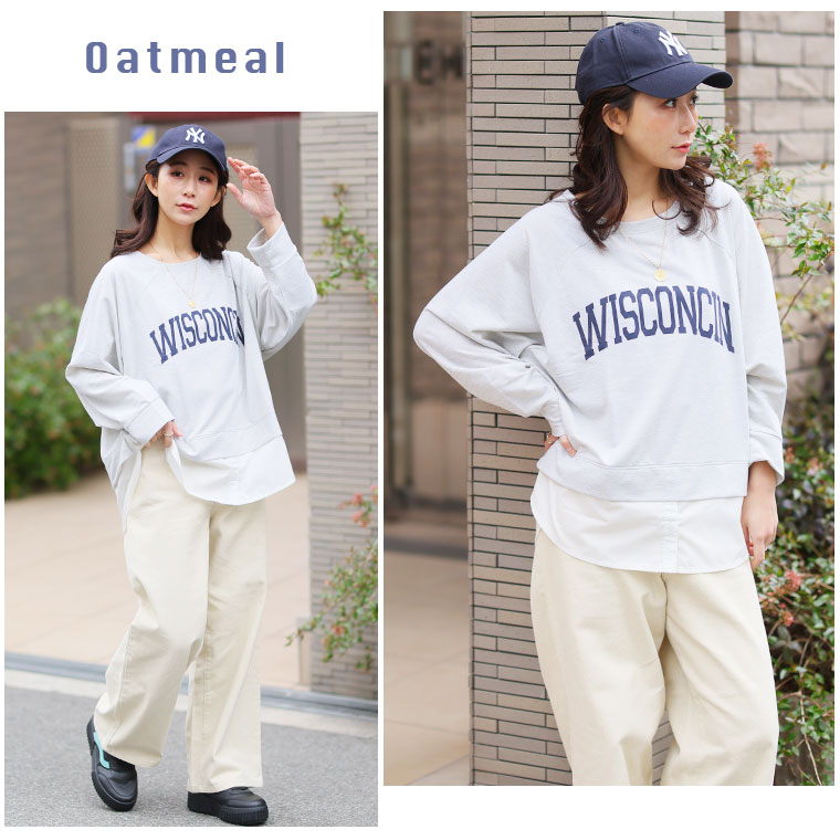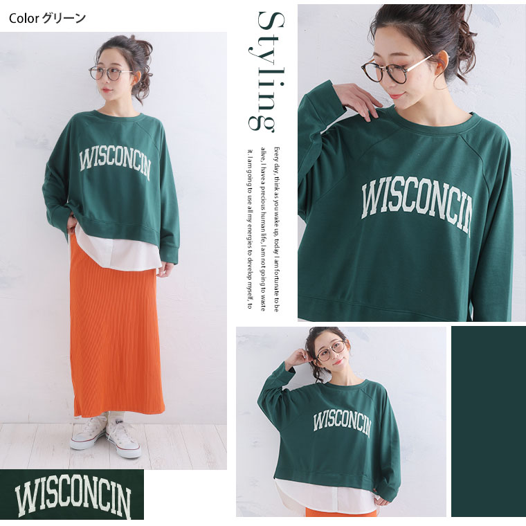 大きいサイズ レディース トップス | カレッジロゴ レイヤード風デザイン ロンT _ カットソー プルオーバー LL 3L 4L 5L 6L 長袖 春 春物 春服 夏 夏物 夏服 ぽっちゃり ゆったり プラスサイズ 裾見せ ドッキング ミニ裏毛 [15218]
