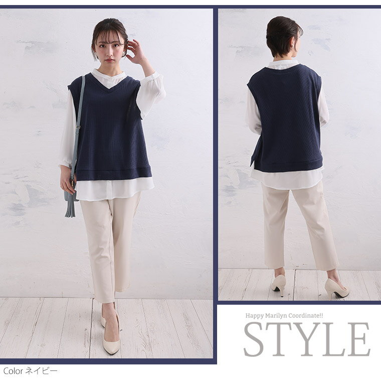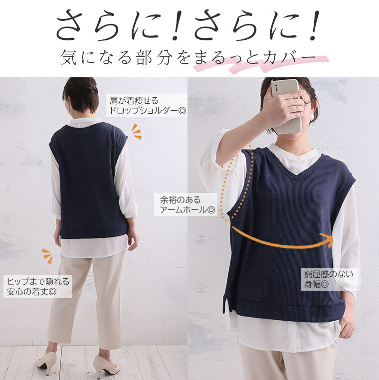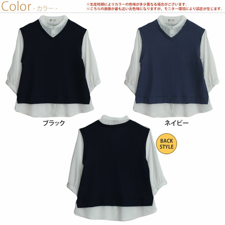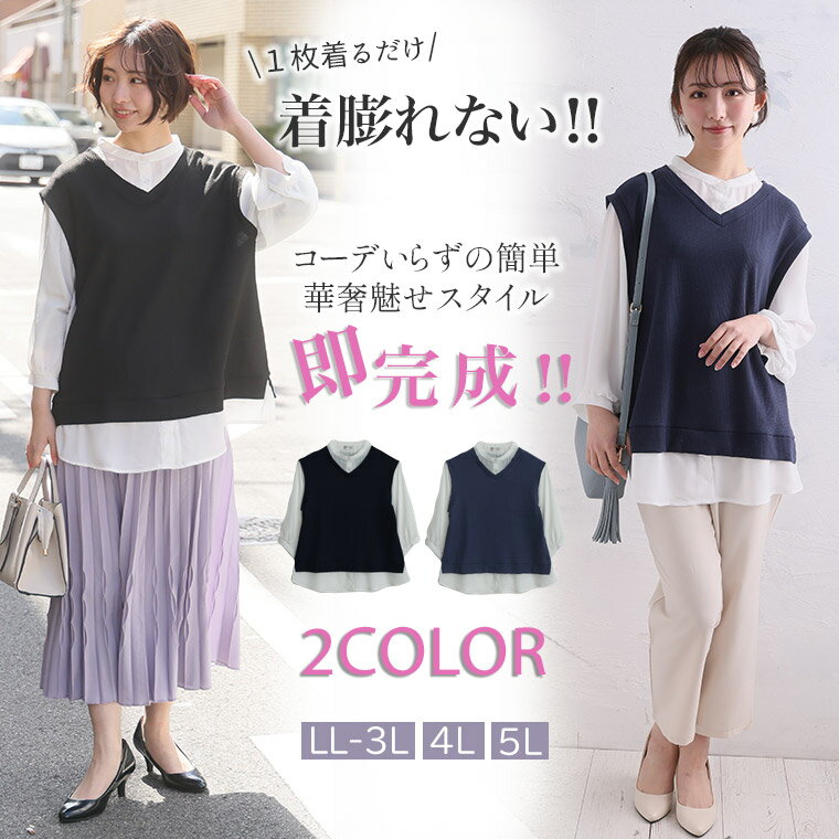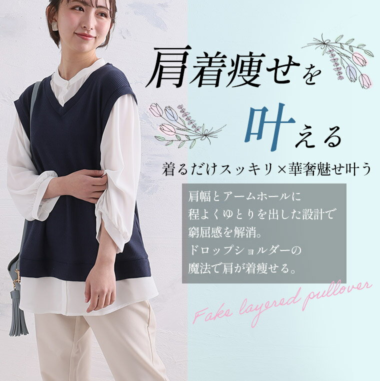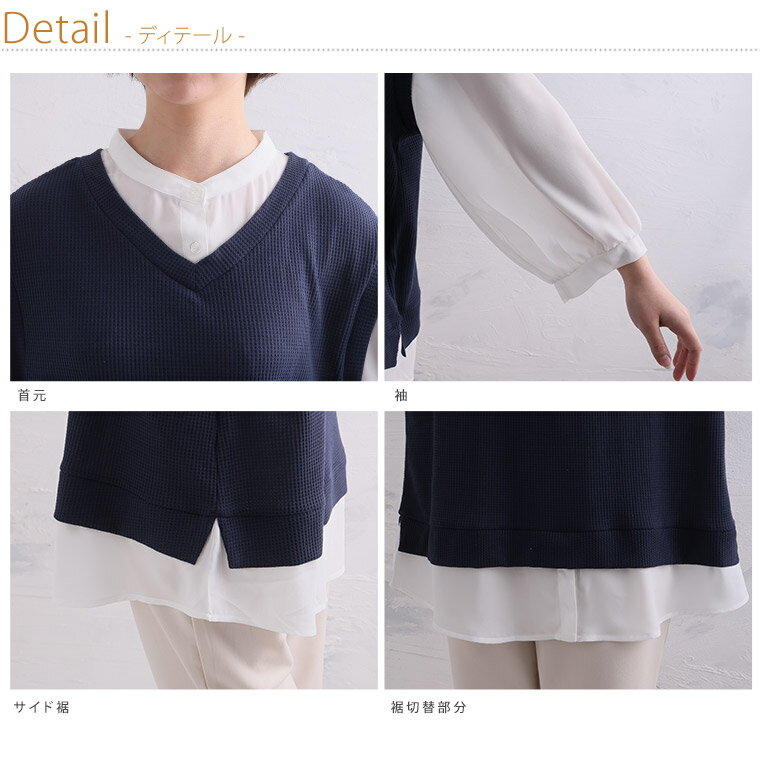 大きいサイズ レディース チュニック | 七分袖 シフォン使い ワッフル チュニック _ トップス LL 3L 4L 5L 七分袖 春 春物 春服 夏 夏物 夏服 ぽっちゃり ゆったり プラスサイズ かわいい おしゃれ ドッキング レイヤード風 [5552030]