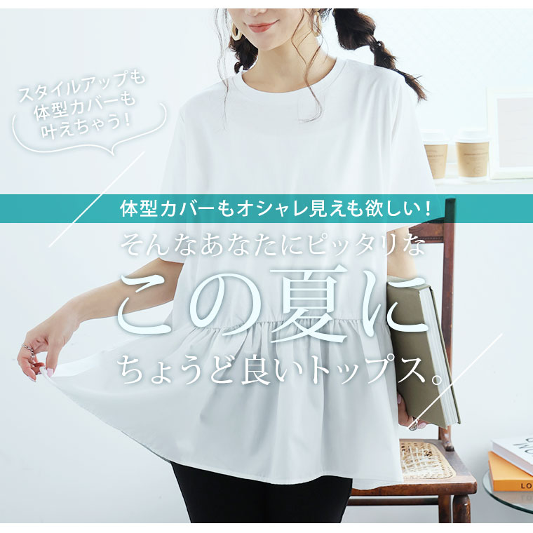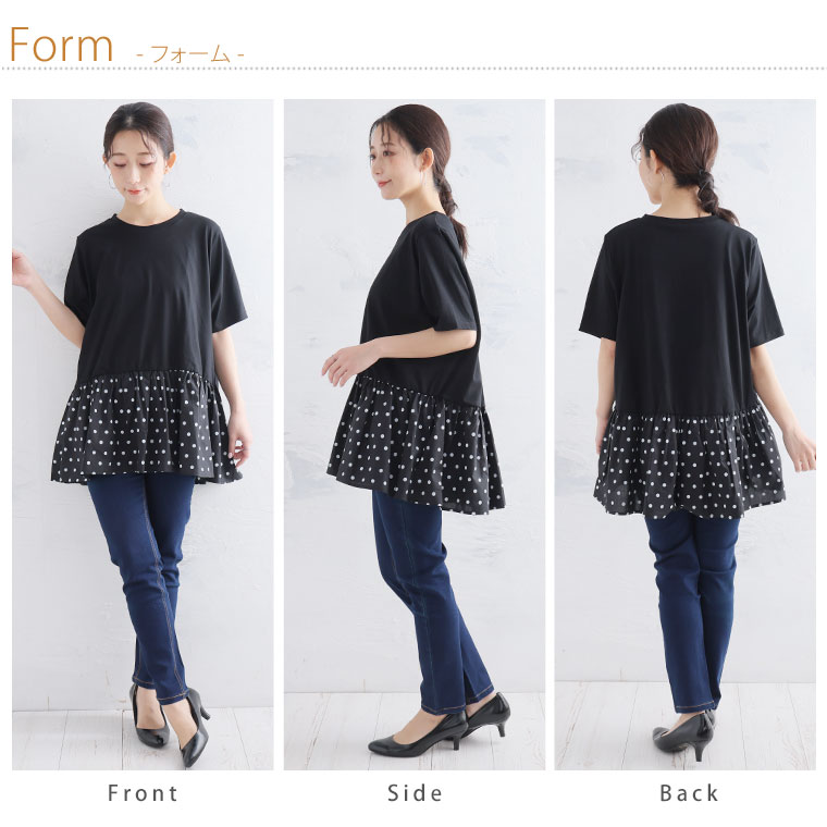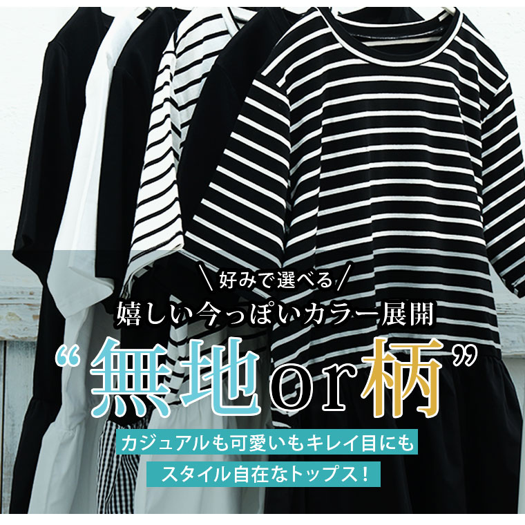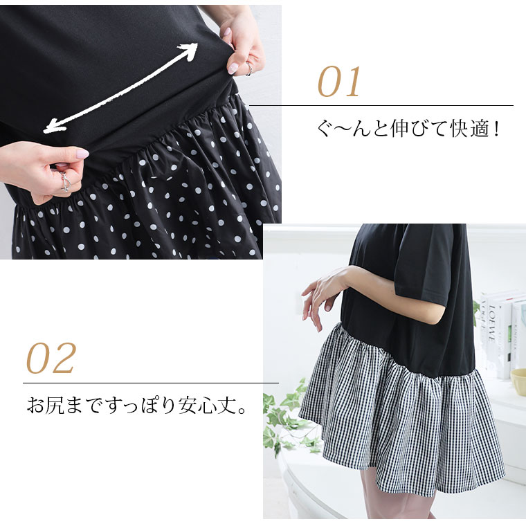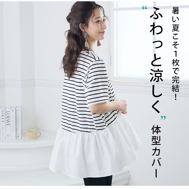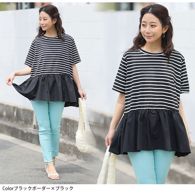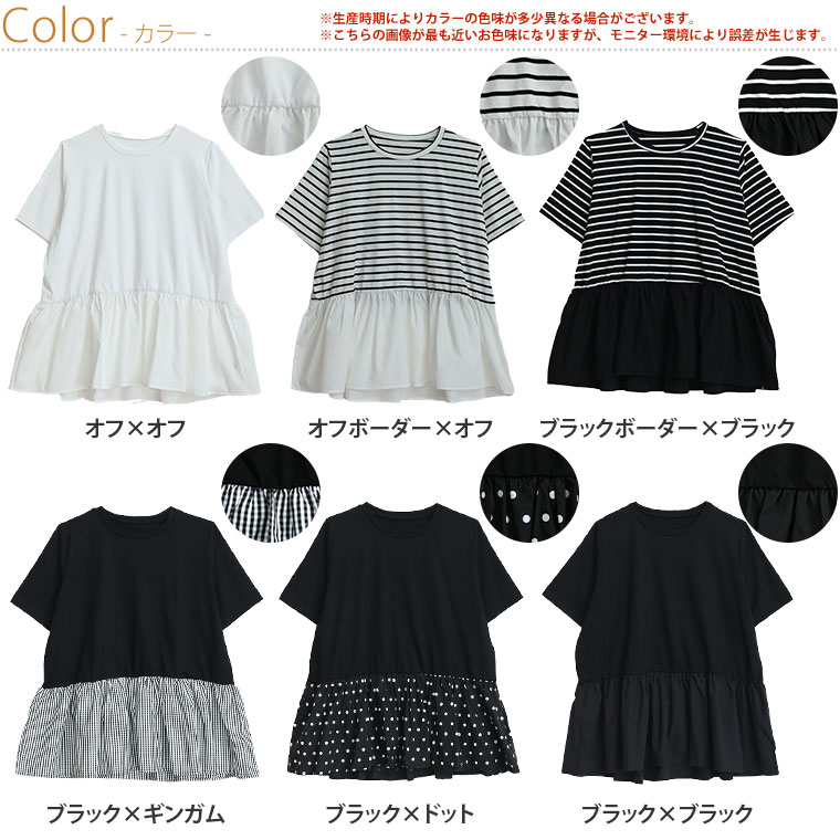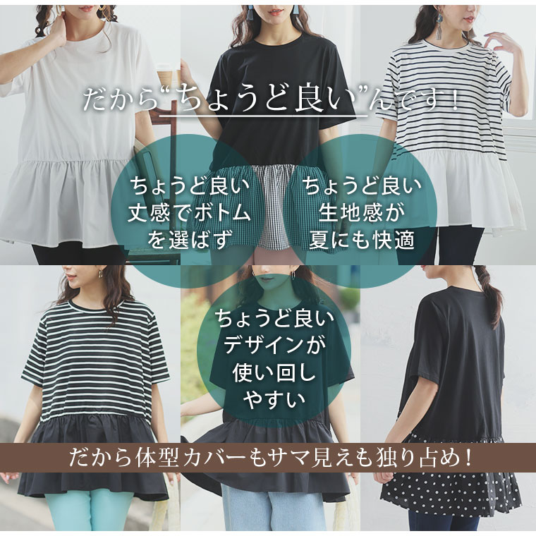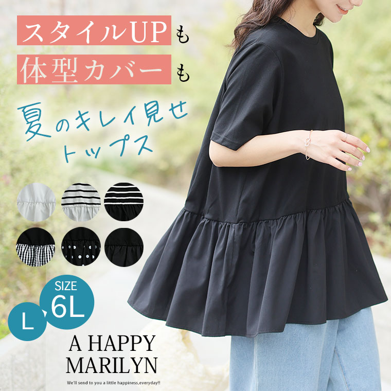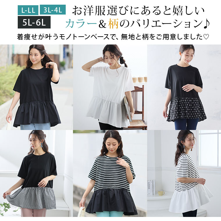 大きいサイズ レディース トップス | 無地と柄から選べる ペプラム トップス _ カットソー プルオーバー ドット ギンガムチェック ボーダー LL 3L 4L 5L 6L 長袖 夏 夏物 夏服 夏用 ぽっちゃり ゆったり プラスサイズ かわいい [432916]