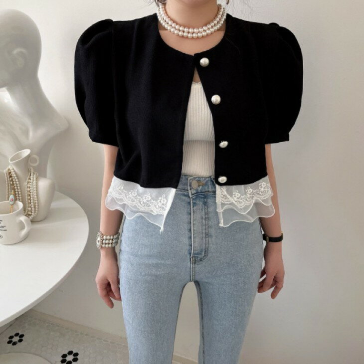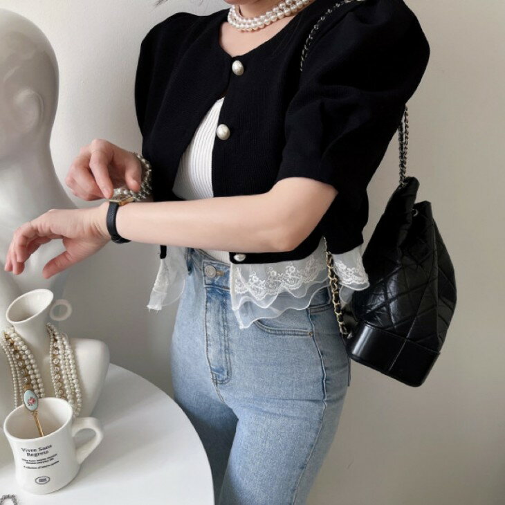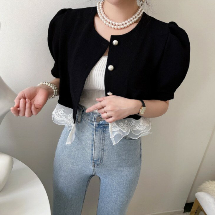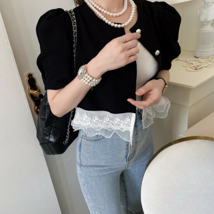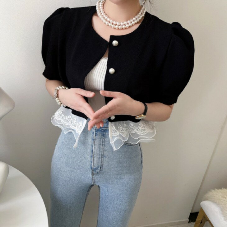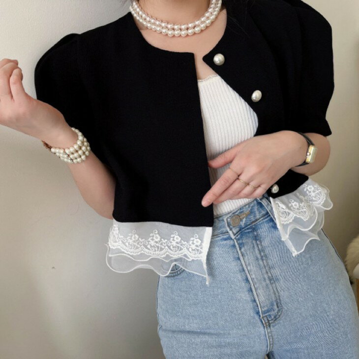 【半額クーポン対象】ショート丈ニットカーデ フリル ドッキング フェミニン 女子会 オケージョン おすすめ レディース オシャレ トレンド 人気 プチプラ 韓国ファッション 【7032-fx】【予約販売:15-20日】【送料無料】メ込2