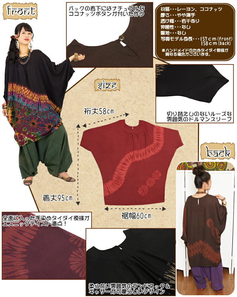 タイダイ染めレーヨンドルマンスリーブチュニック【アジアンファッション/エスニックファッション/アジアン/エスニック/レディース/トップス/チュニック/プルオーバー/カットソー/ドルマンスリーブ/長袖/大きいサイズ/タイダイ】