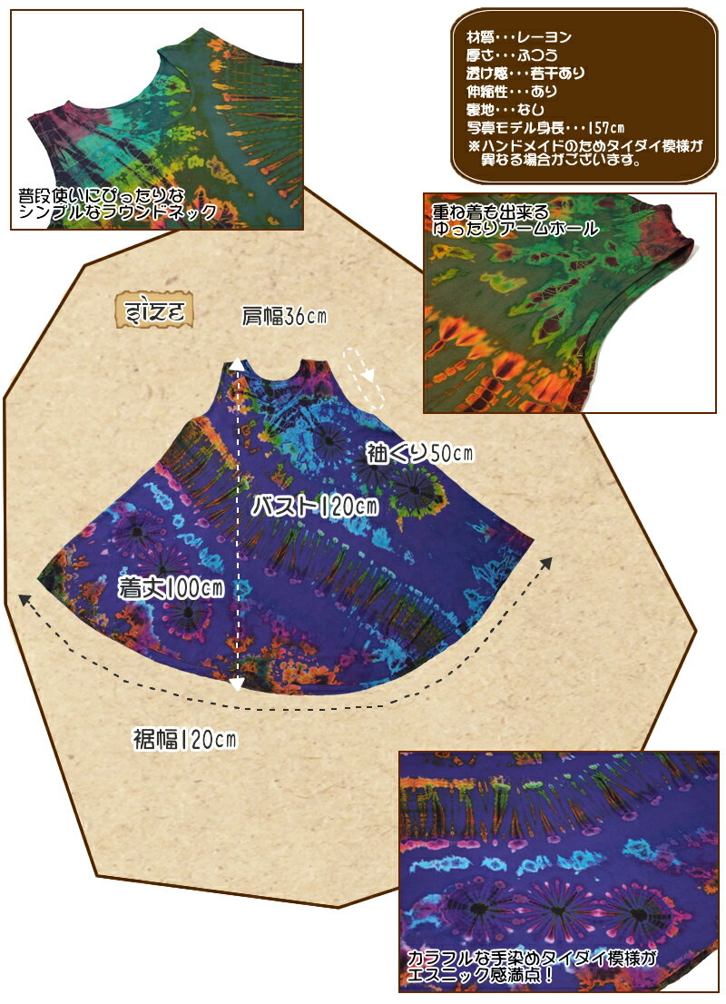 タイダイ染めレーヨンフレアチュニック【アジアンファッション/エスニックファッション/アジアン/エスニック/レディース/トップス/プルオーバー/ノースリーブ/大きいサイズ】