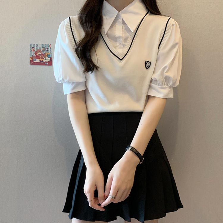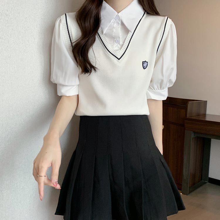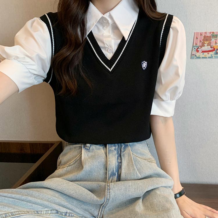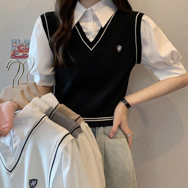 ニットベスト レディース ショート丈 ライン Vネック プルオーバー ベスト スクールベスト 制服 ベスト スクールセーター ノースリーブ トップス 女子高生 通学 学生 中学 高校生 学生服 春 秋 レイヤード 重ね着 カジュアル 韓国 ファッション 送料無料