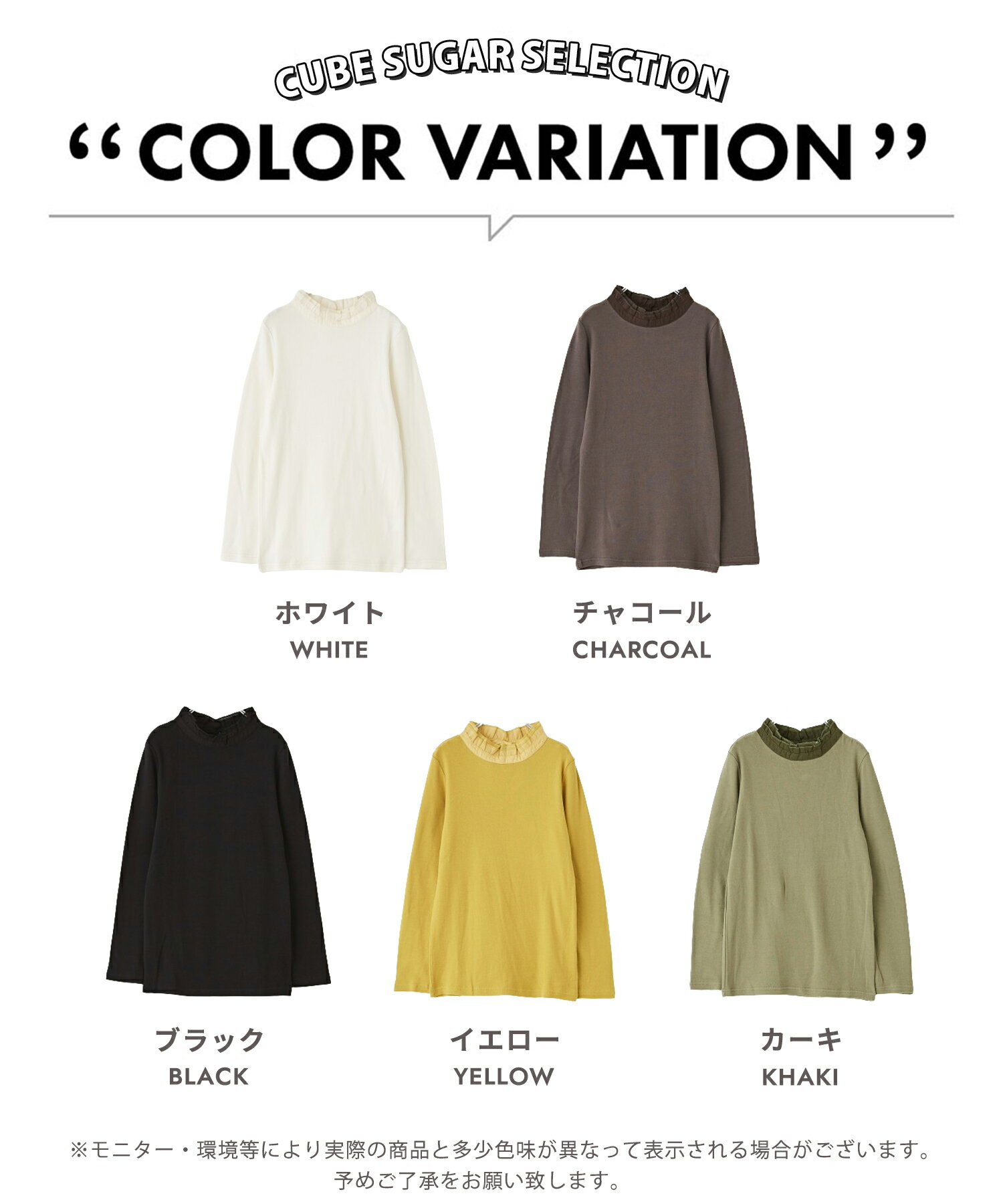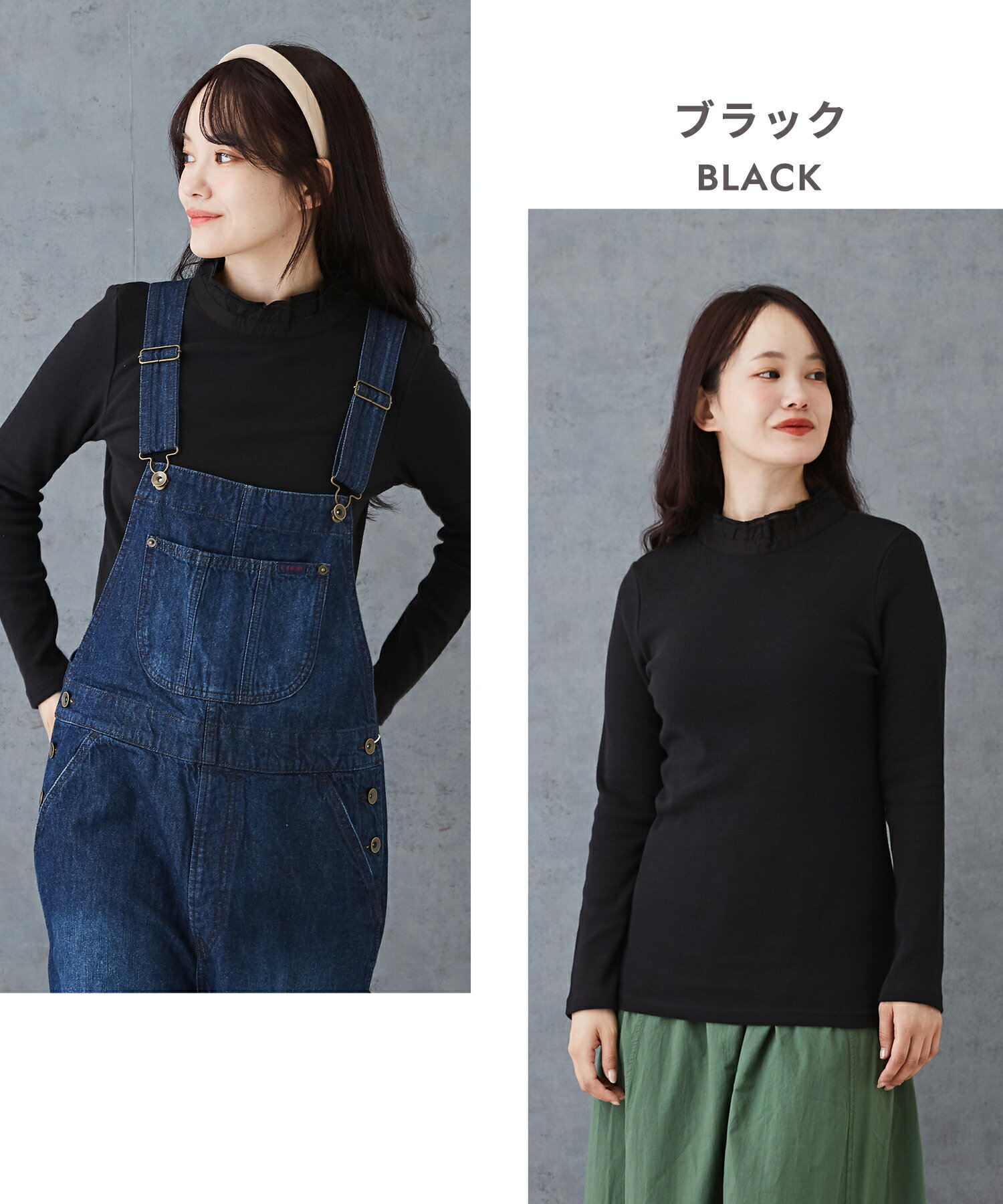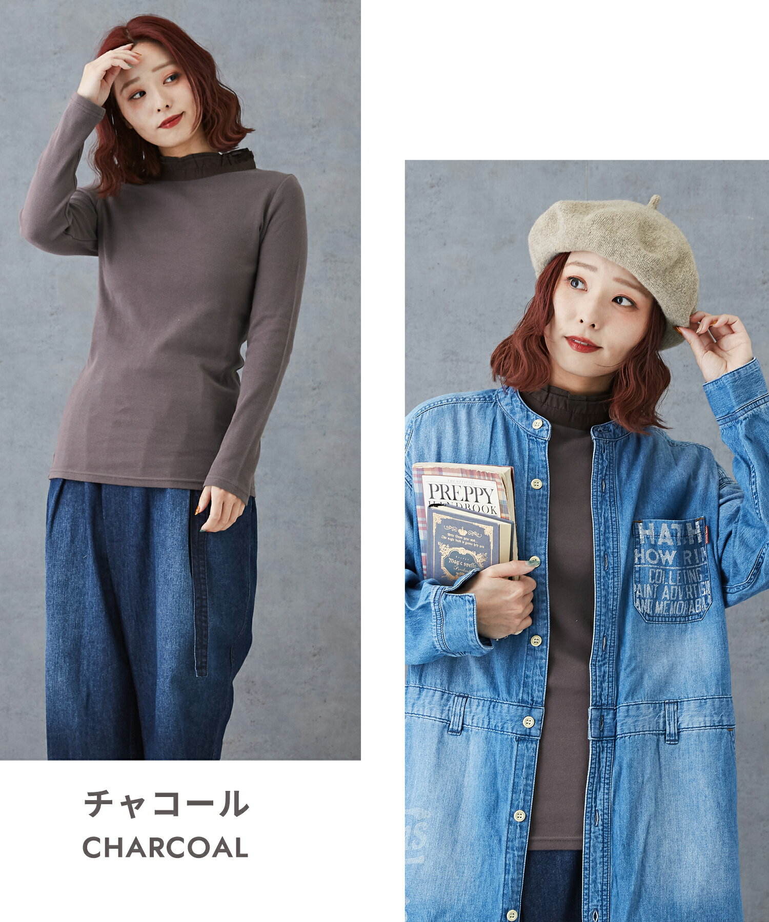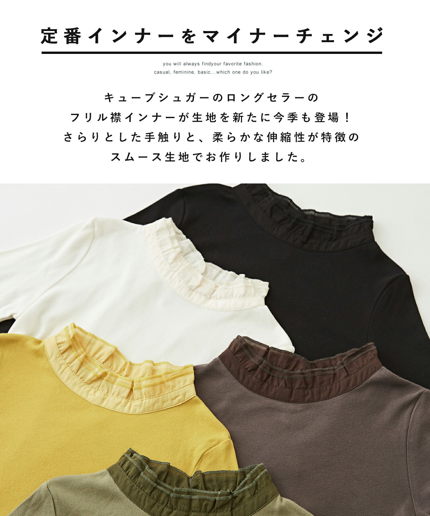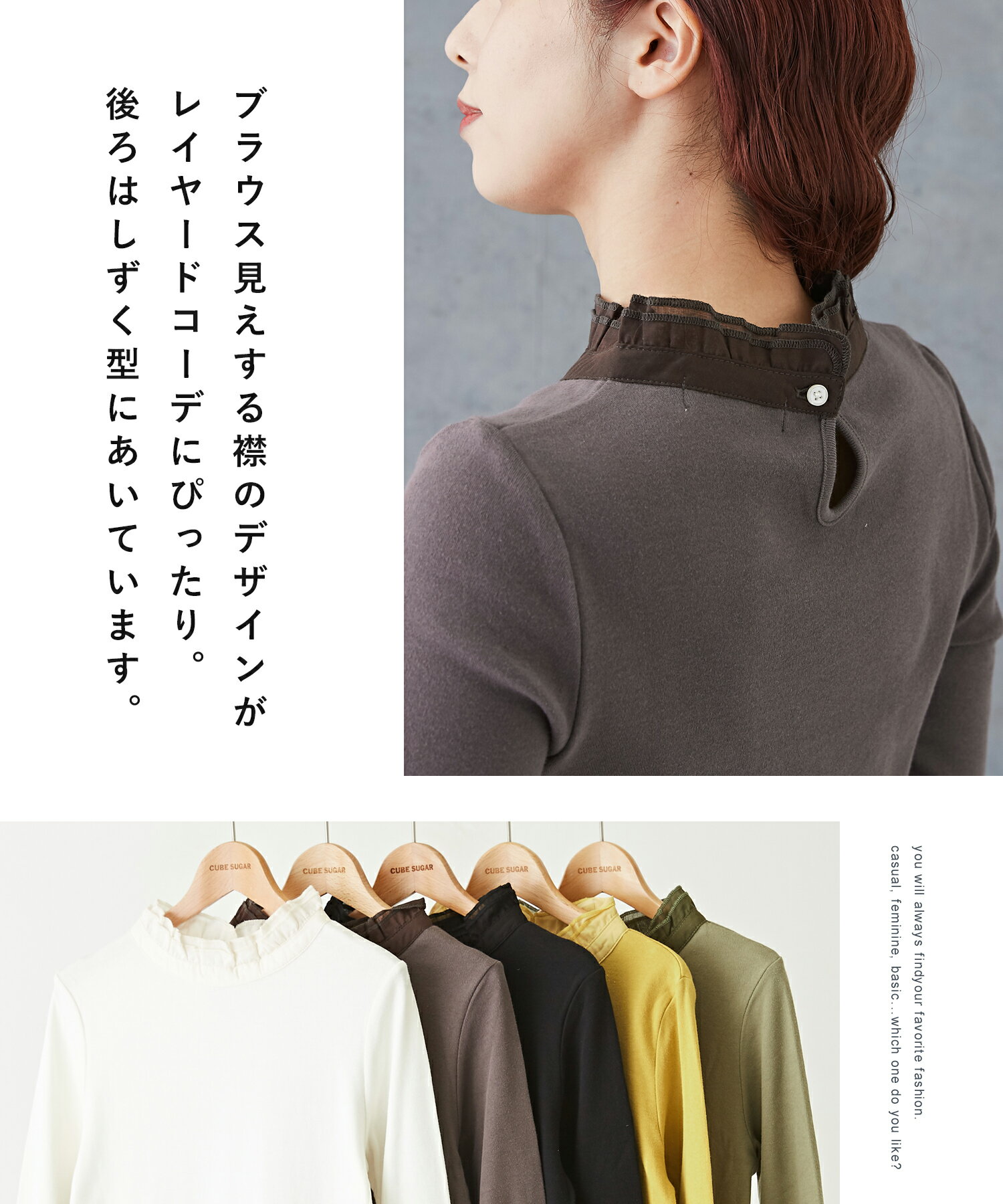 長袖インナー / 公式 CUBE SUGAR 40s スムース 長袖 フリル スタンド衿 クルーネック インナー (5色): アメカジ レディース トップス プルオーバー カットソー ロンt フリル襟 カジュアル シンプル ナチュラル キューブシュガー