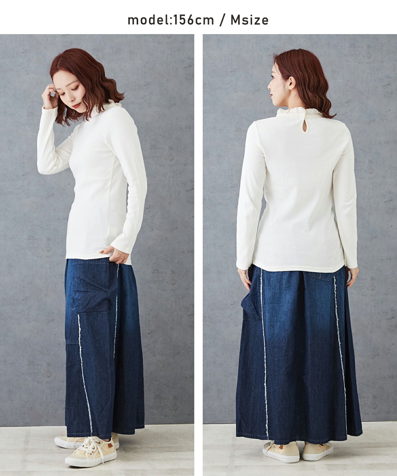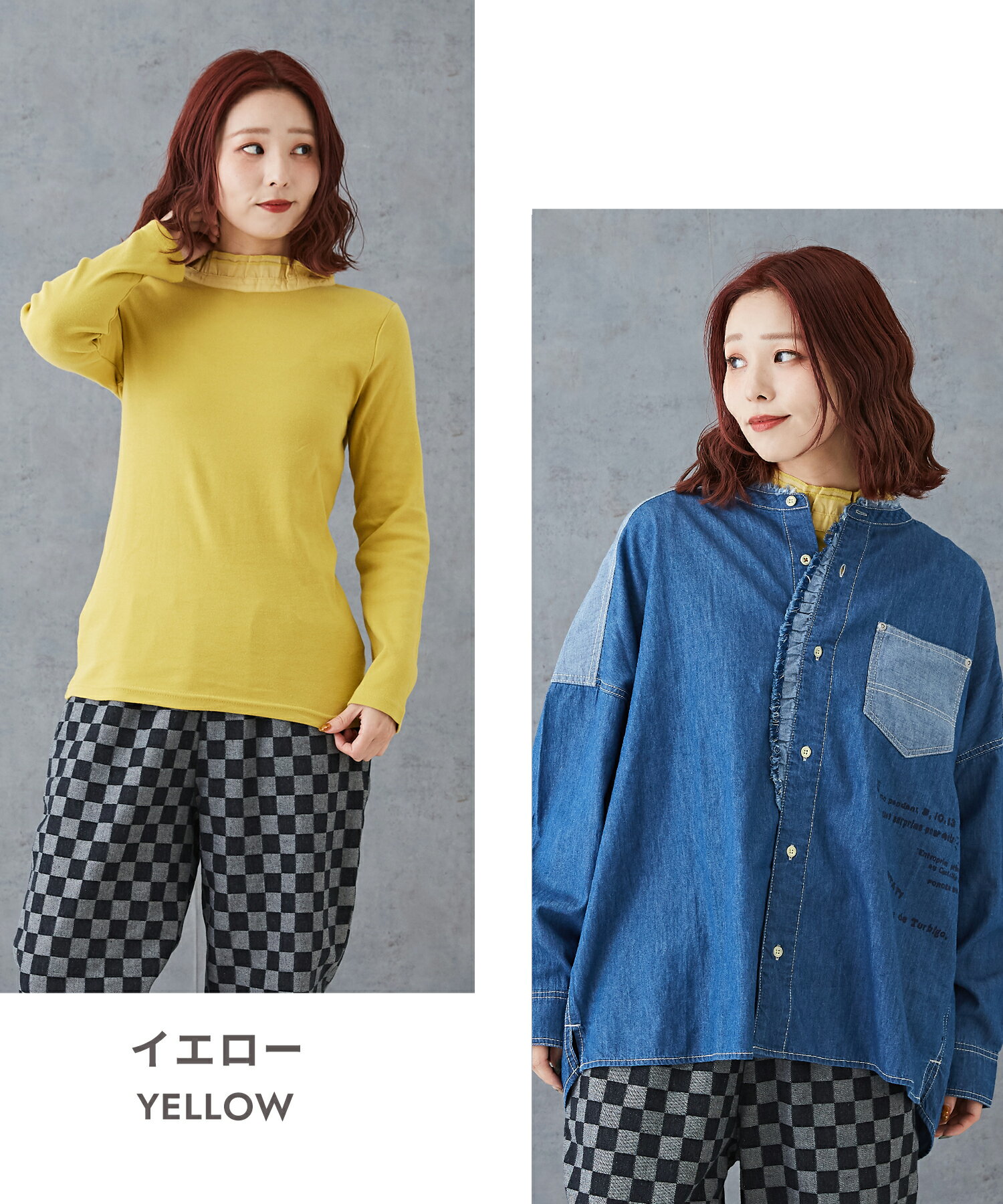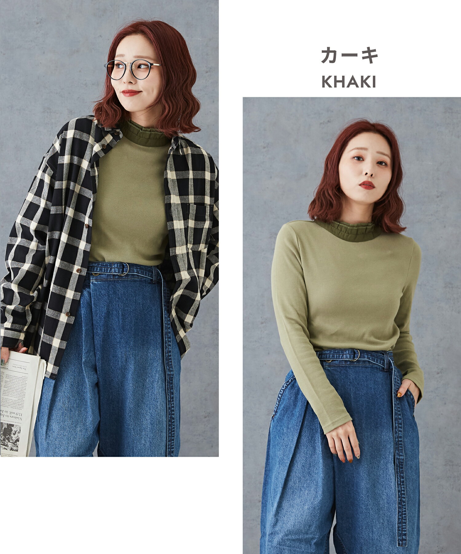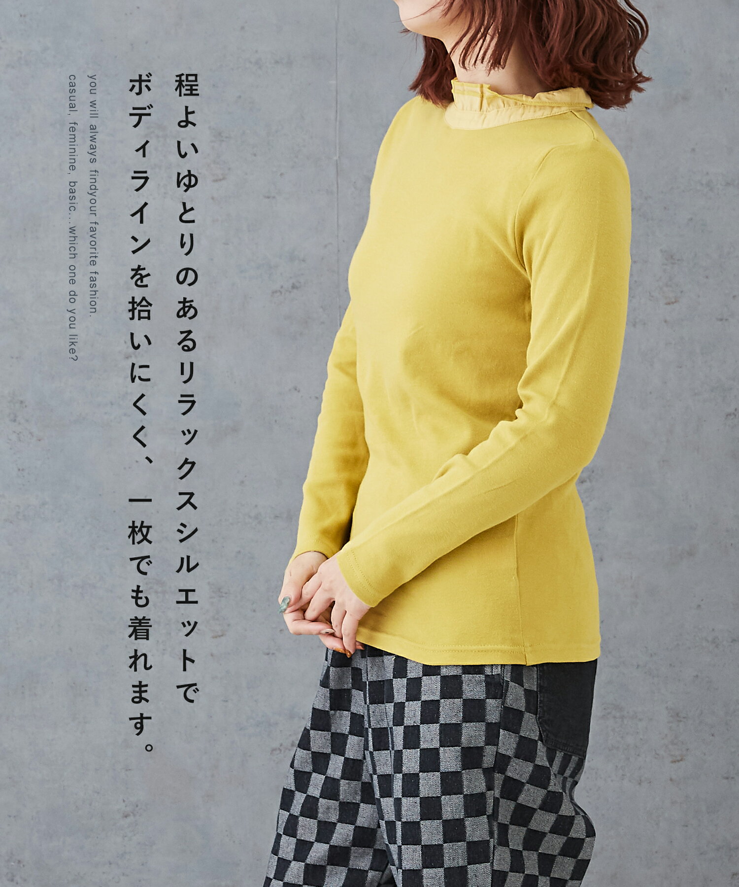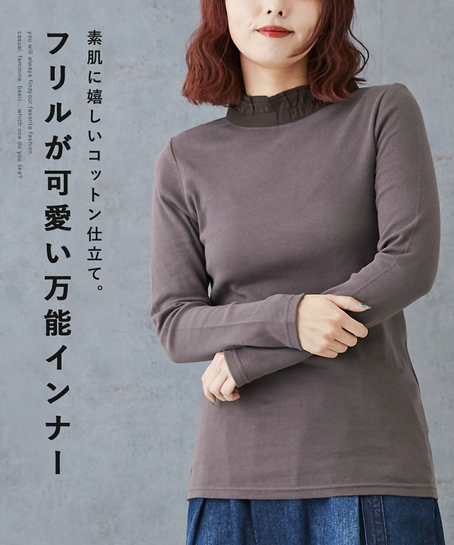 長袖インナー / 公式 CUBE SUGAR 40s スムース 長袖 フリル スタンド衿 クルーネック インナー (5色): アメカジ レディース トップス プルオーバー カットソー ロンt フリル襟 カジュアル シンプル ナチュラル キューブシュガー