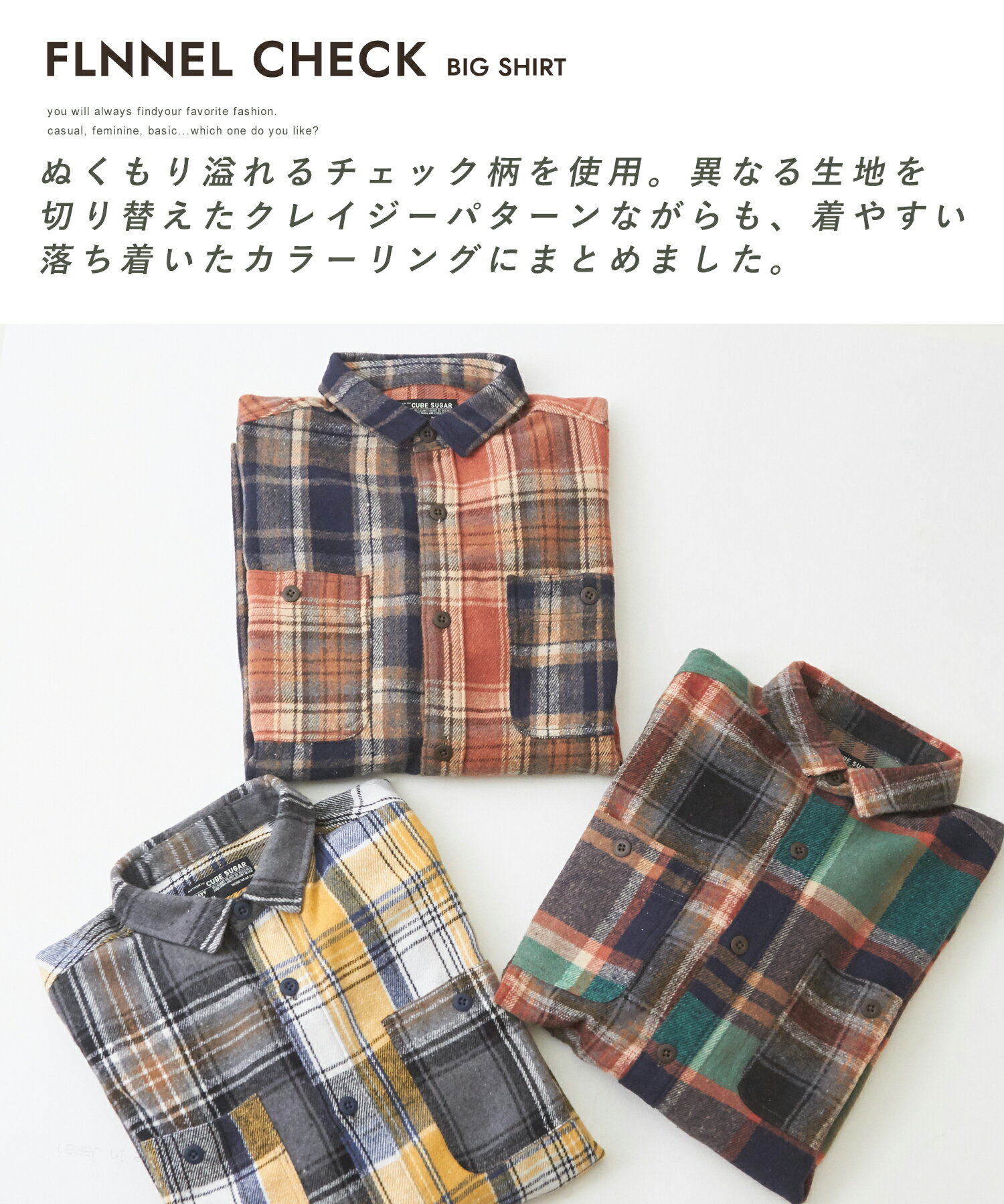 ネルシャツ / 公式 CUBE SUGAR 起毛 チェック ビッグシャツ(3色): アメカジ レディース トップス シャツ 羽織 チェックシャツ オーバーサイズ ゆったり 大きめ カジュアル キューブシュガー