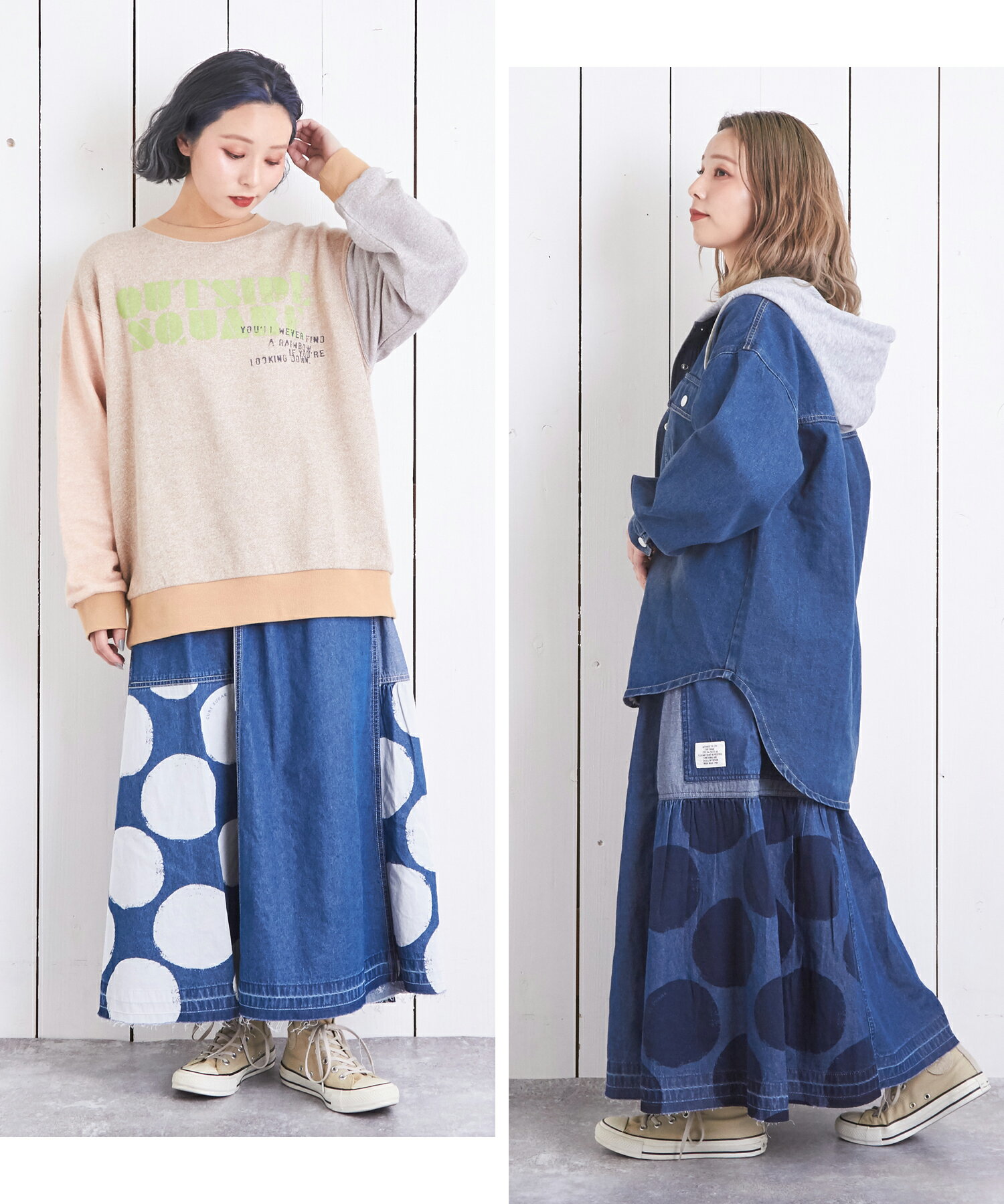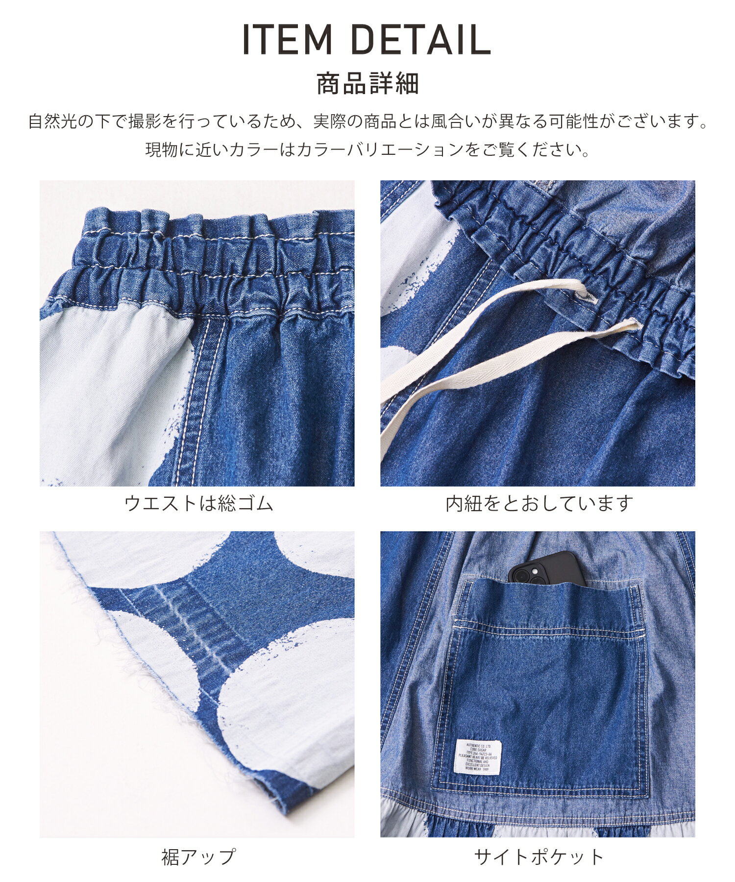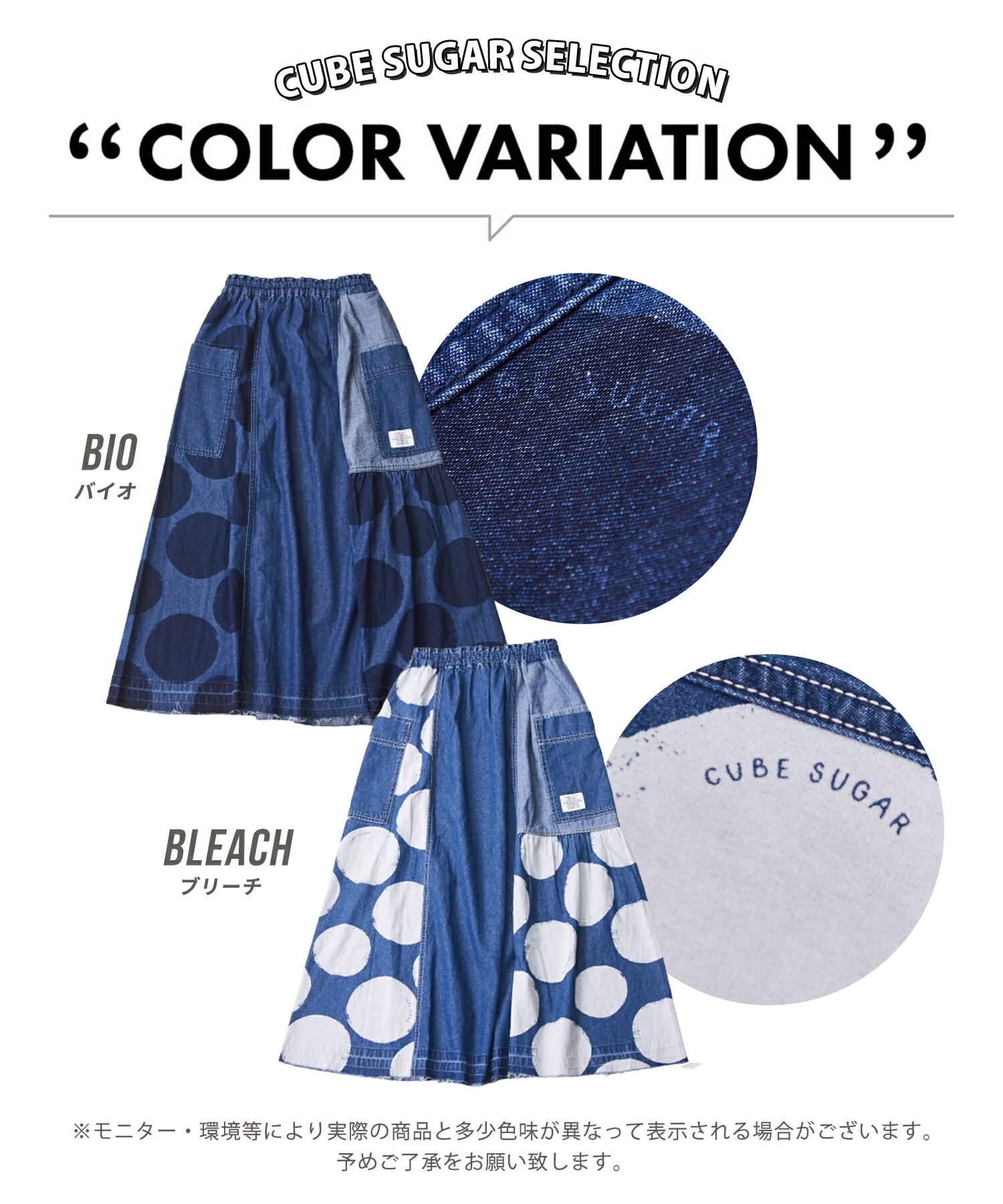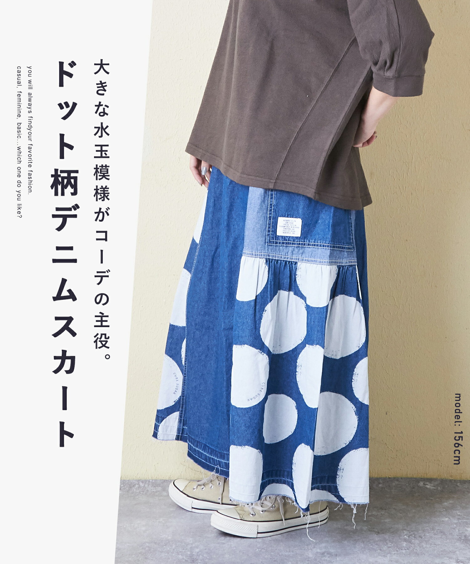 【10%OFF】【春新作】デニムスカート / 公式 CUBE SUGAR 5.5オンス デニム ドット プリント 切替 ギャザー スカート(2色): アメカジ レディース ボトムス スカート デニム 水玉 ロング丈 ウエストゴム フレア カジュアル キューブシュガー