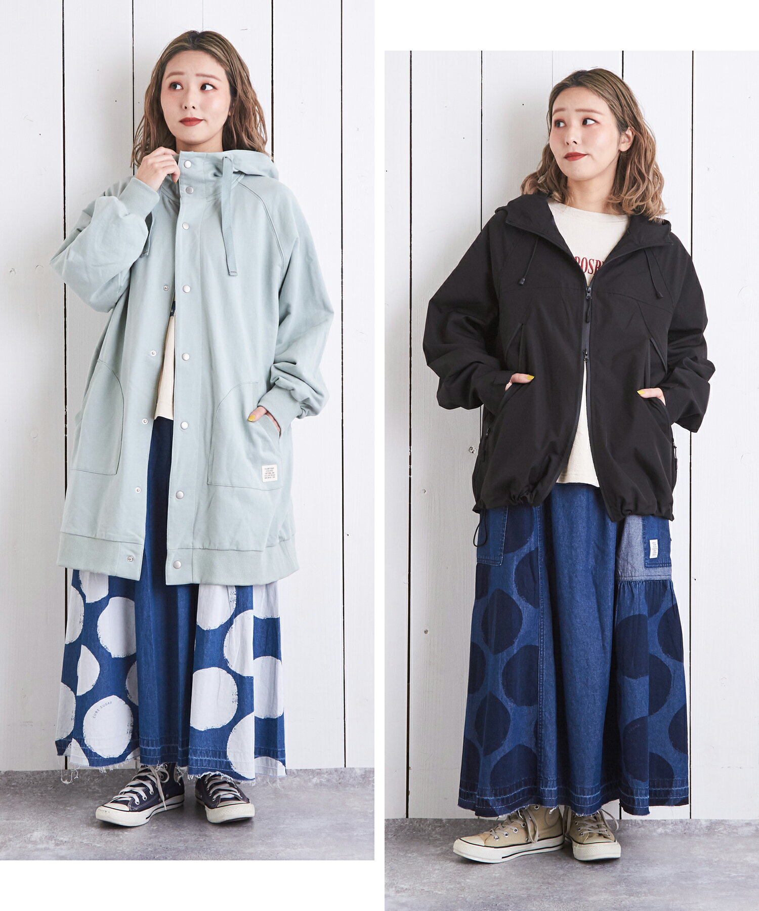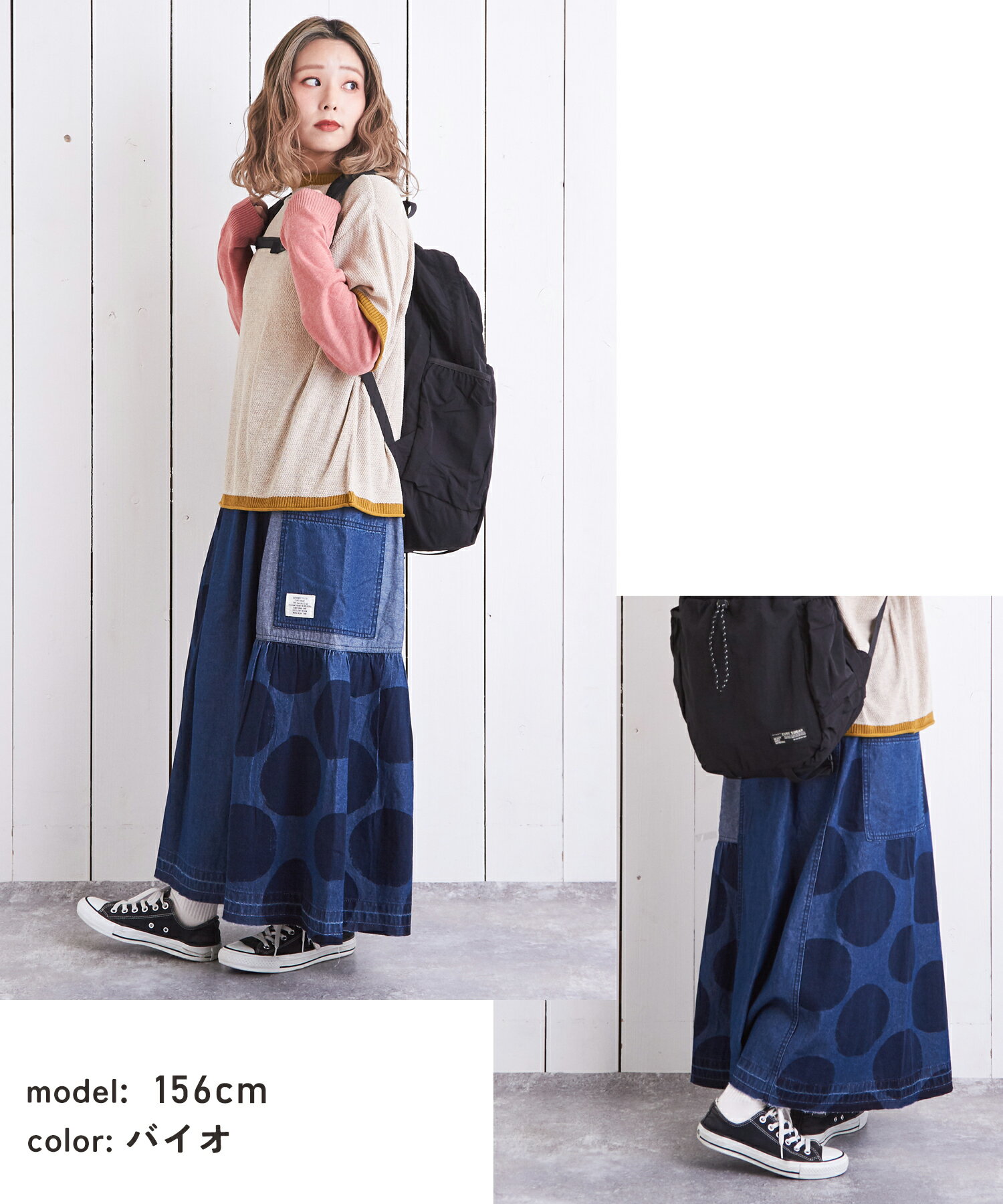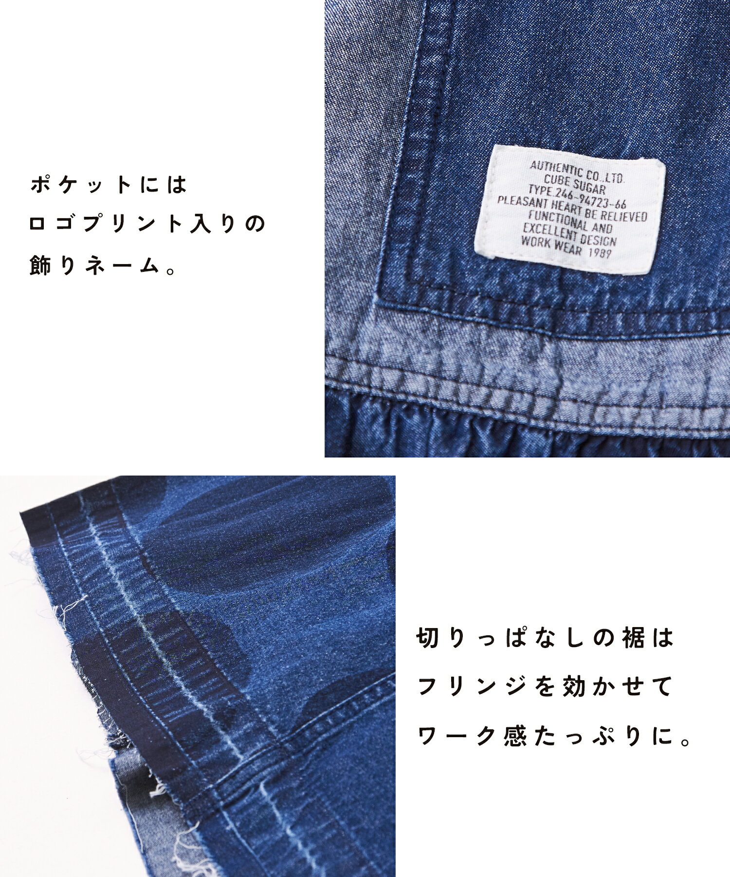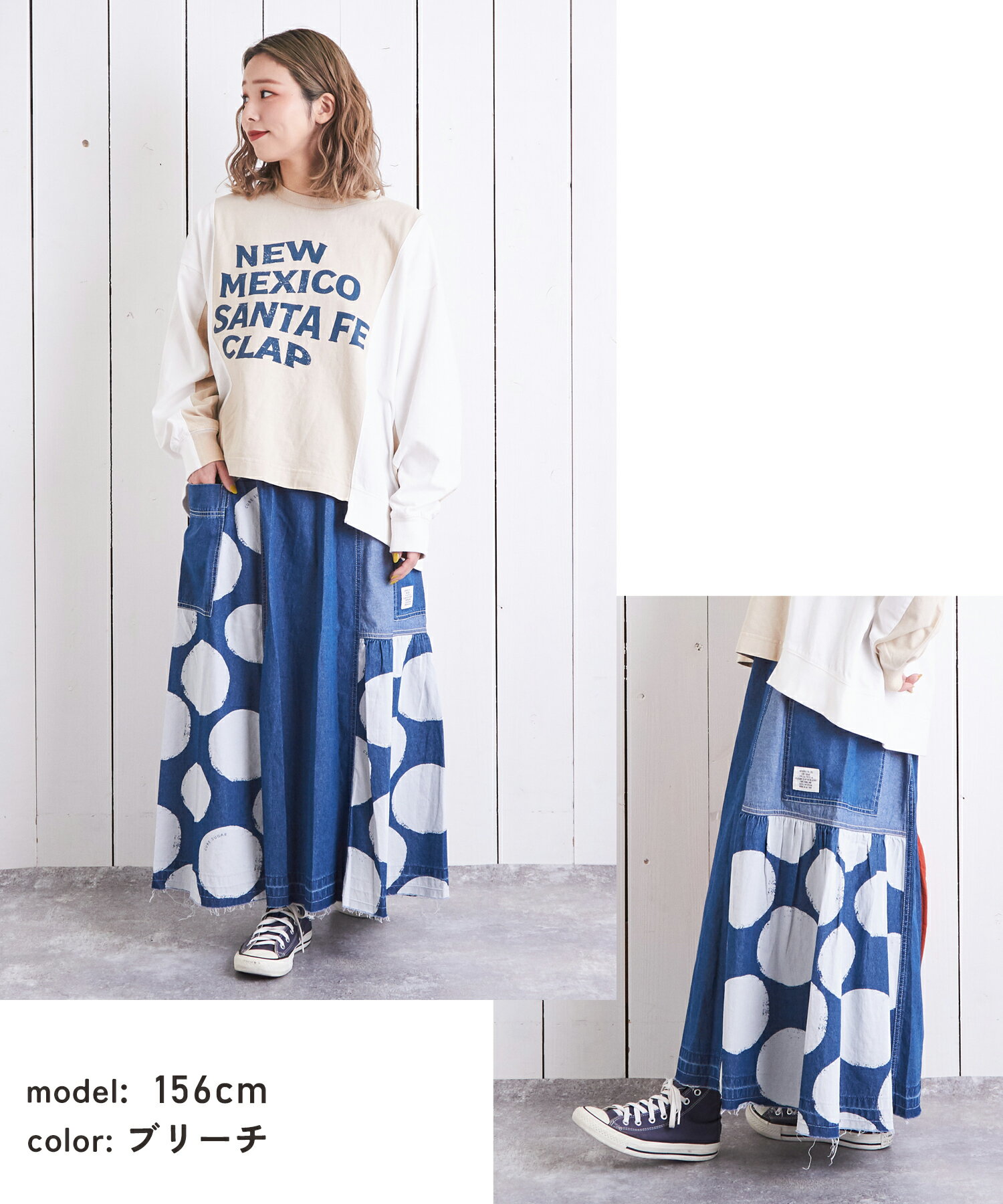【10%OFF】【春新作】デニムスカート / 公式 CUBE SUGAR 5.5オンス デニム ドット プリント 切替 ギャザー スカート(2色): アメカジ レディース ボトムス スカート デニム 水玉 ロング丈 ウエストゴム フレア カジュアル キューブシュガー