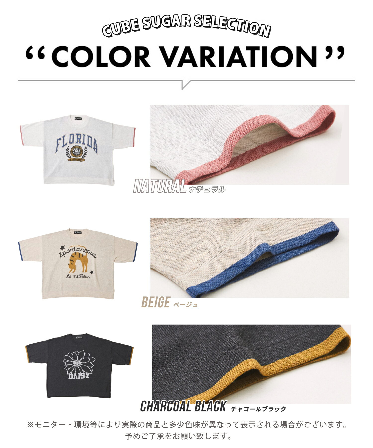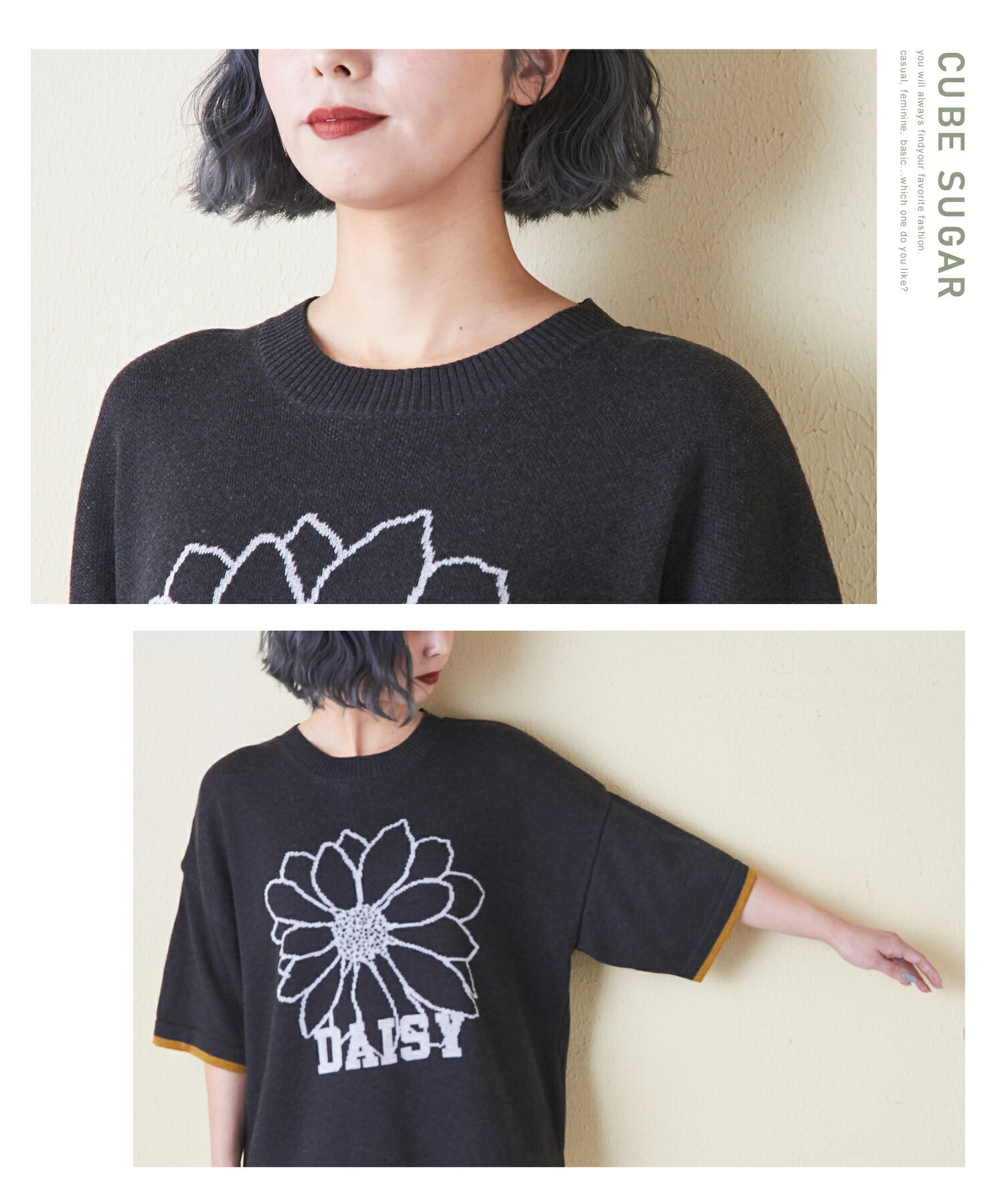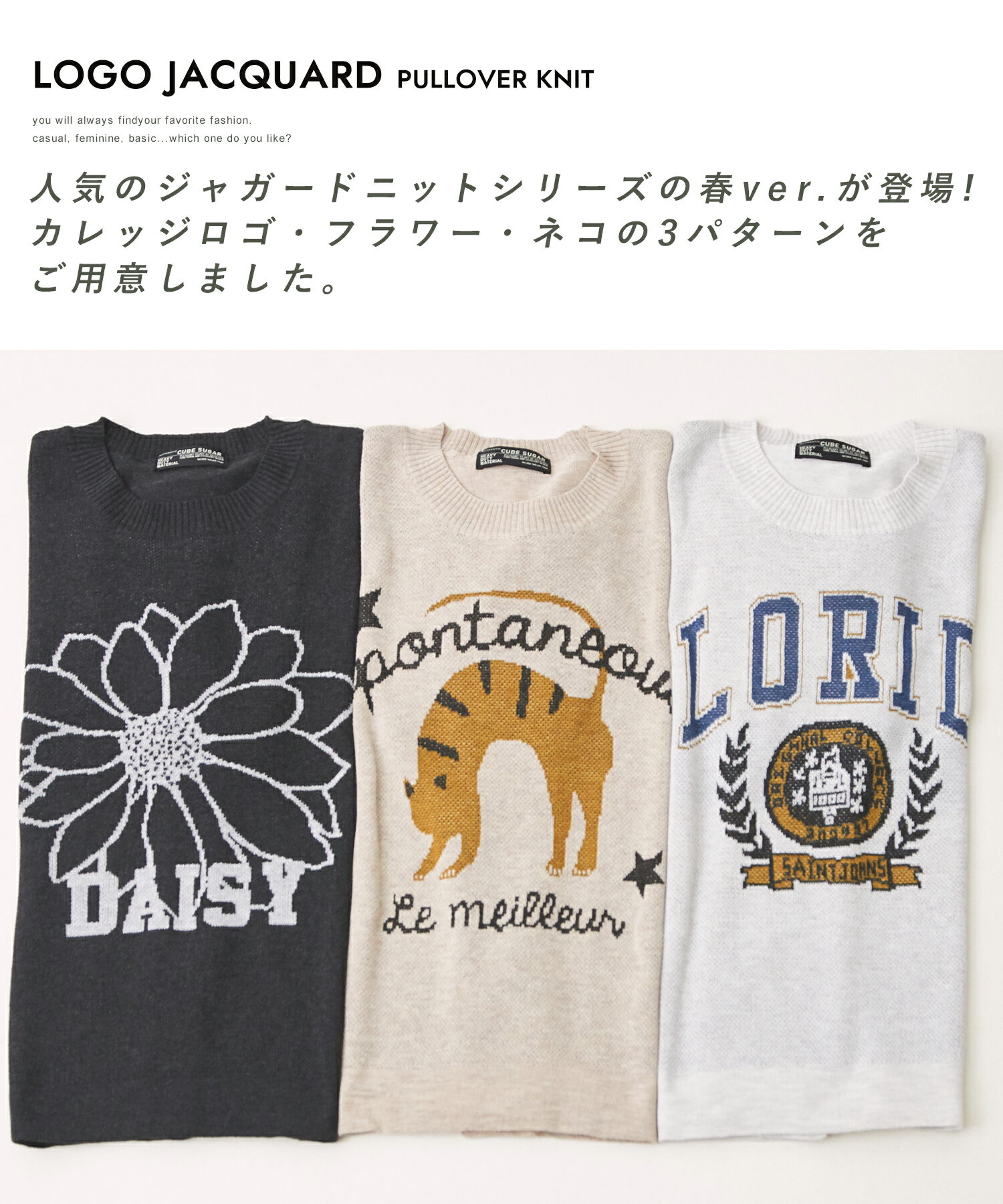 【お買い物マラソン★10%OFF】【春新作】ロゴニット / 公式 CUBE SUGAR コットンライク ニット ロゴ ジャガード プルオーバー(3色): アメカジ レディース トップス セーター 猫 ねこ ネコ ロゴ 花 半袖 半端袖 クルーネック カジュアル ナチュラル キューブシュガー