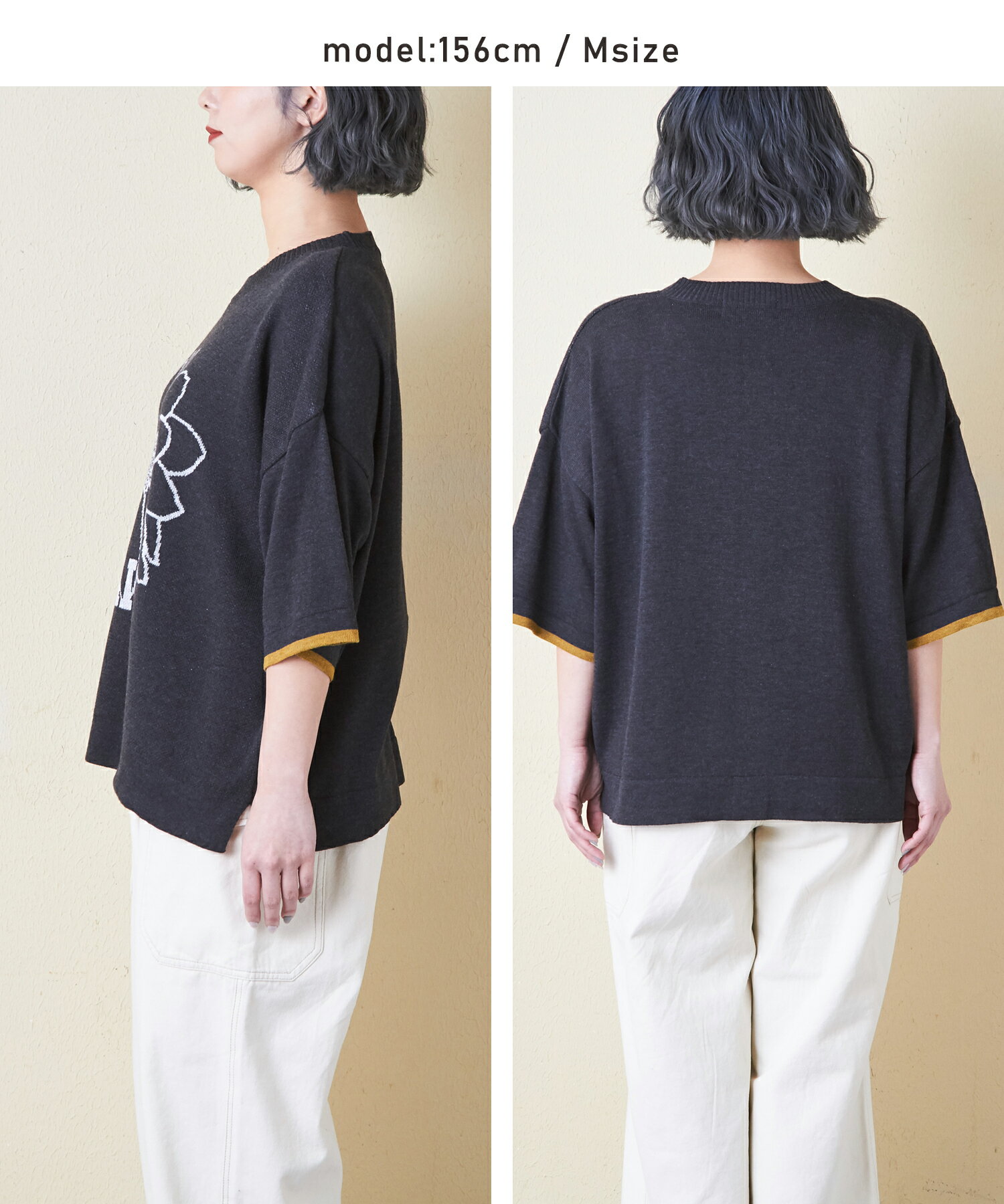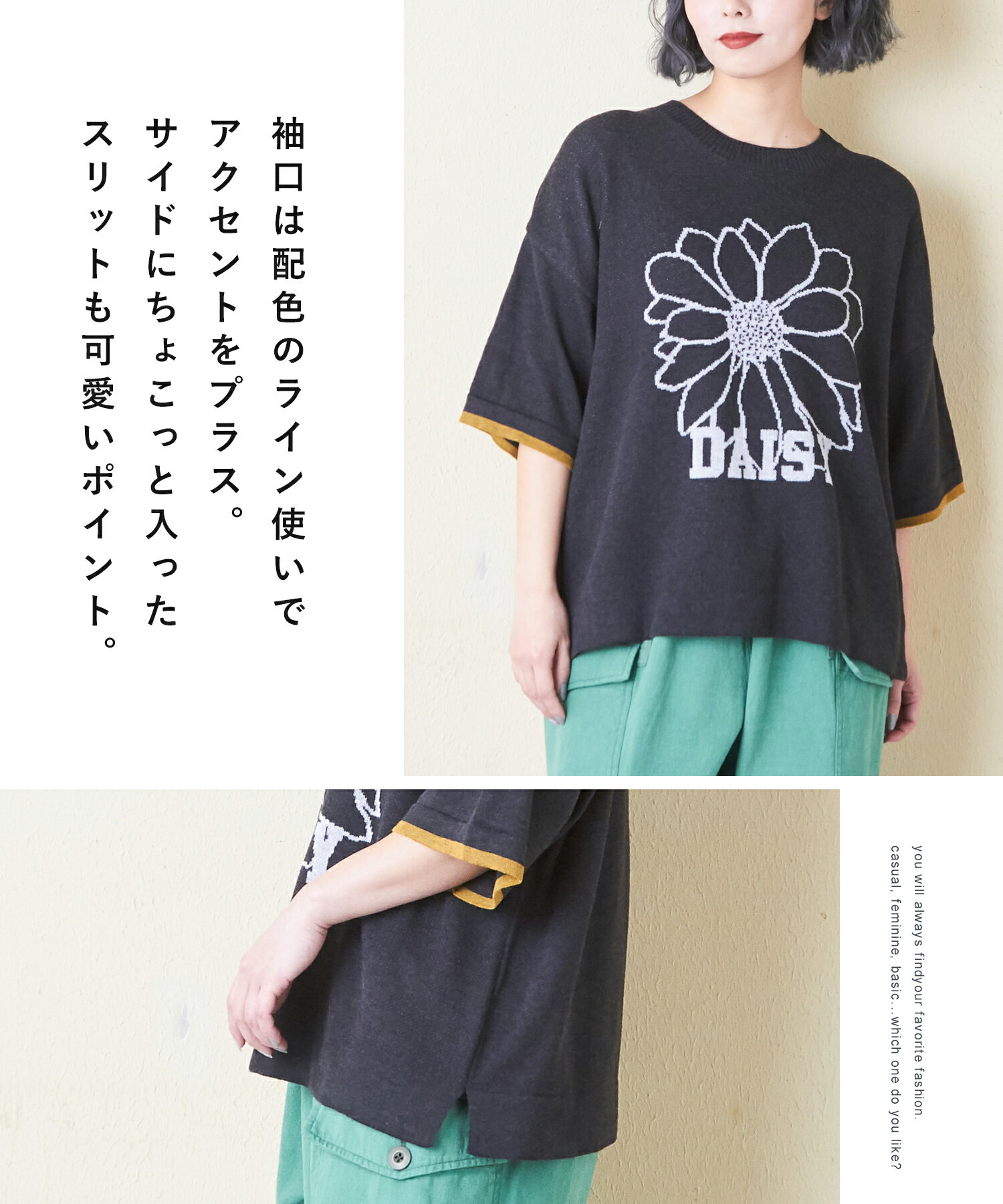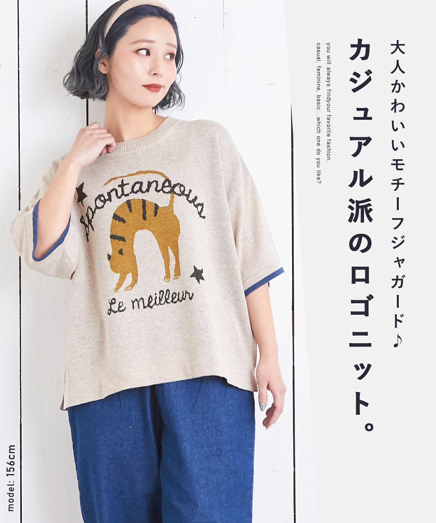 【お買い物マラソン★10%OFF】【春新作】ロゴニット / 公式 CUBE SUGAR コットンライク ニット ロゴ ジャガード プルオーバー(3色): アメカジ レディース トップス セーター 猫 ねこ ネコ ロゴ 花 半袖 半端袖 クルーネック カジュアル ナチュラル キューブシュガー