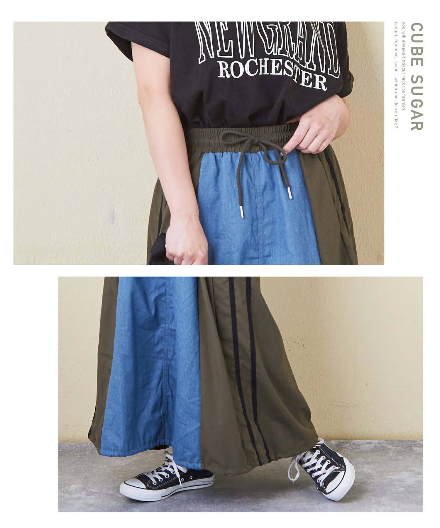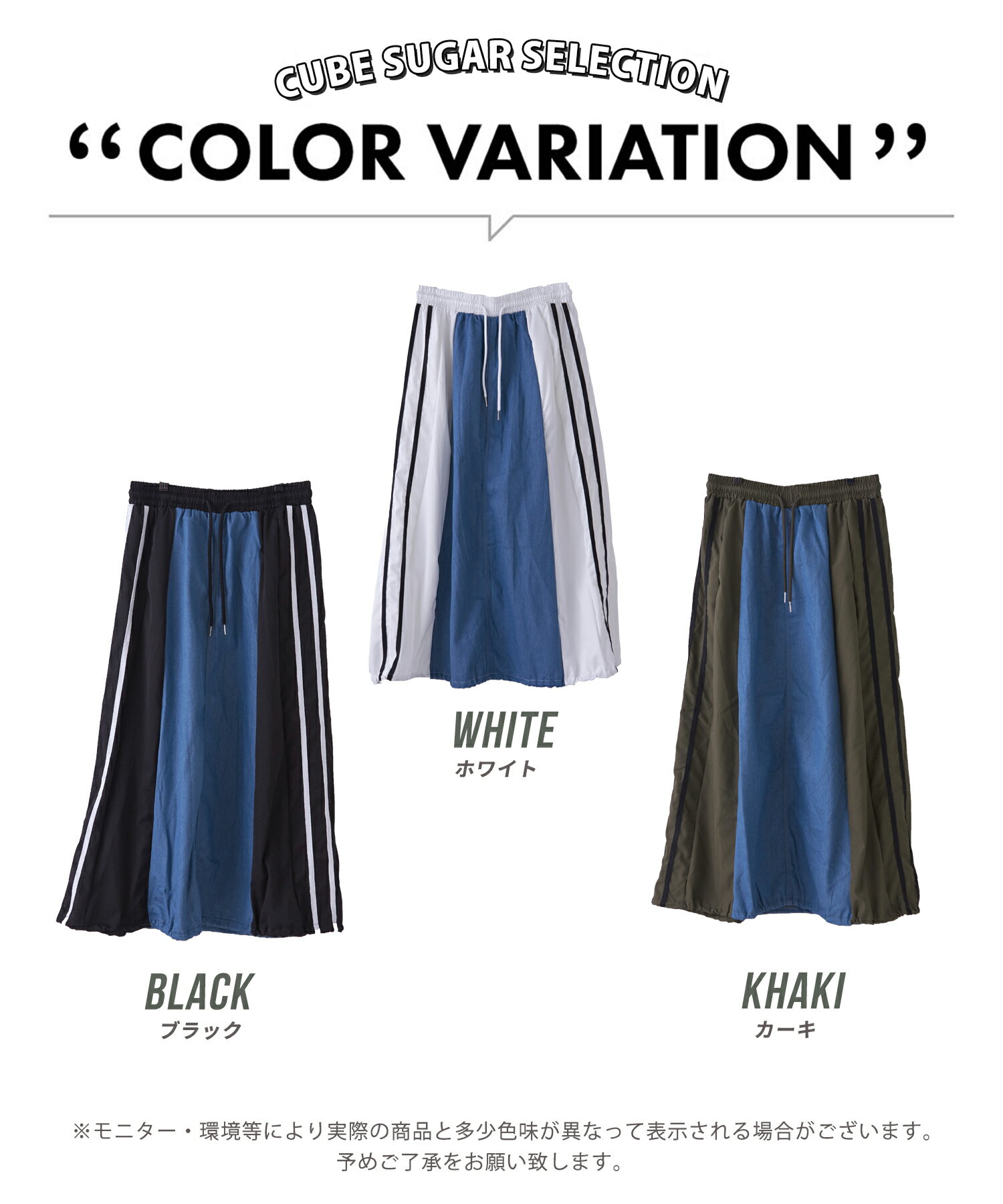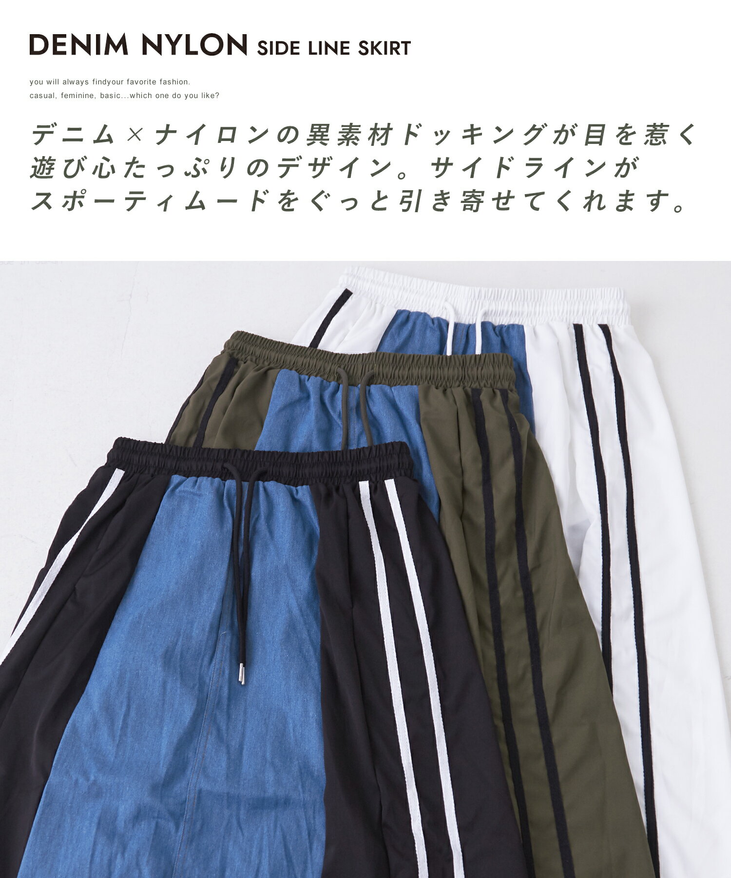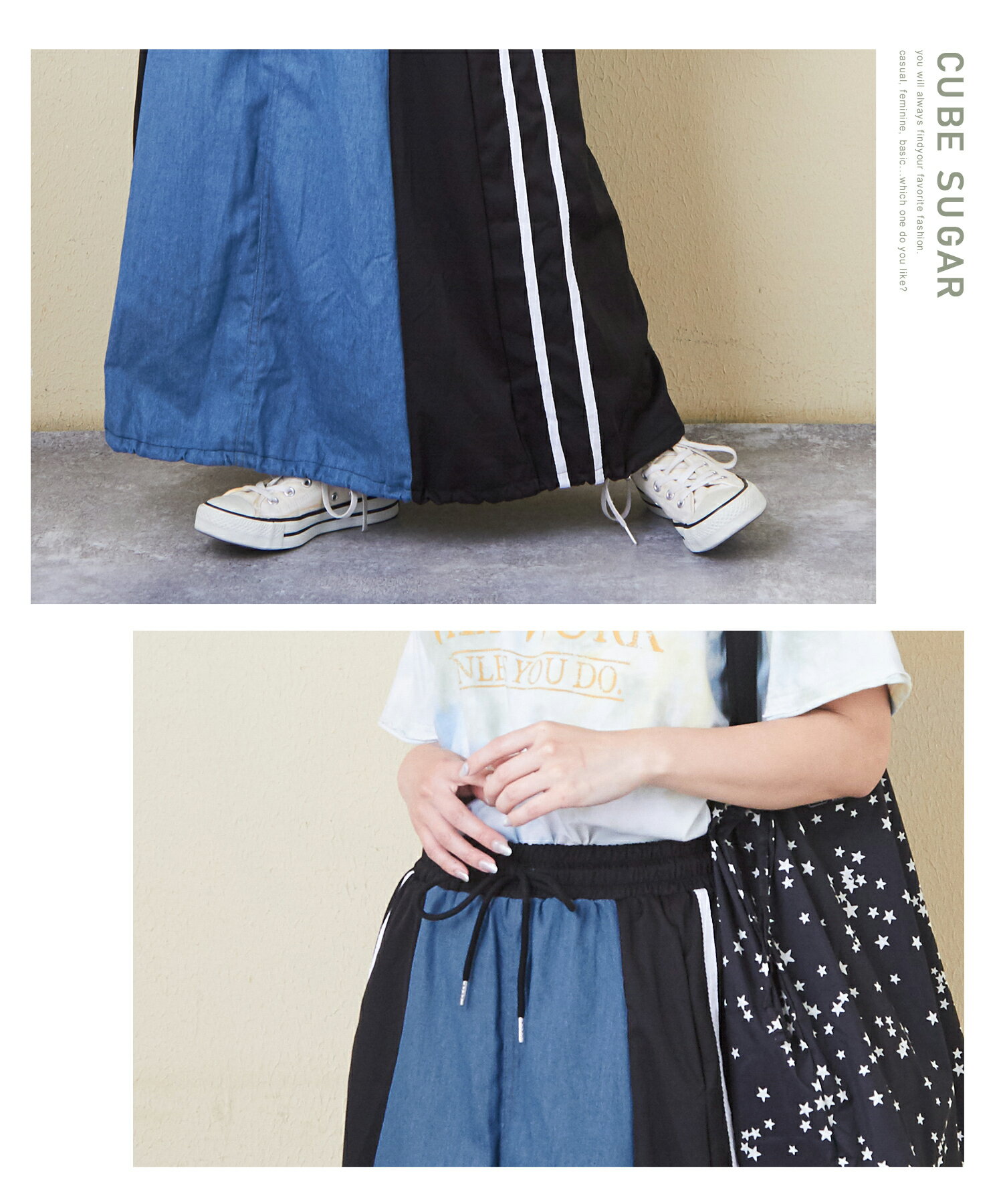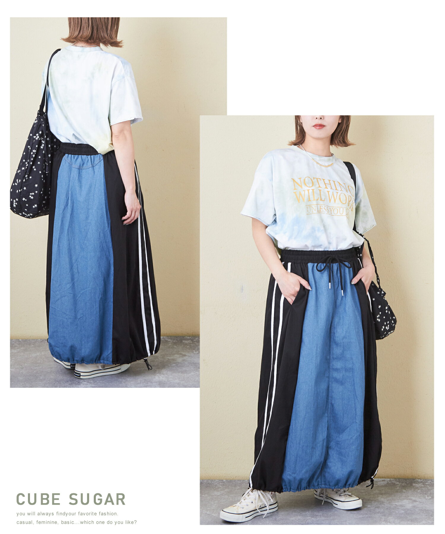 【17周年記念SALE★10%OFF】【夏新作】デニムスカート / 公式 CUBE SUGAR デニム × ナイロン サイドライン 切替 スカート (3色): アメカジ レディース ボトムス スカート ロングスカート ライン入り ロング丈 ウエストゴム フレア カジュアル キューブシュガー