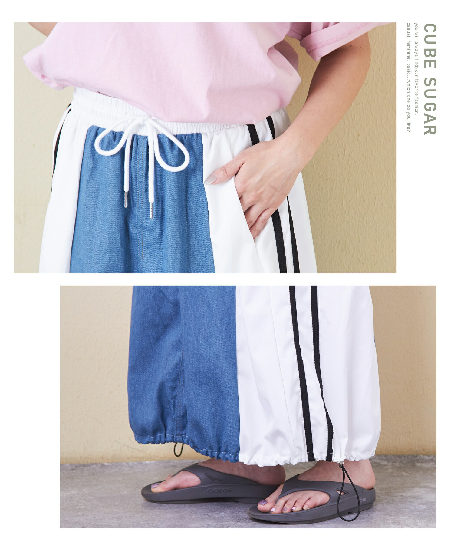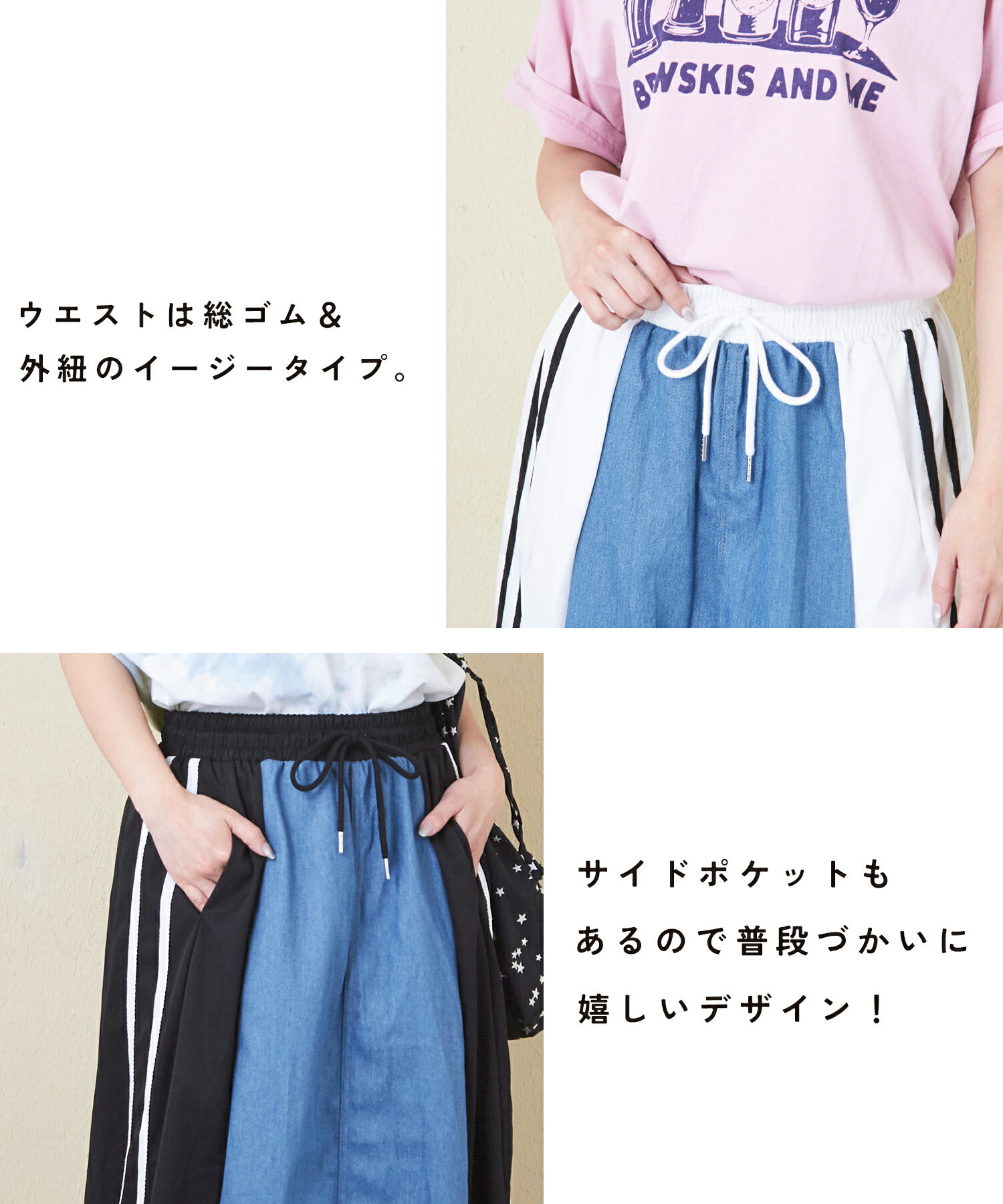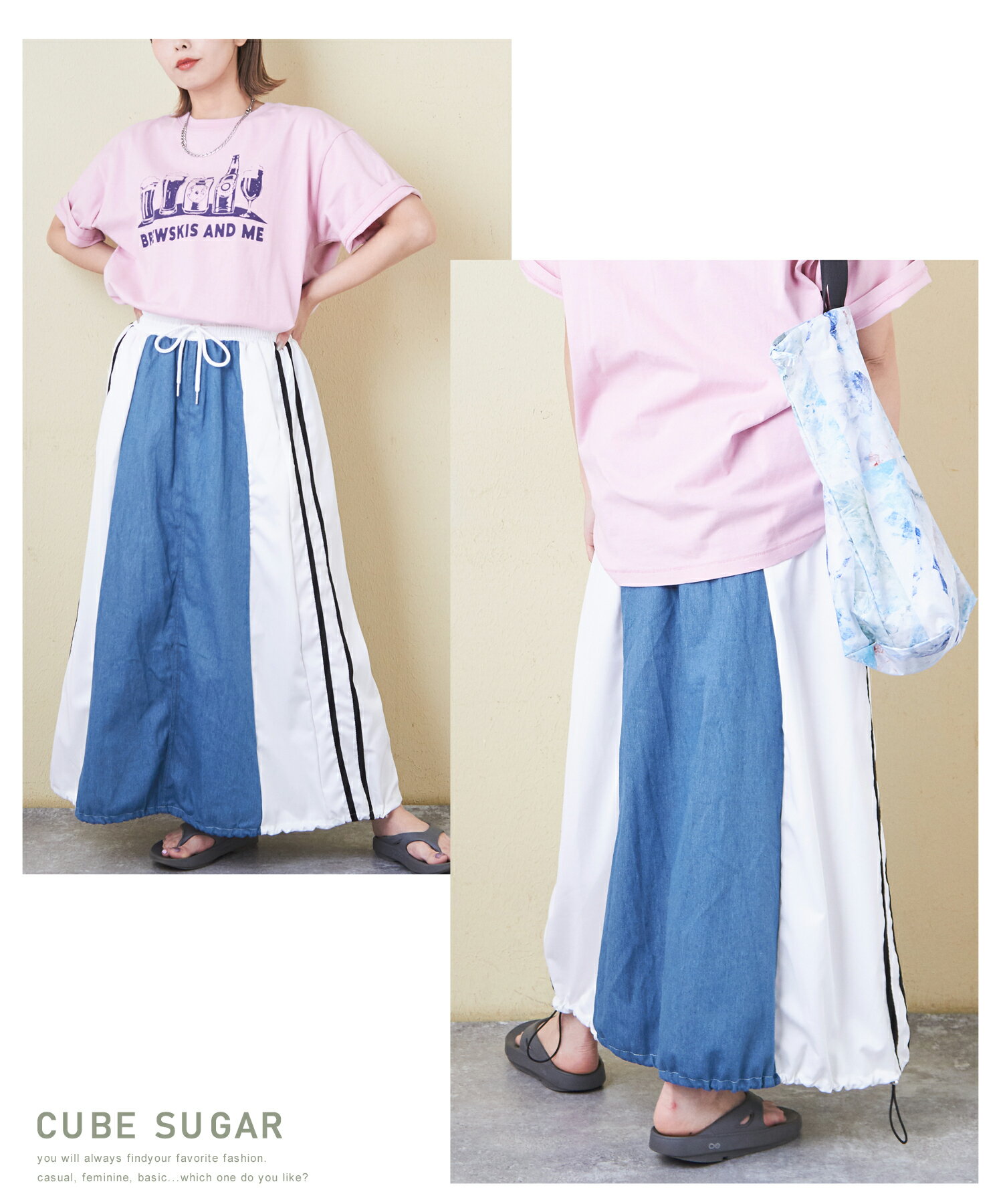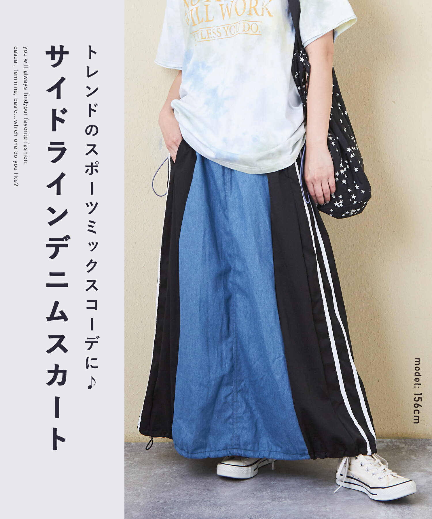 【17周年記念SALE★10%OFF】【夏新作】デニムスカート / 公式 CUBE SUGAR デニム × ナイロン サイドライン 切替 スカート (3色): アメカジ レディース ボトムス スカート ロングスカート ライン入り ロング丈 ウエストゴム フレア カジュアル キューブシュガー