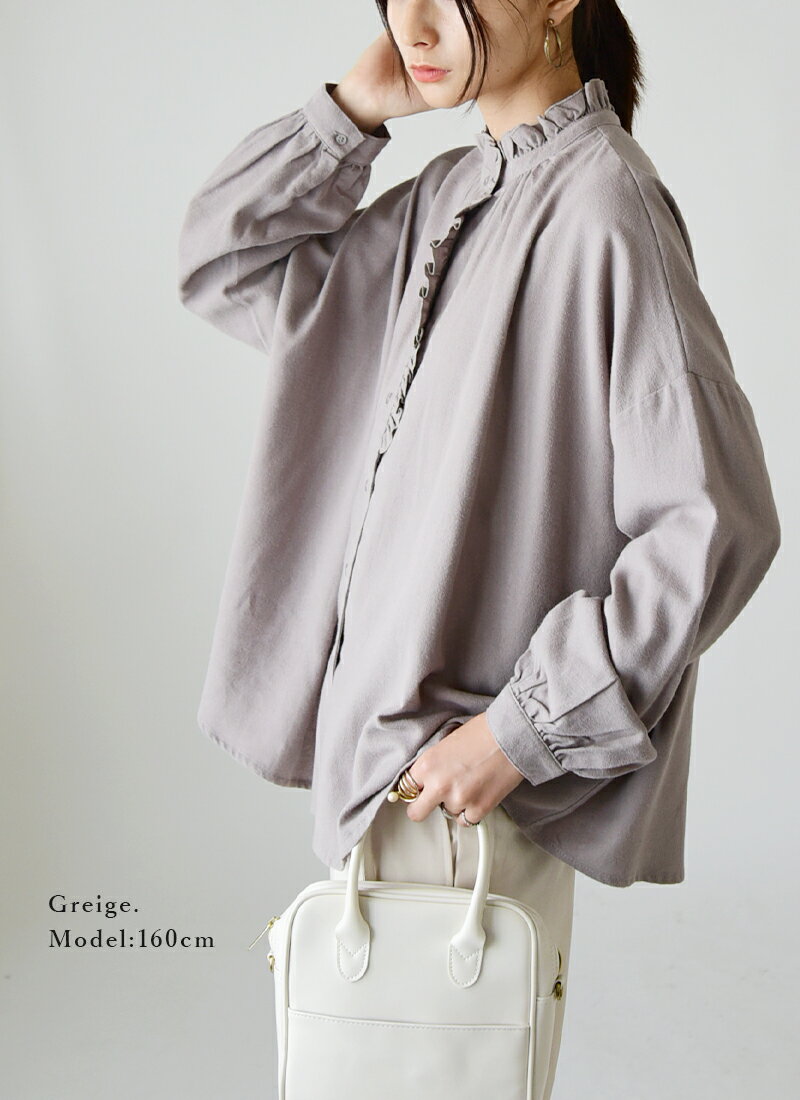 ブラウス レディース ネルフリルワイドブラウス トップス 長袖 ネル 起毛 ほっこり 大人可愛い ナチュラル カジュアル ドロップショルダー ゆったり 楽ちん ラフ 体型カバー アイボリー グレージュ ブラック チェック 黒 白 秋 冬 24aw AW, M-L メール便10