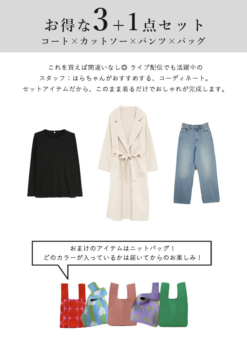 【クーポンで5,000円】福袋 2025 レディース 3点セット 原ちゃんコーディネートセット はらちゃん ハラちゃん コーデセット お洒落 大人可愛い カジュアル アウター コート トップス カットソー 裏起毛 ボトムス デニム 着回し おまけ付き ニットバッグ メール便不可