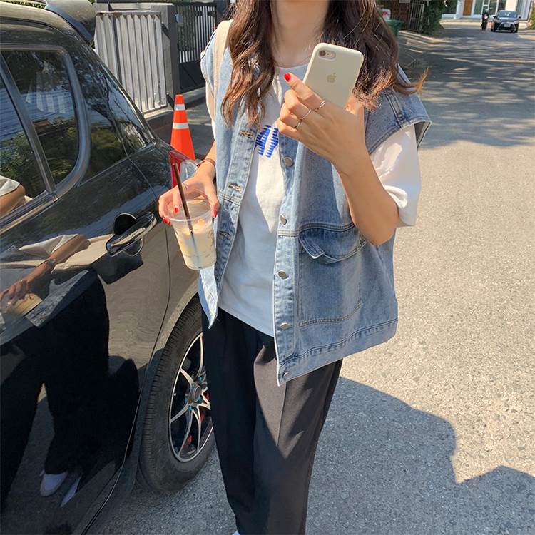 デニム ベスト ジレ ノースリー ポケット ジャケット ドロップショルダー レディース 襟付き 春 秋 オシャレ 送料無料 個性的 ストレート かわいい 重ね着 シンプル カジュアル ラフ チョッキ 無地 ブルー 青 ブリーチ 色落ち カバー