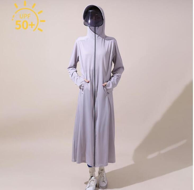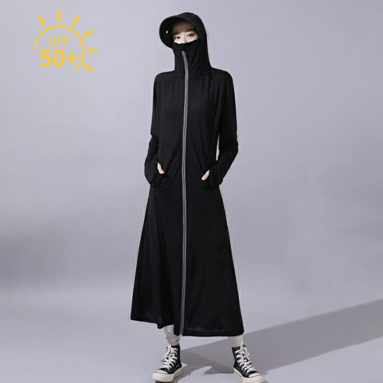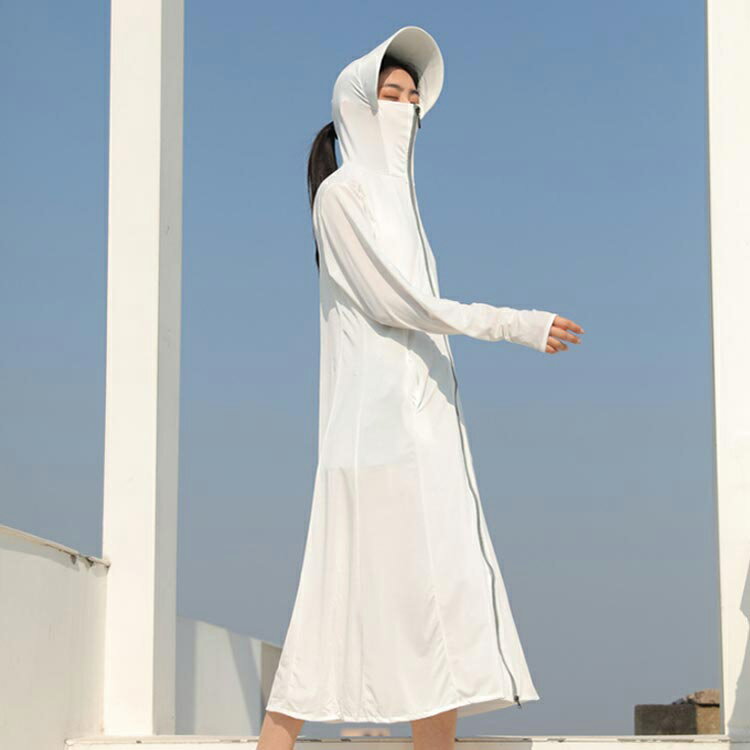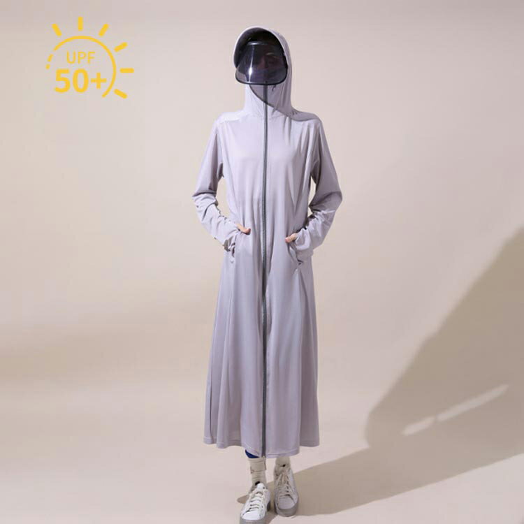 ラッシュガード ロング サンバイザー UVカット 接触冷感 パーカー 指穴 長袖 フード ロング丈 大きいサイズ UV ラッシュパーカー 首元 UPF50+ ひんやり 薄手 ロング 夏 パーカー ジップアップ 日焼け止め 体型カバー 360度紫外線対策 ストレッチ 吸水速乾