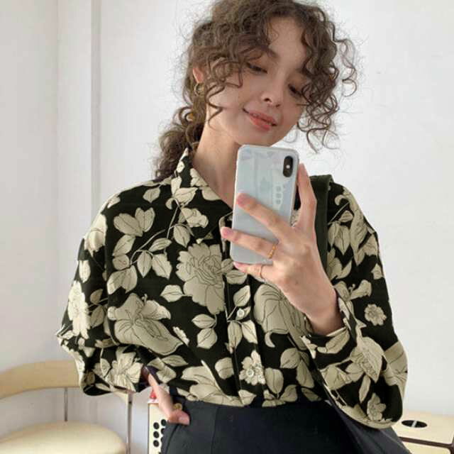 アロハシャツ バラ 総柄 レトロ ブラウス ゆったり 落ち感 抜け感 韓国風 レディース ローズ シフォン シャツ 大人 きれいめ とろみ シースルー トップス 春 夏 秋 おしゃれ ブラック 黒 人気