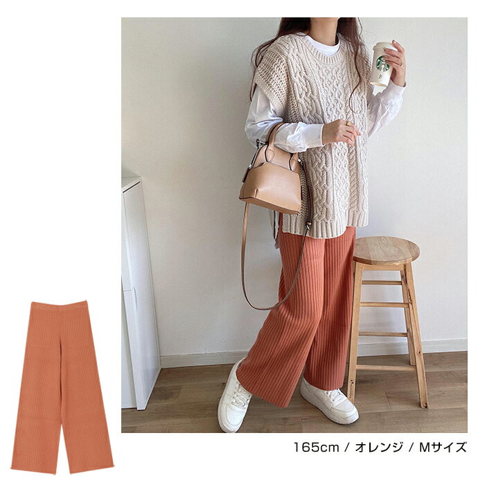【宅配便A】【一部予約】【送料無料】パンツ ワイドパンツ ニットパンツ ウエストゴム レディース リブニット ワイド ストレート リラックス レイヤード バックポケット スタイルアップ S/M/Lサイズ 春 秋 冬【メール便NG】