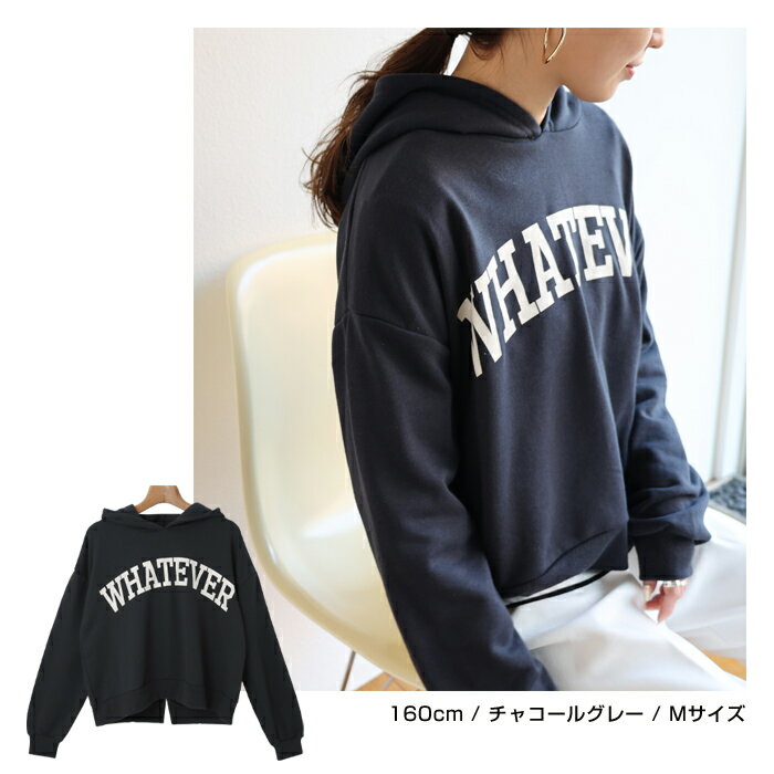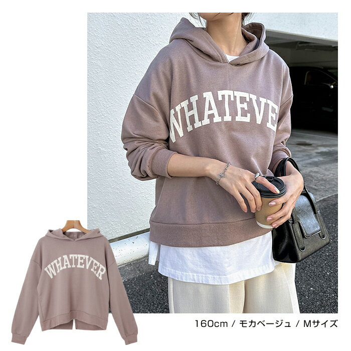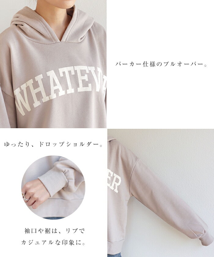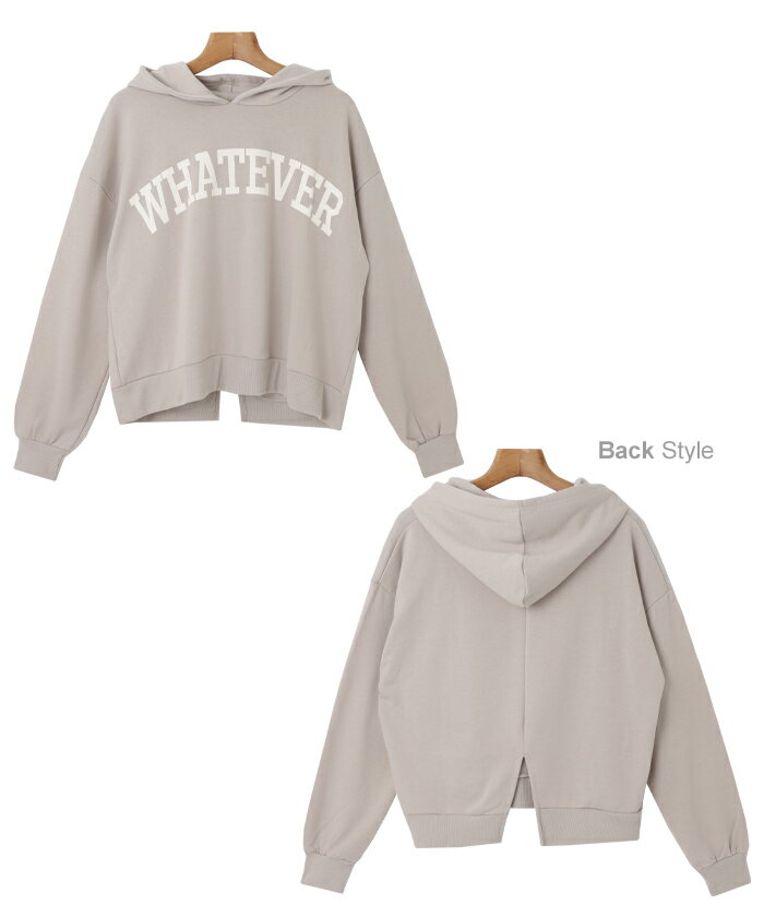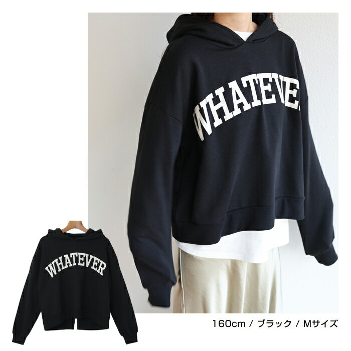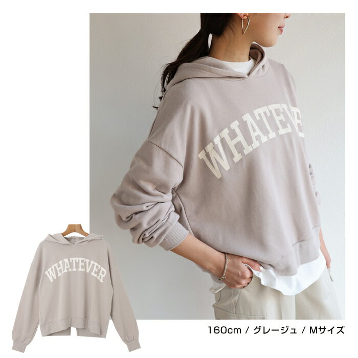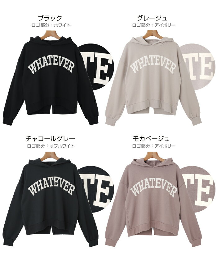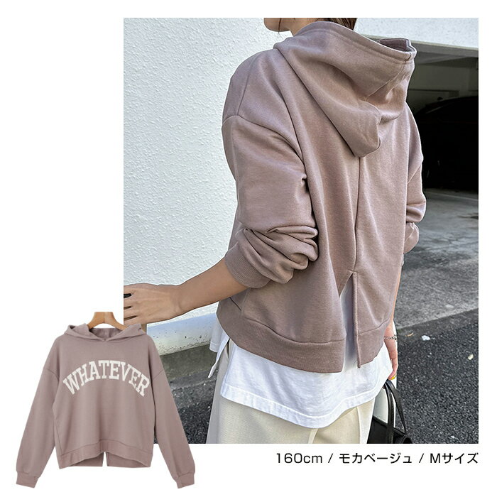 【宅配便A】whatever ロゴプリント バックスリット 裏毛 長袖 スウェット パーカー レディース トップス スウェットトップス フーディ トレーナー ロンT オーバーサイズ ゆったり ドロップショルダー ボリューム袖 カジュアル 春夏 秋冬 春 秋 冬【メール便NG】
