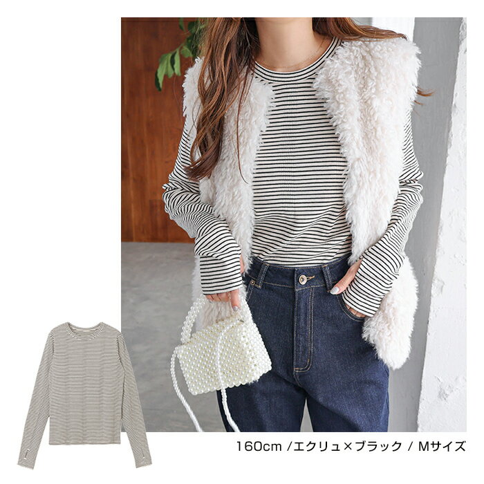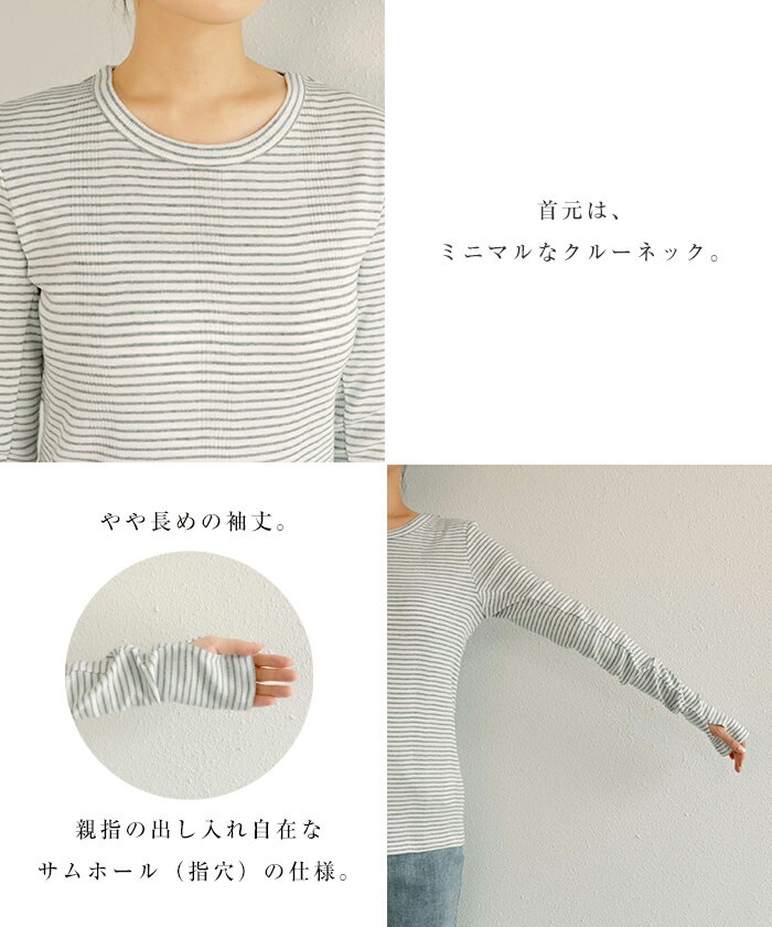【メール便対応C】ボーダー フライス クルーネック 指ぬき 長袖 トップス レディース 指穴 サムホール ベーシック カジュアル コットン 春 秋 冬