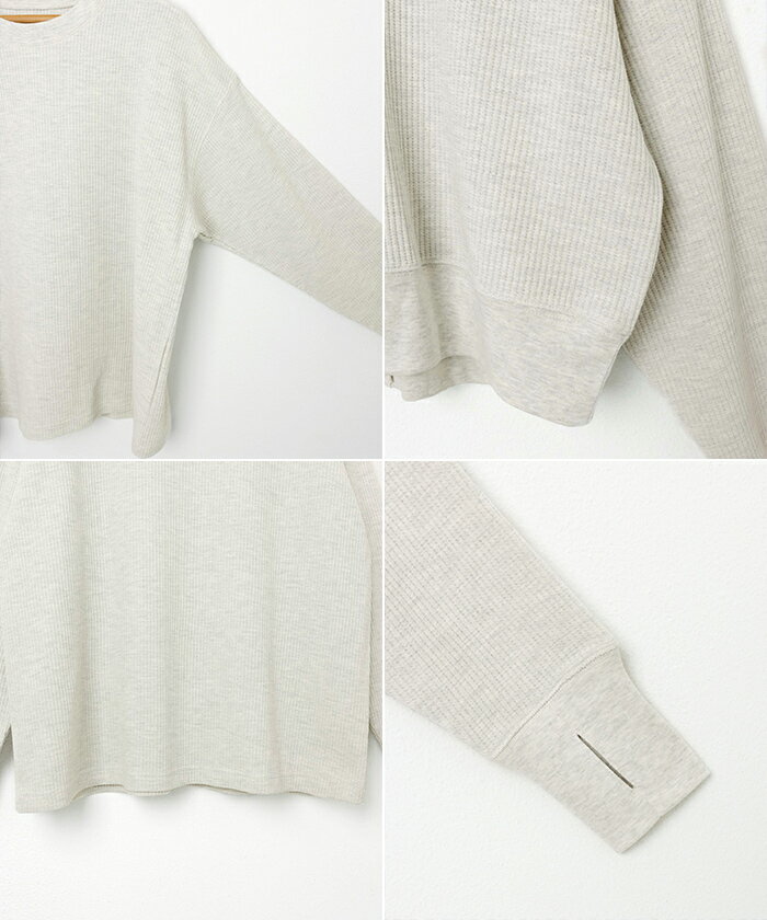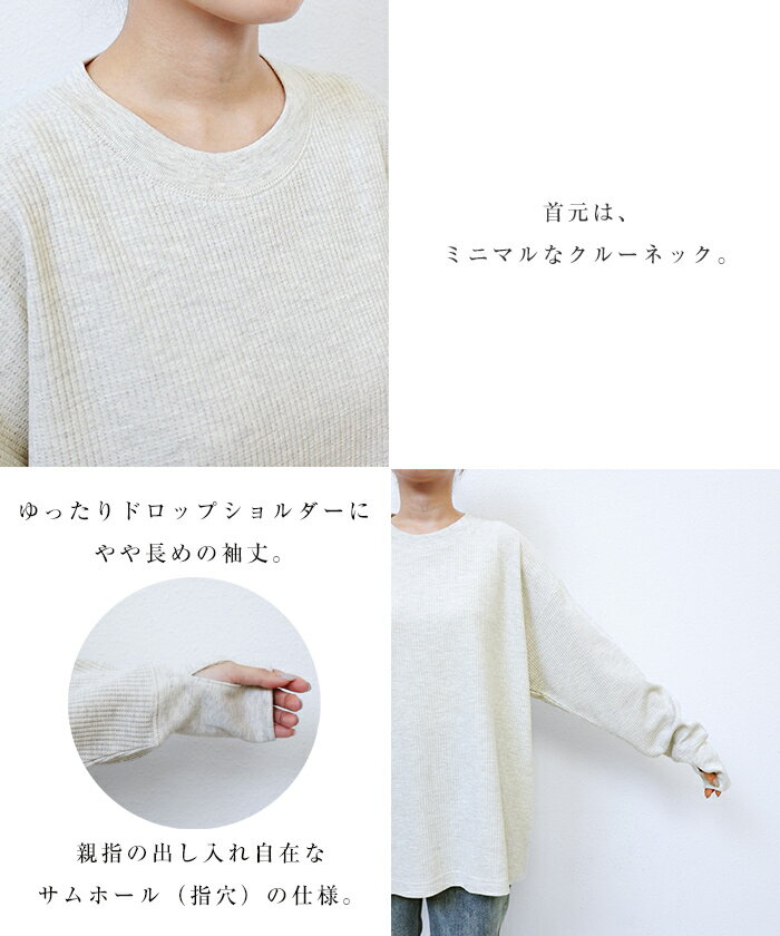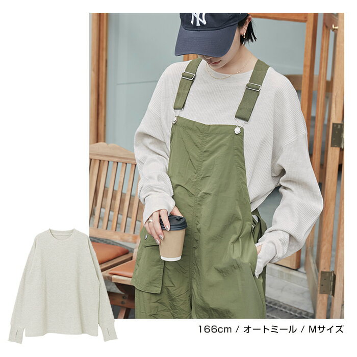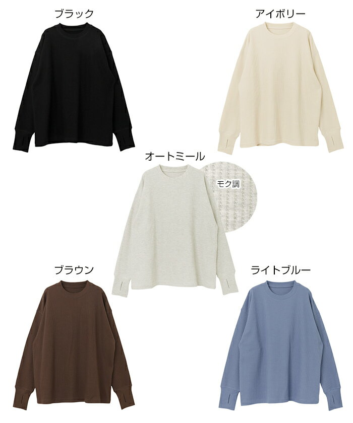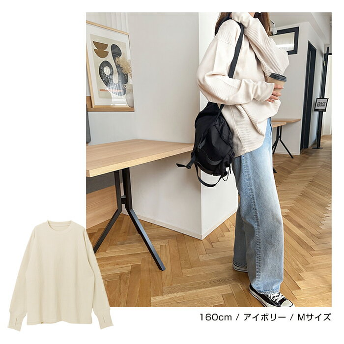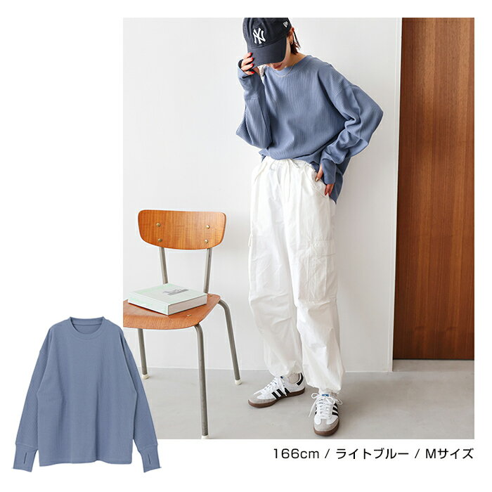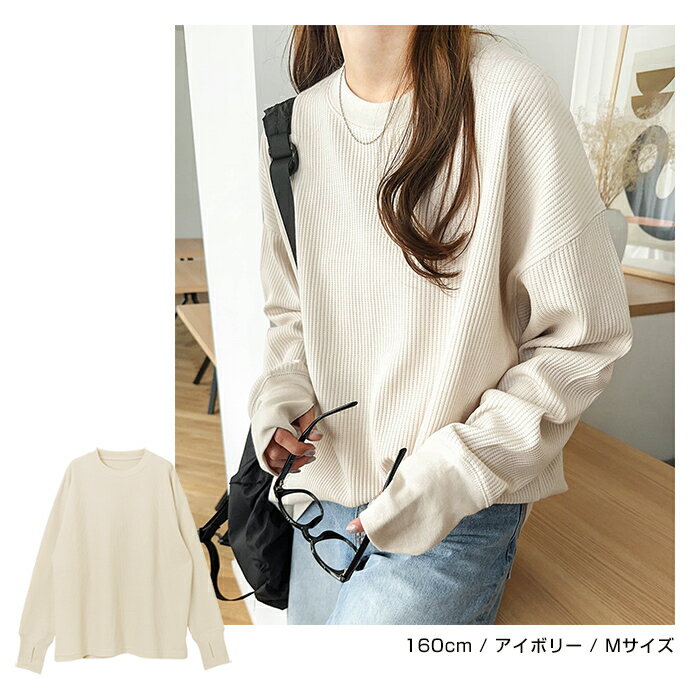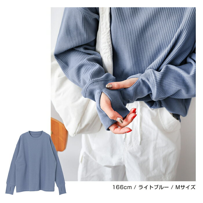 【宅配便A】ワッフル 指穴 サムホール 長袖 トップス レディース ドロップショルダー オーバーサイズ クルーネック 楽ちん ゆったり シンプル 無地 カジュアル 抜け感 春 秋 冬【メール便NG】