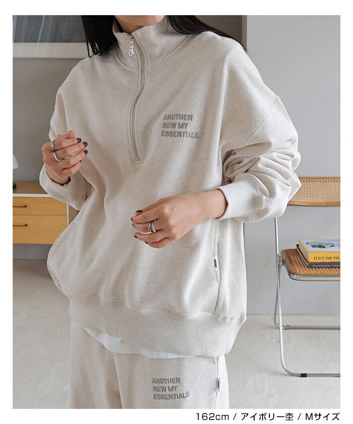 【宅配便A】【送料無料】ハーフジップ ロゴ 刺繍入り 裏毛 スウェット トップス レディース メンズ 男女兼用 ユニセックス ノームコア オーバーサイズ 体型カバー サイドポケット ヴィンテージライク カジュアル M/Lサイズ 春 秋 冬 ANME アンメ【メール便NG】