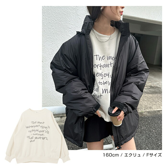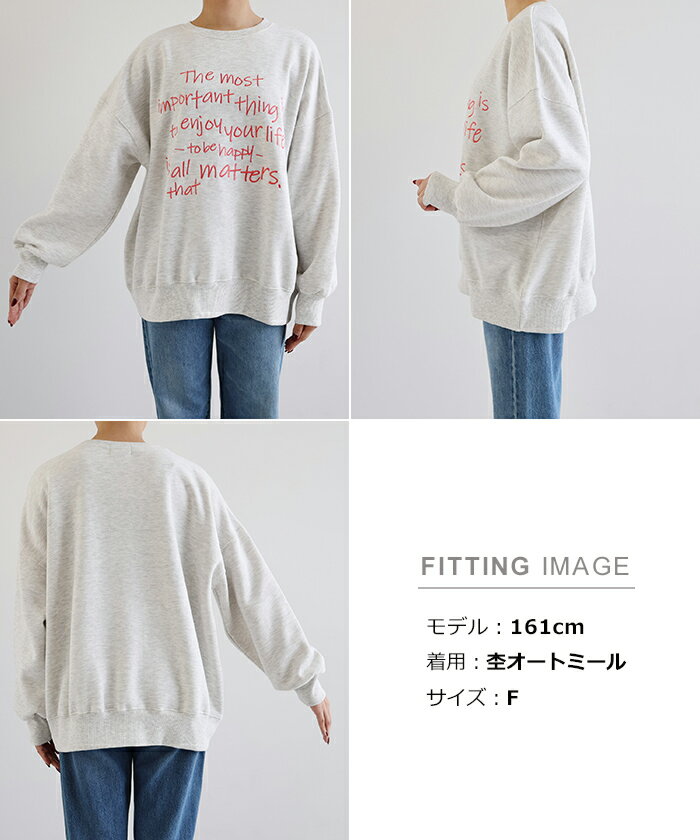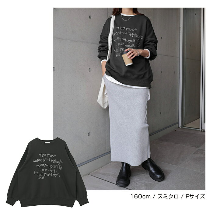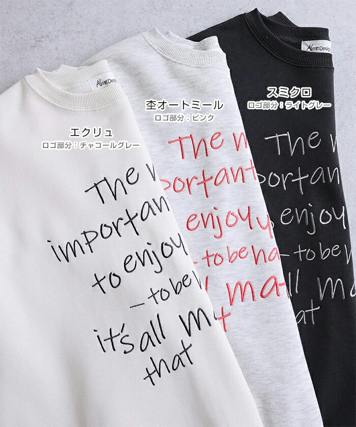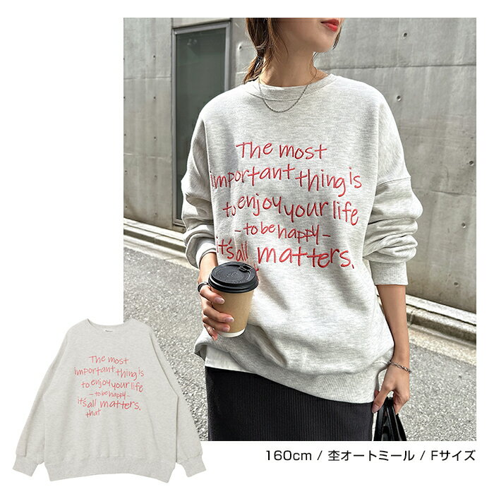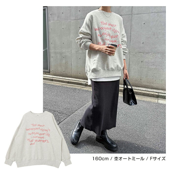 【宅配便A】【一部予約】【送料無料】裏起毛 ロゴ エンブロイダリー スウェット トップス レディース スウェットトップス トレーナー 長袖 プルオーバー オーバーサイズ 体型カバー ゆったり ミドル丈 ロゴ刺繍 カジュアル トレンド 防寒 暖か 秋冬 春 秋 冬【メール便NG】