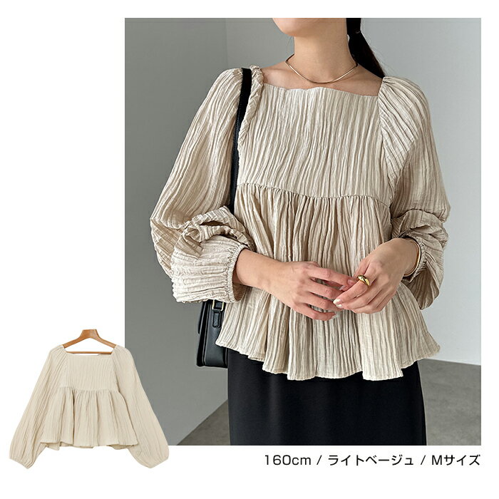 【メール便対応C】【送料無料】スクエアネック サテン ペプラム ブラウス レディース トップス シャツブラウス ペプラムトップス ボリューム袖 体型カバー 二の腕カバー シアー フレア Aライン 長袖 きれいめ 上品 トレンド セレモニー オフィス 春夏 秋冬 春 夏 秋 冬