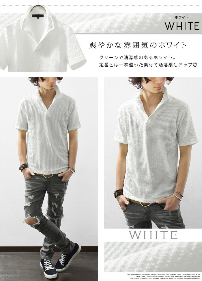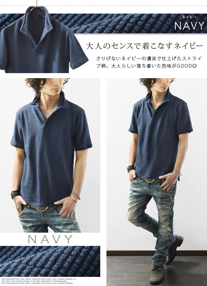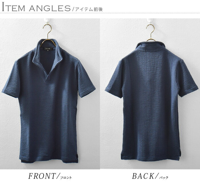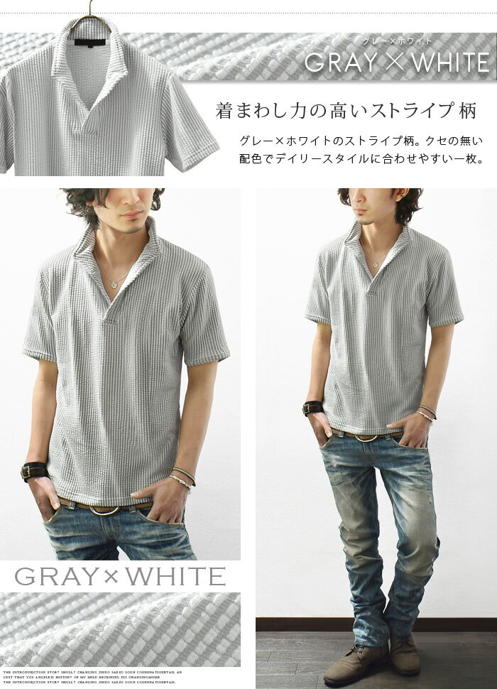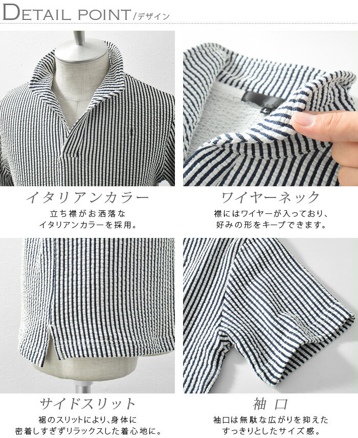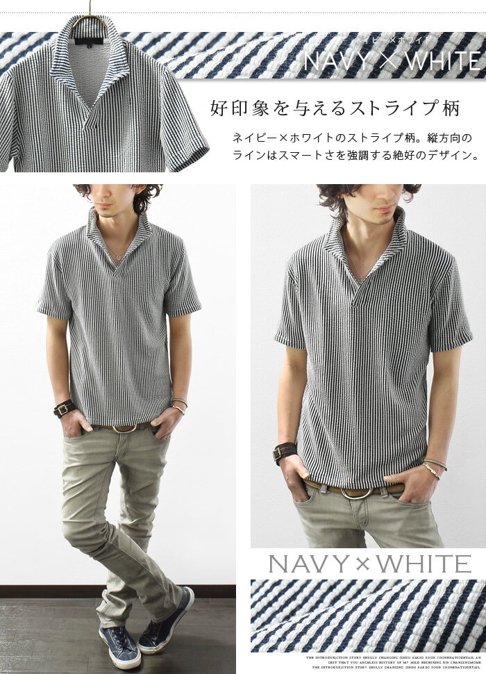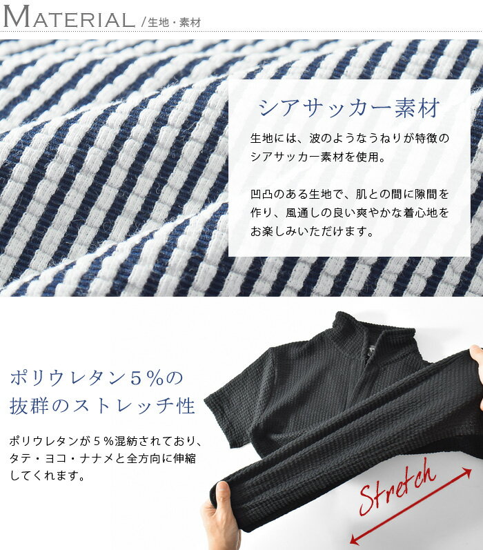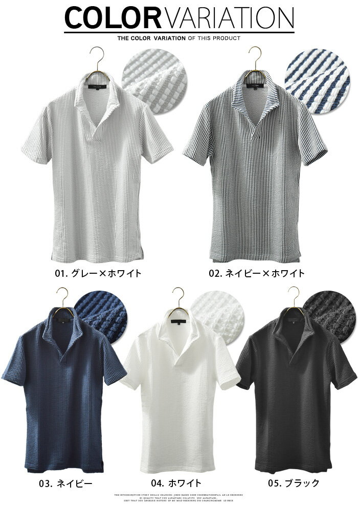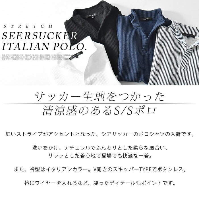 ポロシャツ メンズ シャツ 半袖 半そで シアサッカー 生地 ストライプ 無地 スリム ショート丈 スキッパー カジュアル 夏 夏服