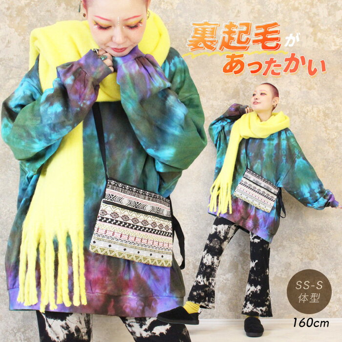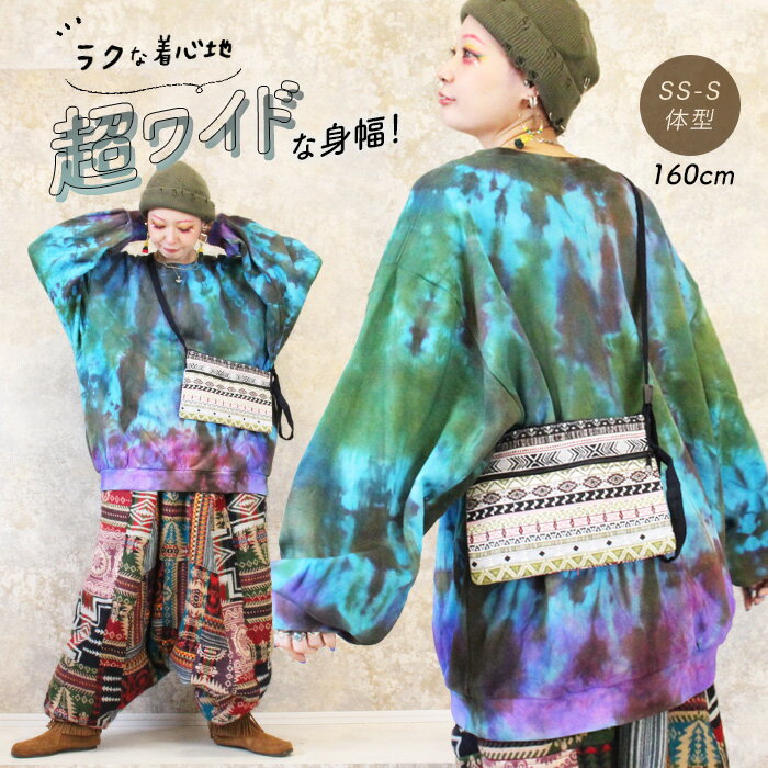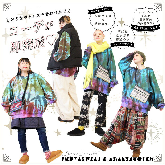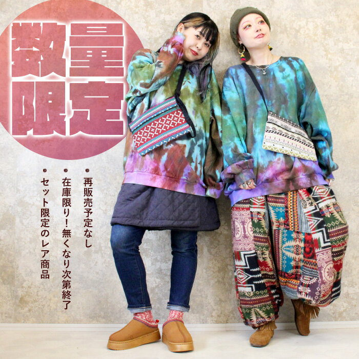 エスニック コーデセット 2点セット レディース タイダイ染め 裏起毛 トレーナー 暖かい あったかい スウェット 秋冬 ショルダーバッグ ボディバッグ お得 ゆったり 大きいサイズ 体型カバー 非売品 中身の見える福袋 ゴア *00
