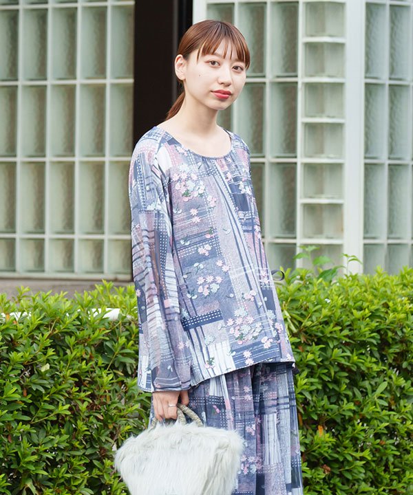 【お買い物マラソンP5倍】as know as すけたりちがったりPO レディース トップス カットソー 長袖 プルオーバー プルオーバー 透け感 シアー リボン ギャザー タック スリット プリント 花柄 おしゃれ かわいい カジュアル 上品 華やか トレンド ドゥバズ