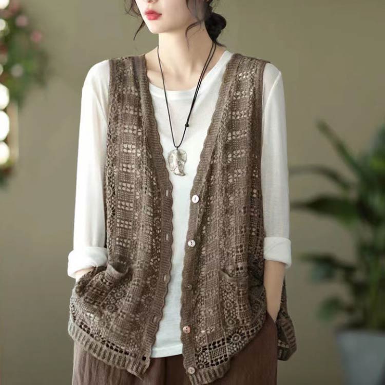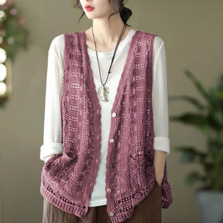 レディース ジレ ベスト トップス 透かし編み ノースリーブ 重ね着 レイヤード 前開き 薄手 春夏 ショート丈 カジュアル 編み トップス 総柄 透かし彫り 通勤 OL 可愛い 大きいサイズ カジュアル