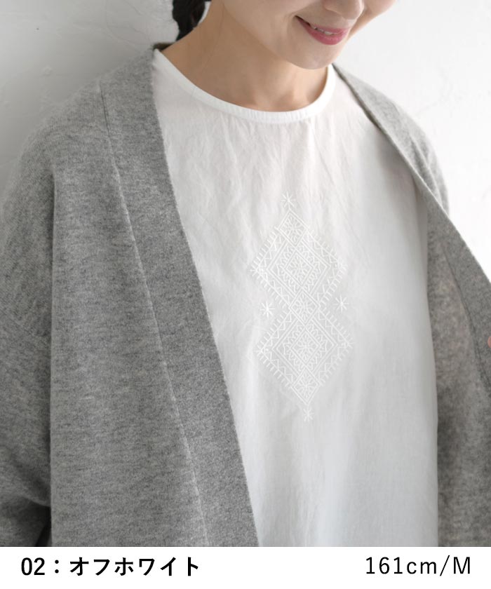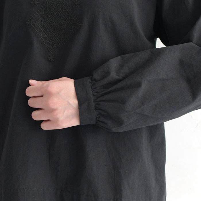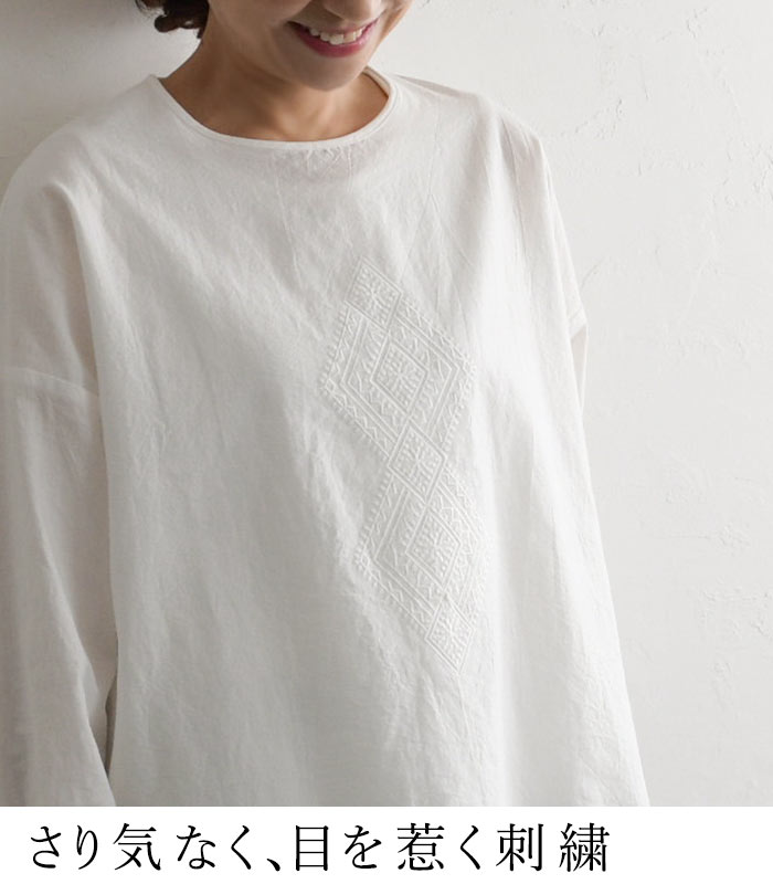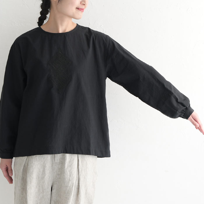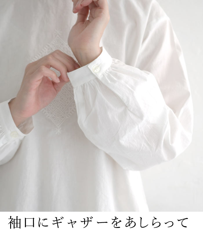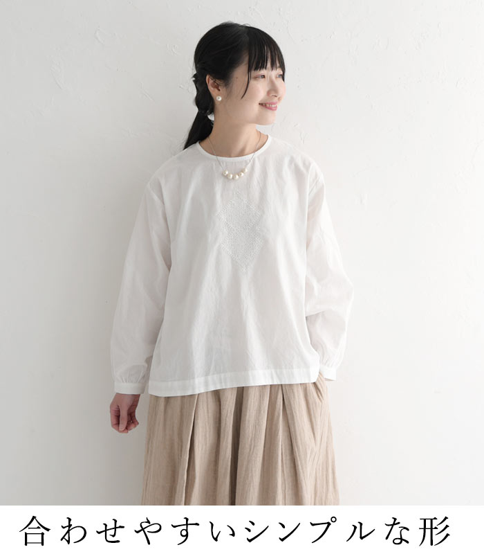 【メール便送料無料】M〜3L オリジナル コットン 詰まり首 刺繍ブラウス シャツ 綿100%/着後レビューでクーポン☆ カジュアル ナチュラル お出かけ 入学式 卒業式 長袖 トップス 体型カバー 大きいサイズ レディース エコロコ e+, Ms,Ls,LL,3L/春夏 秋冬 24AW1204R,