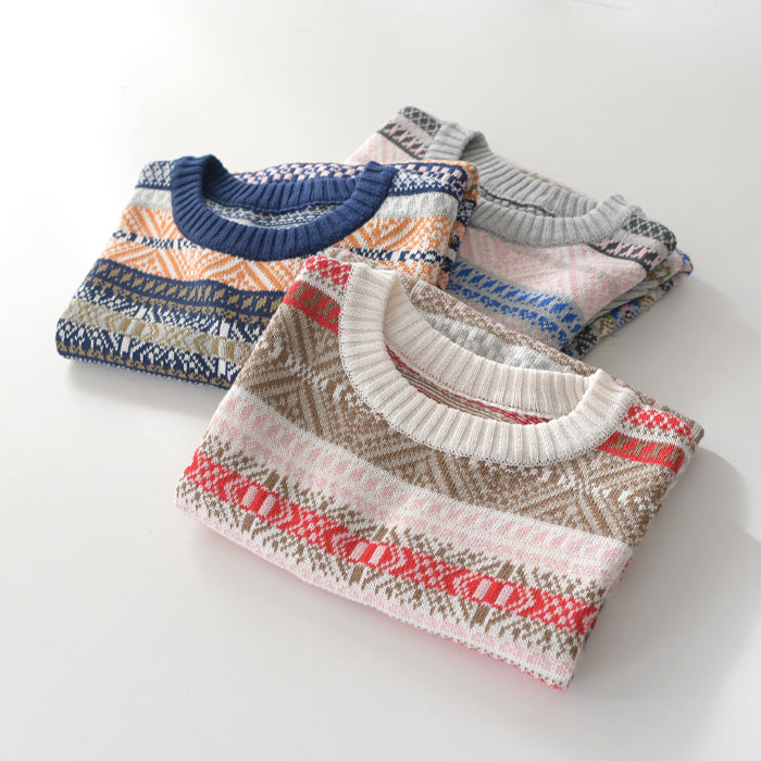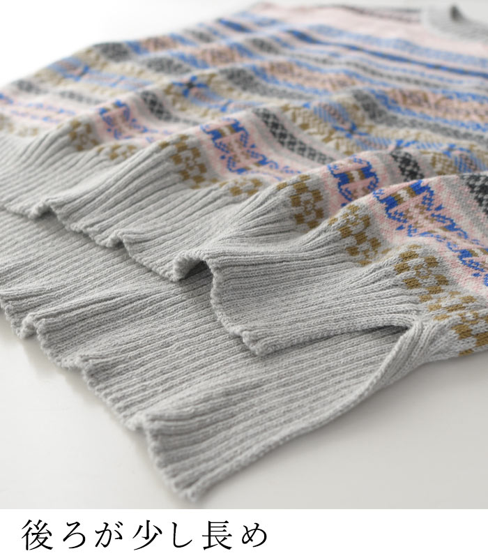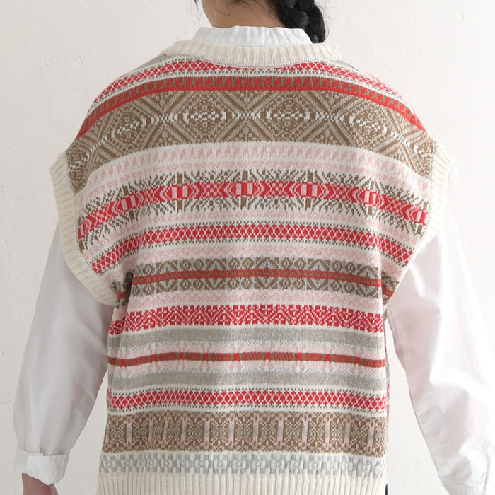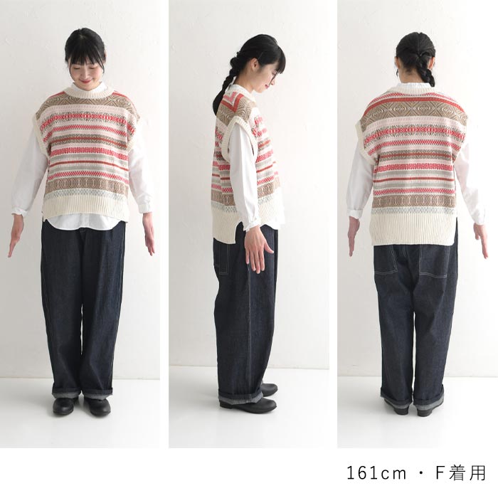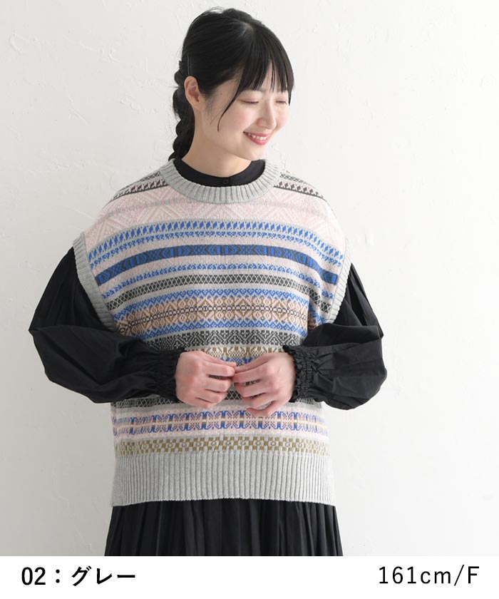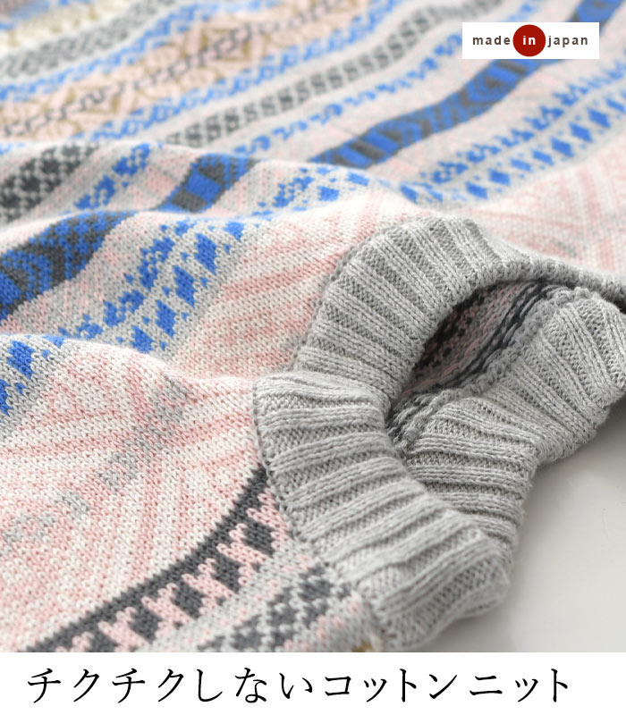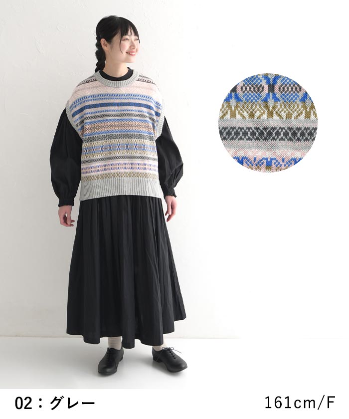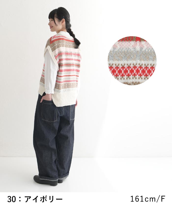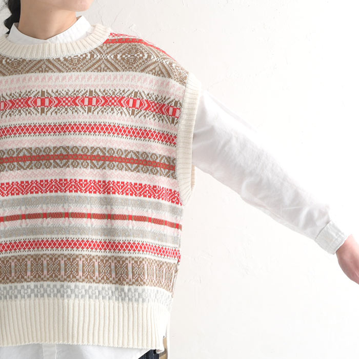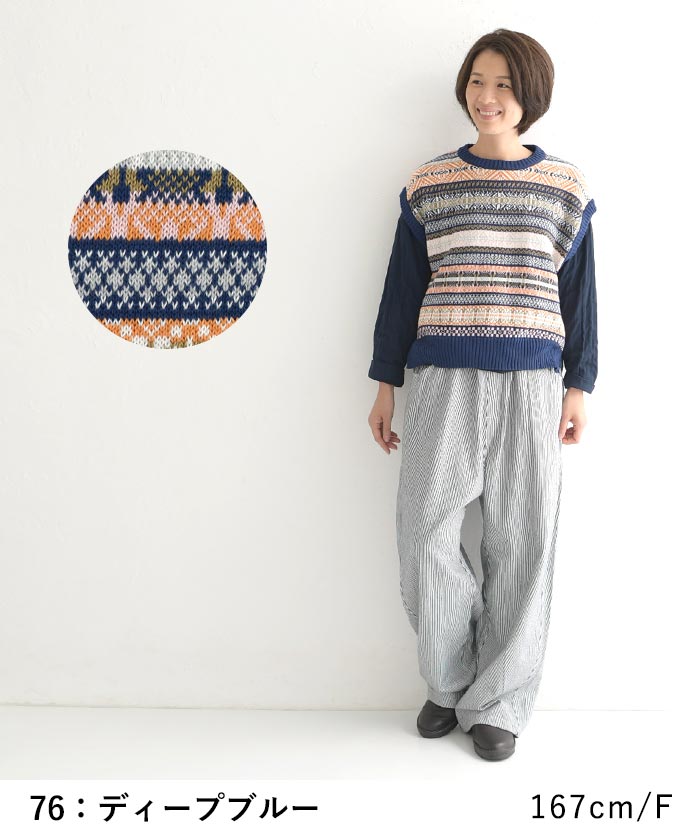 【半額タイムセール】 日本製 NARU コットン ニットベスト フェアアイル柄 クルーネック 綿100%/ カジュアル ナチュラル ナル チョッキ ゆったり 重ね着 体型カバー レディース エコロコ sel, Ms,Ls,/30代 40代 50代 春 夏 秋 23AW0126,