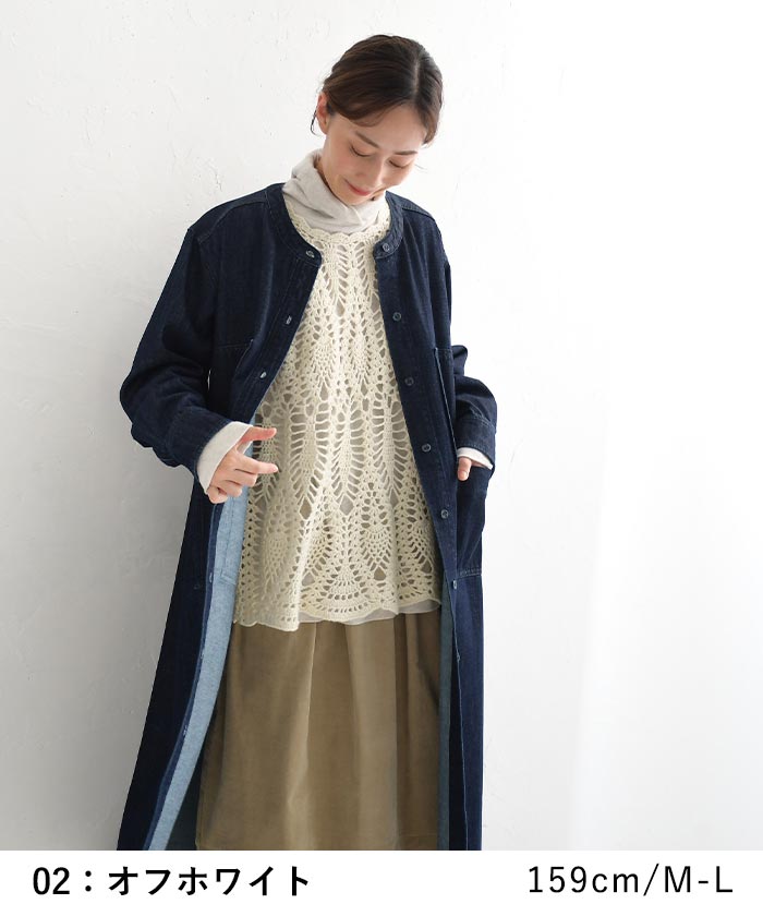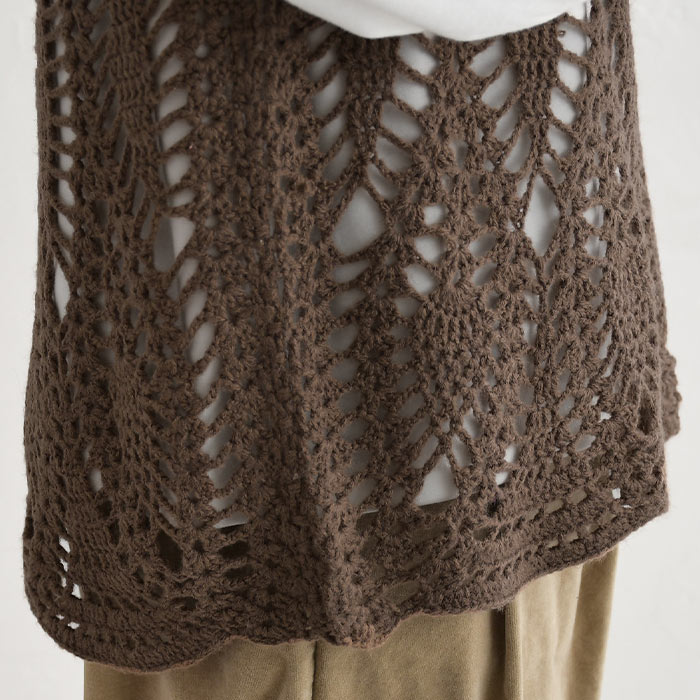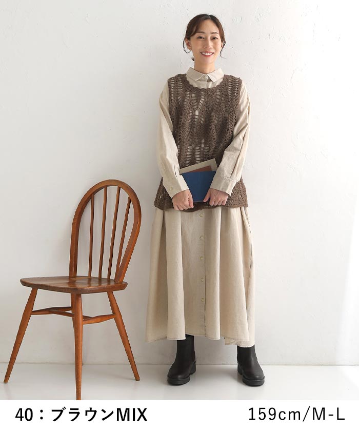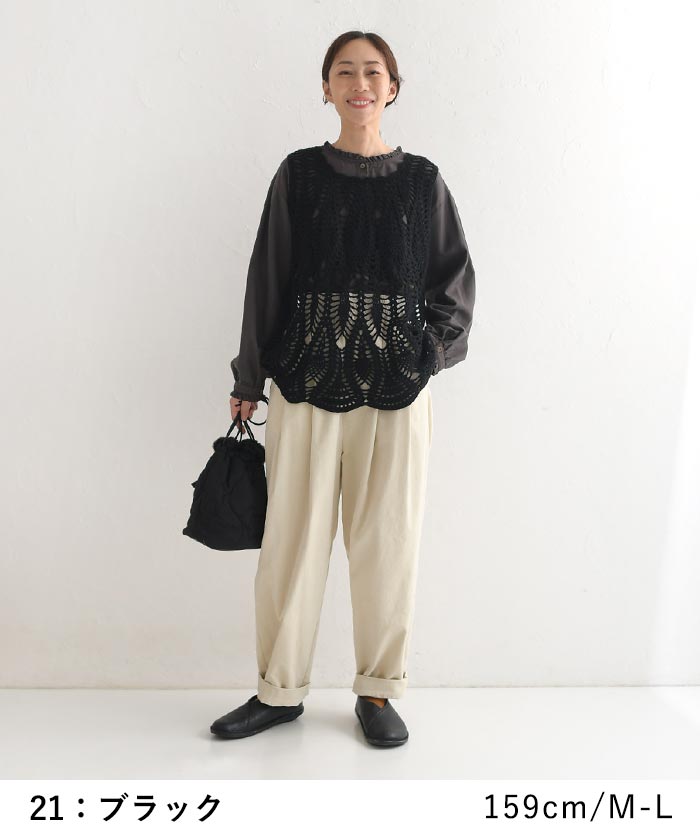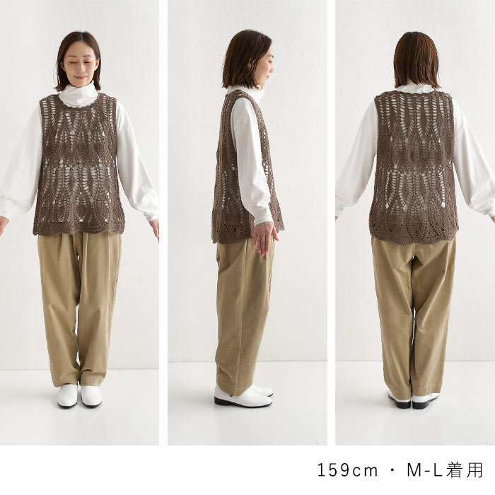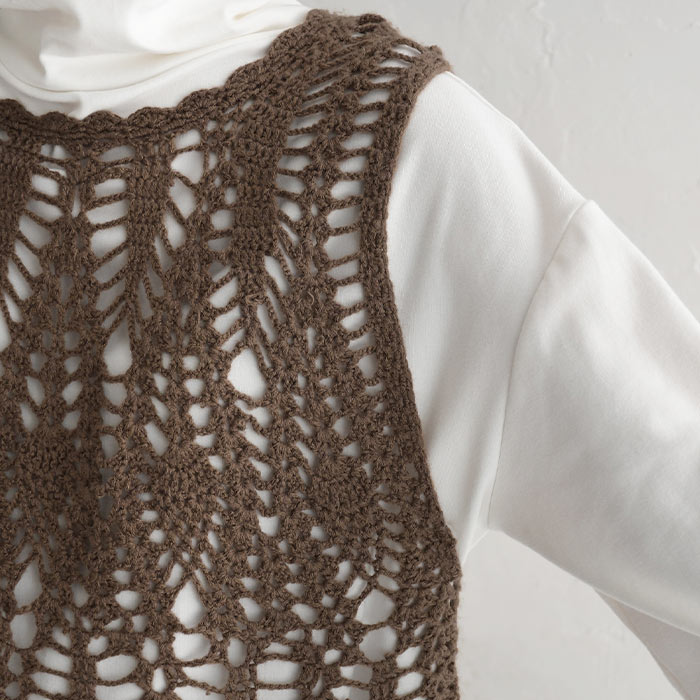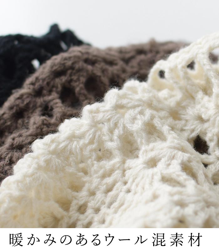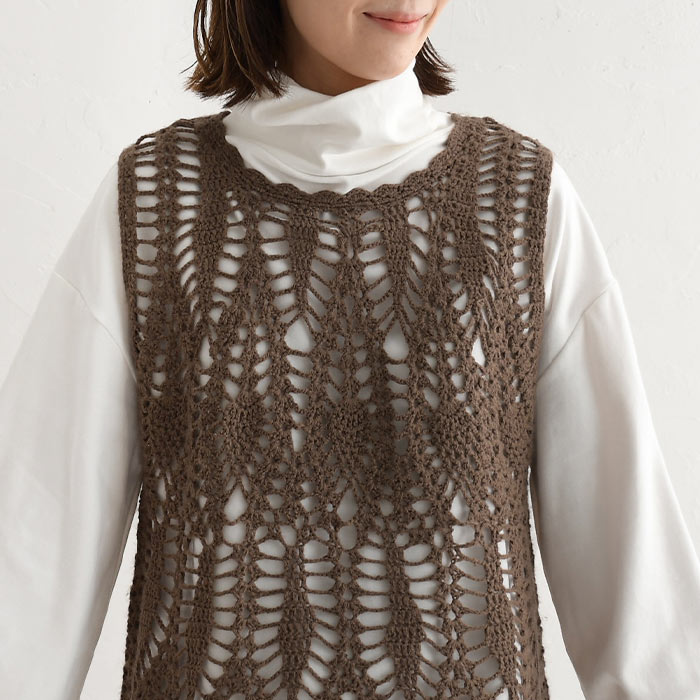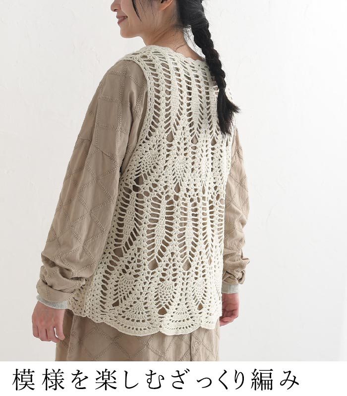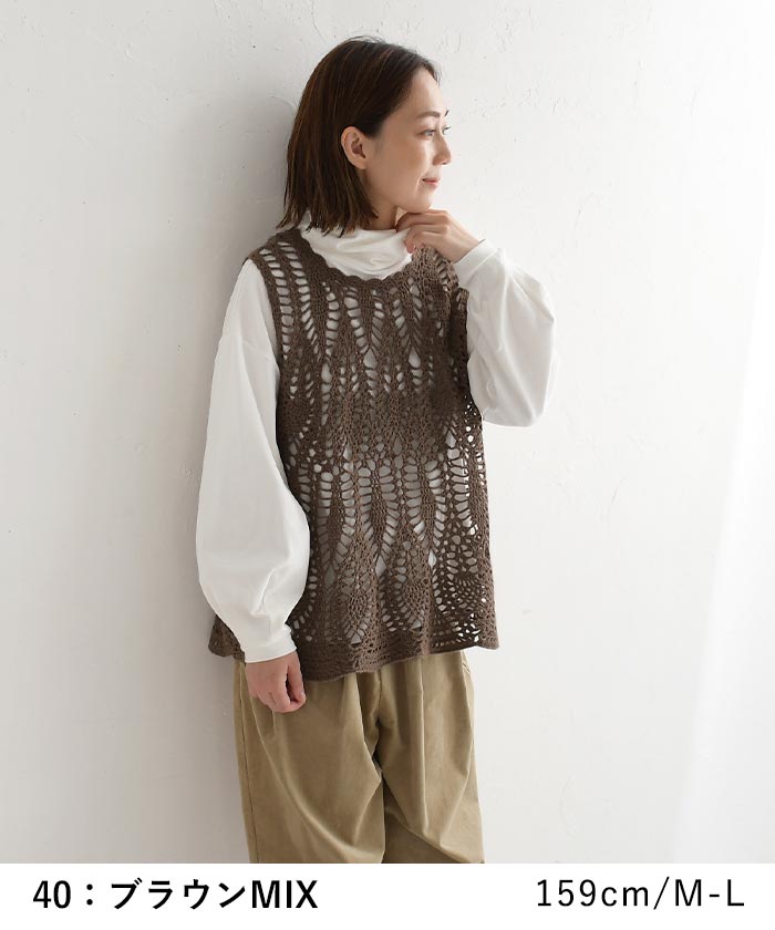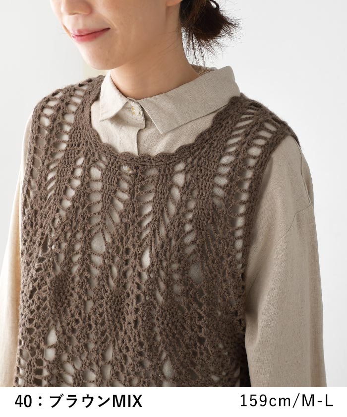 M〜3L ウール混 かぎ編みベスト ジレ レディース 重ね着 手編み 透かし編み/ 着後レビューでクーポン☆ カジュアル ナチュラル プルオーバー 体型カバー ゆったり トップス おしゃれ 大人可愛い エコロコ オリジナル e+, Ms, Ls, LL, 3L,/ 大きいサイズ 秋冬 24AW1004,