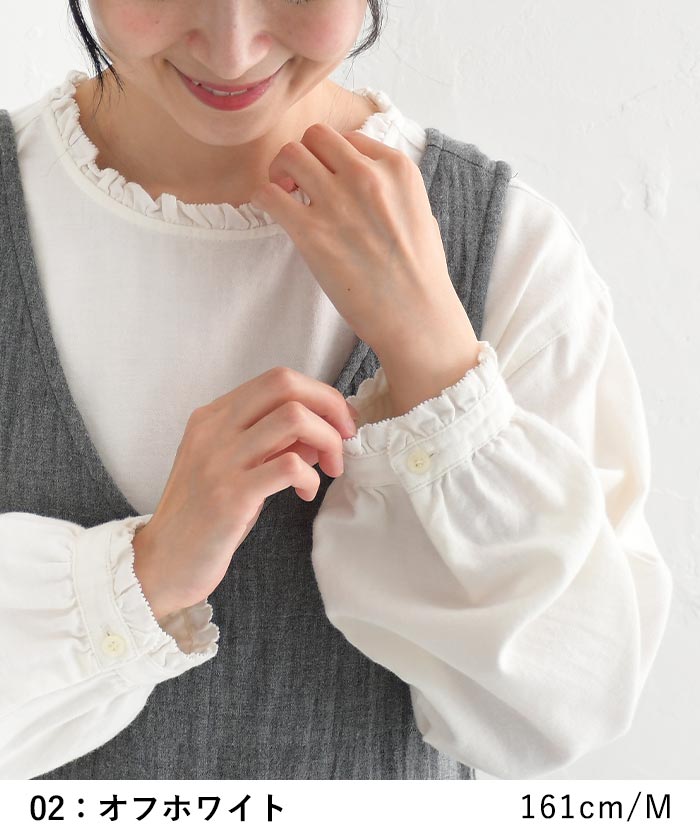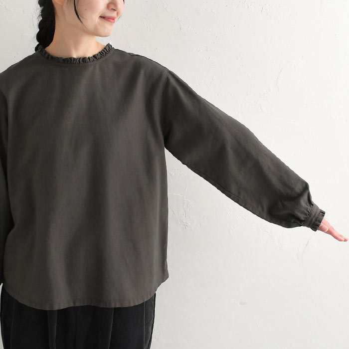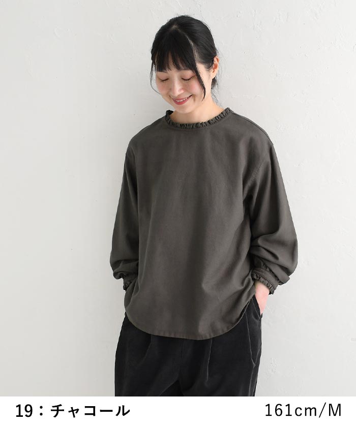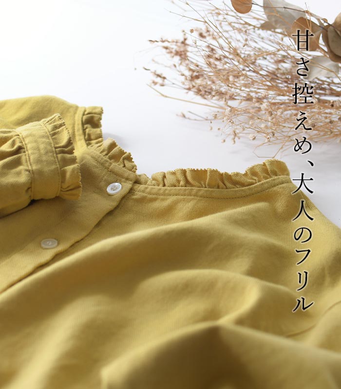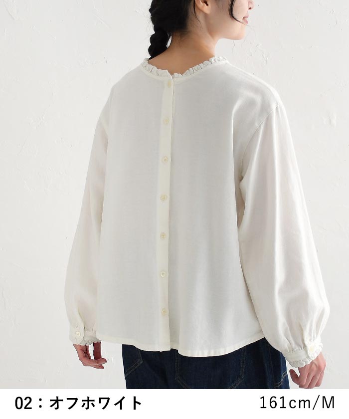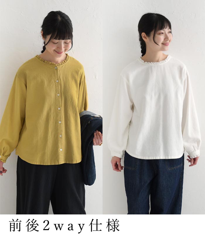 【メール便送料無料】 M〜3L フリル襟 前後2way ブラウス シャツ 長袖 レディース 綿麻 ウール/ 着後レビューでクーポン☆ カジュアル ナチュラル 体型カバー ストレッチ トップス おしゃれ 無地 エコロコ オリジナル e+, Ms, Ls, LL, 3L,/ 大きいサイズ 24AW1004,