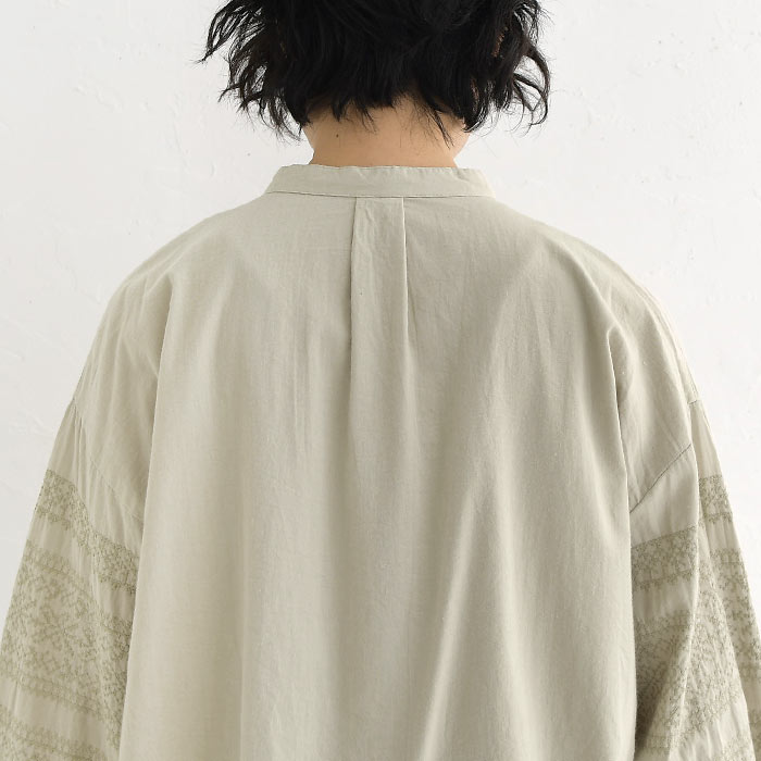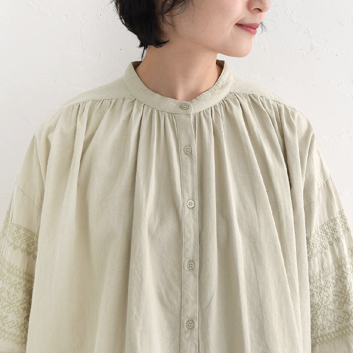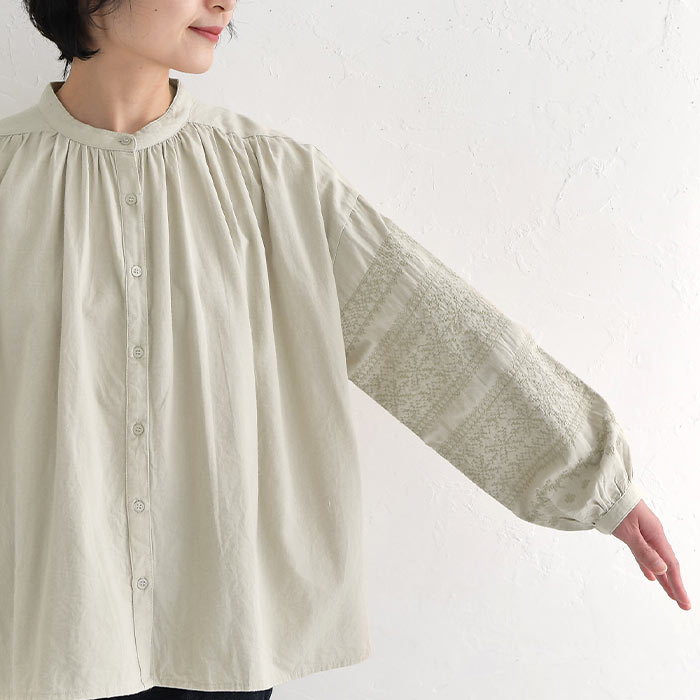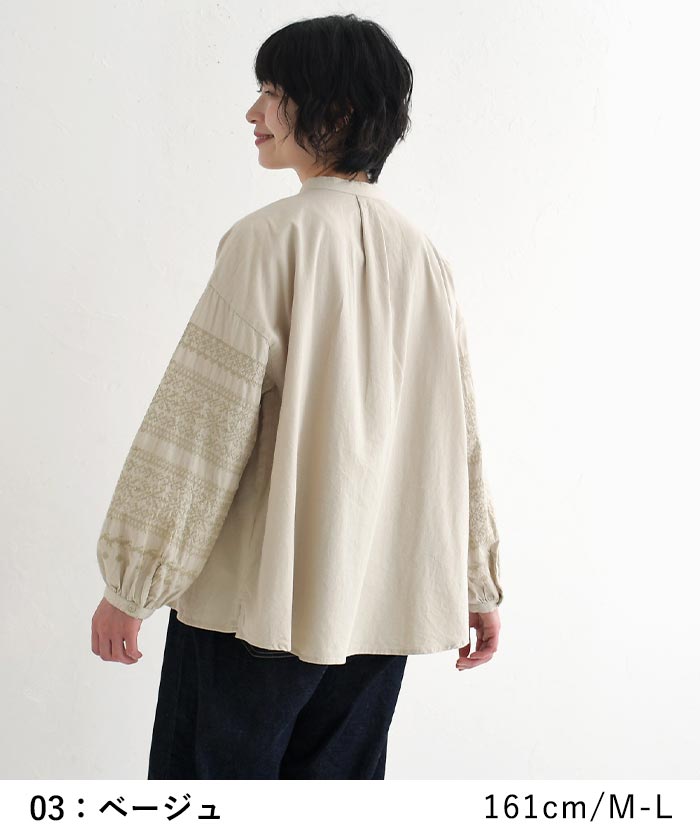起毛 スタンドカラーブラウス シャツ 長袖 レディース 綿100% 袖 刺繍 綿100%/ カジュアル ナチュラル ワイド ふんわり トップス おしゃれ 大人可愛い エコロコ sel, Ms, Ls, 30代 40代 50代/ 秋冬 24AW1227,
